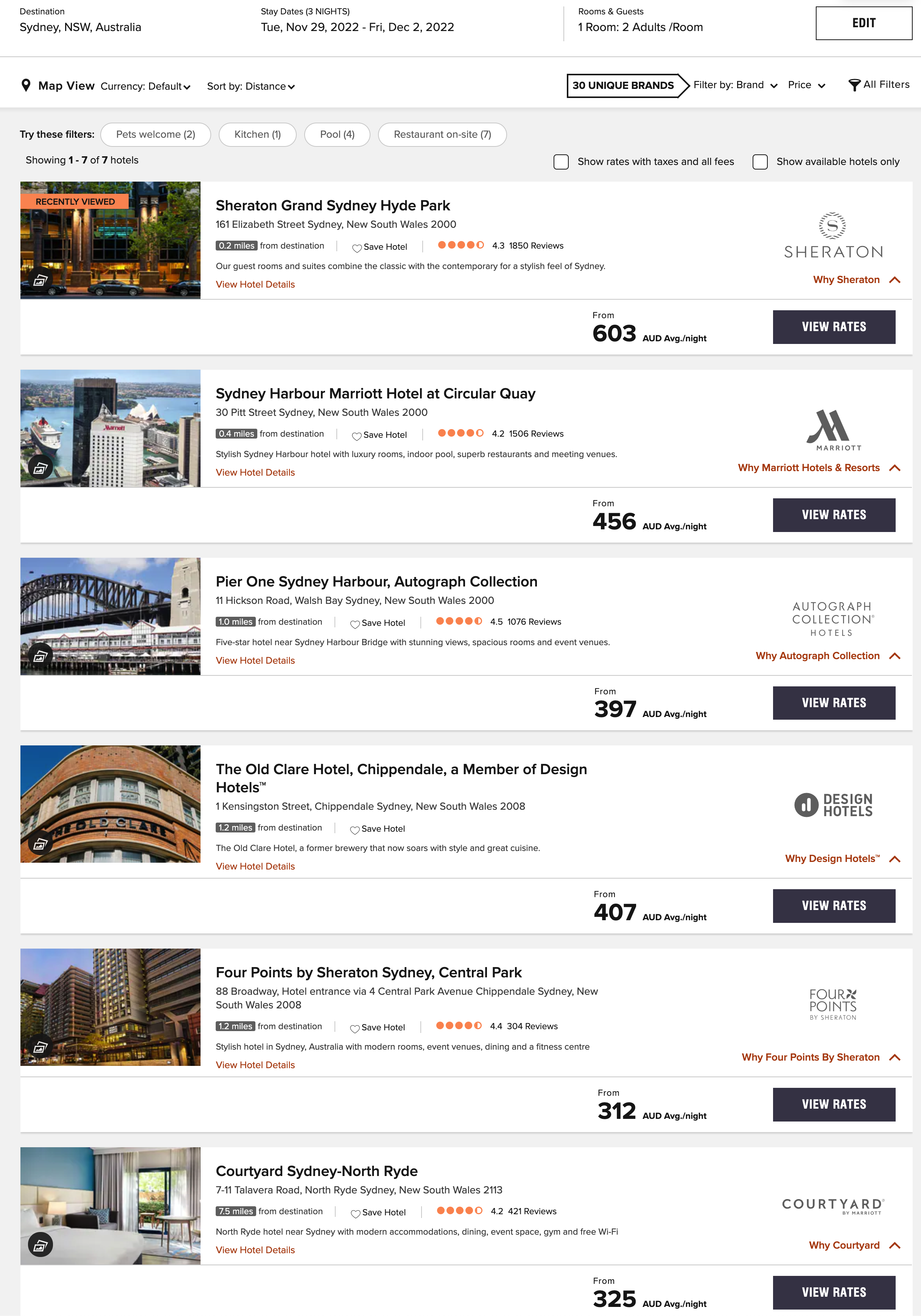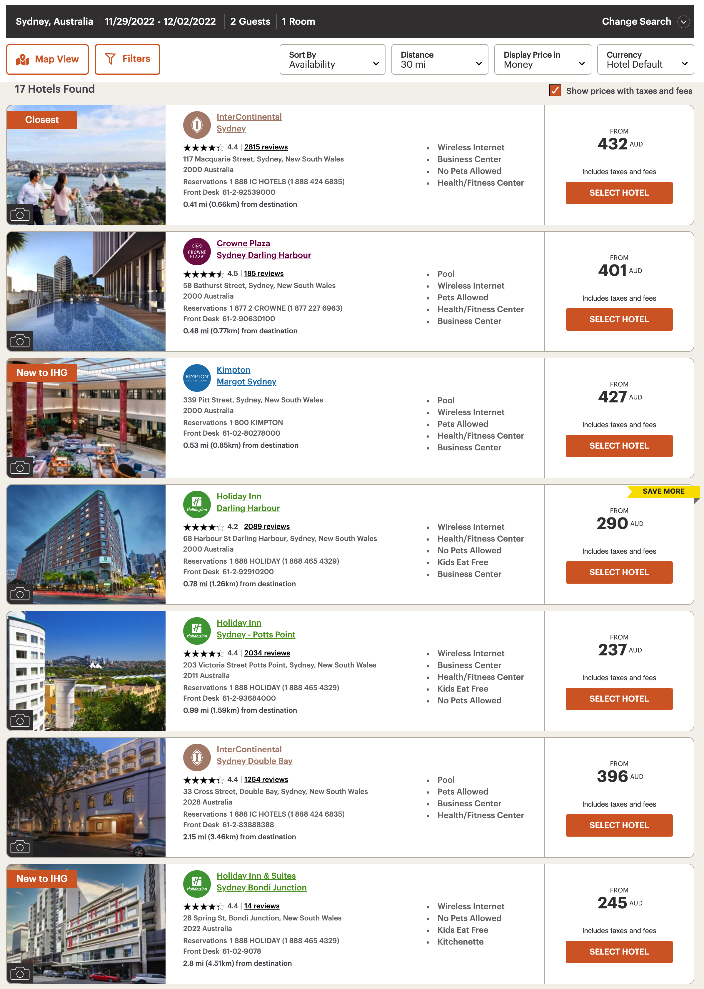 시드니는 호주뿐만 아니라 오세아니아 대륙 전체에서 가장 큰 도시입니다. 이 말은 호텔이 엄청 많다는 뜻입니다. 작정하고 찾아보면 괜찮은 가격에 나쁘지 않은 호텔들이 있겠지만, 조금은 귀찮아진 관계로 IHG 계열과 메리어트 계열 호텔들을 찾아봅니다. 시드니에서는 다운타운 내에서 호텔을 잡고 싶었습니다. 그중에서도 가장 눈여겨본 부분은 Circular Quay, Hyde Park 부근입니다. 시드니에서 두 호텔 체인의 가격 범위는 1박에 대략 300 ~ 600 호주 달러 사이입니다. 꽤나 비싸기 때문에 시드니에서도 숙박권을 써야겠다는 마음을 먹고 메리어트 계열 위주로 더 찾아봅니다.