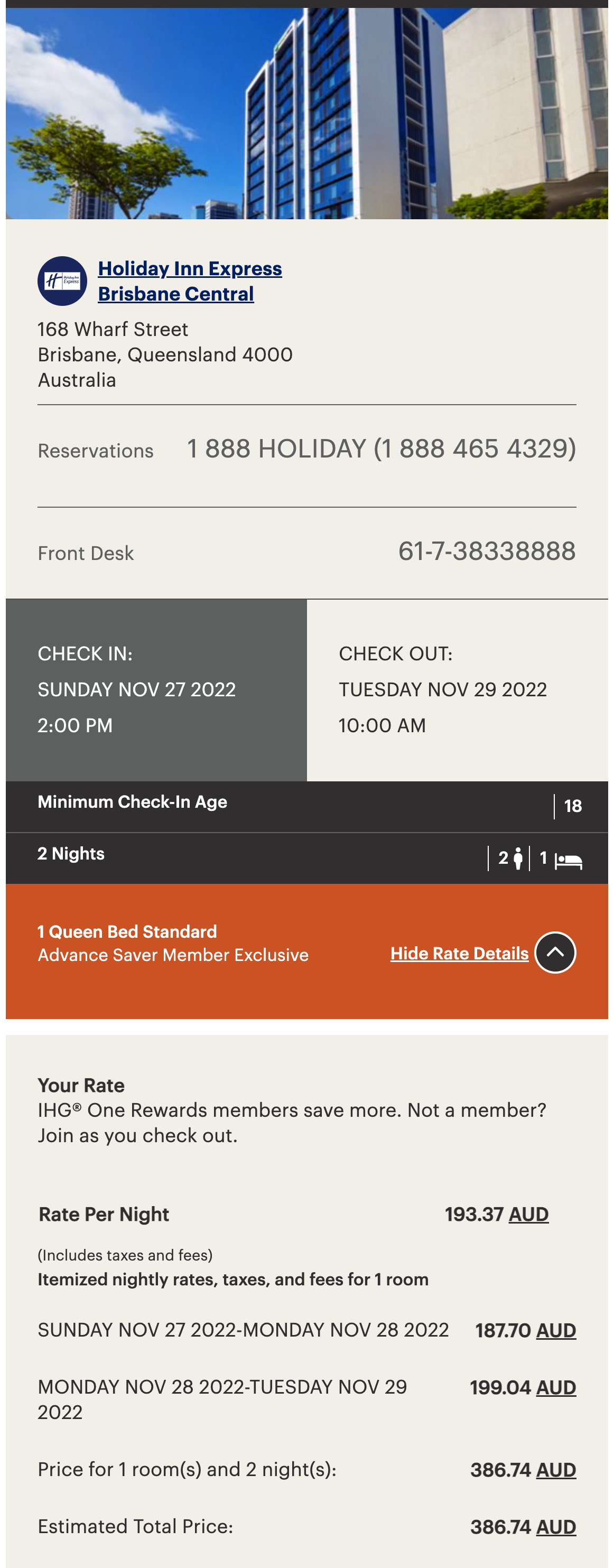 브리즈번은 골드코스트보다 큰 도시이기에 고려해야 할 사항이 많아서 복잡할 수도 있지만, 또 한편으로는 도시에 있는 호텔들은 최상급 호텔이 아니면 고만고만한 경우가 많기 때문에 가격과 장소만 보고 너무 평이 낮지 않은 호텔을 골라도 실패하지 않는 경우가 많습니다. 브리즈번에는 메리어트 계열 호텔이 5개, IHG계열 호텔이 4개가 있고 대략 200~400 호주달러 선에서 가격이 형성되어 있습니다. IHG계열 호텔 중 두 곳(Hotel Indigo Brisbane City Centre, voco Brisbane City Centre)은 오픈한 지 얼마 안 된 느낌이지만 평점이 딱 4.0인 바람에 탈락. 메리어트 계열의 호텔 3곳(The Westin Brisbane, W Brisbane, Brisbane Marriott Hotel)은 1박에 300 호주달러가 넘어가서 탈락. 메리어트 계열인 Courtyard Brisbane South Bank는 강 남쪽에 있어서 탈락. 사실 브리즈번에 대해서 잘은 모르지만 호텔들이 죄다 강 북쪽에 있는 걸 보면 거기가 더 중심지 같아서 강 북쪽으로 고르기로 합니다. 결국 남은 호텔은 Four Points by Sheraton Brisbane과 Holiday Inn Express Brisbane Central인데, 홀리데이 인 익스프레스 브리즈번 센트럴이 더 싸기 때문에 여기로 결정합니다. 사실 미국 내에서 이동하면서 홀리데이 인에 많이 묵었기 때문에 뭔가 더 친근한 느낌도 있습니다.
