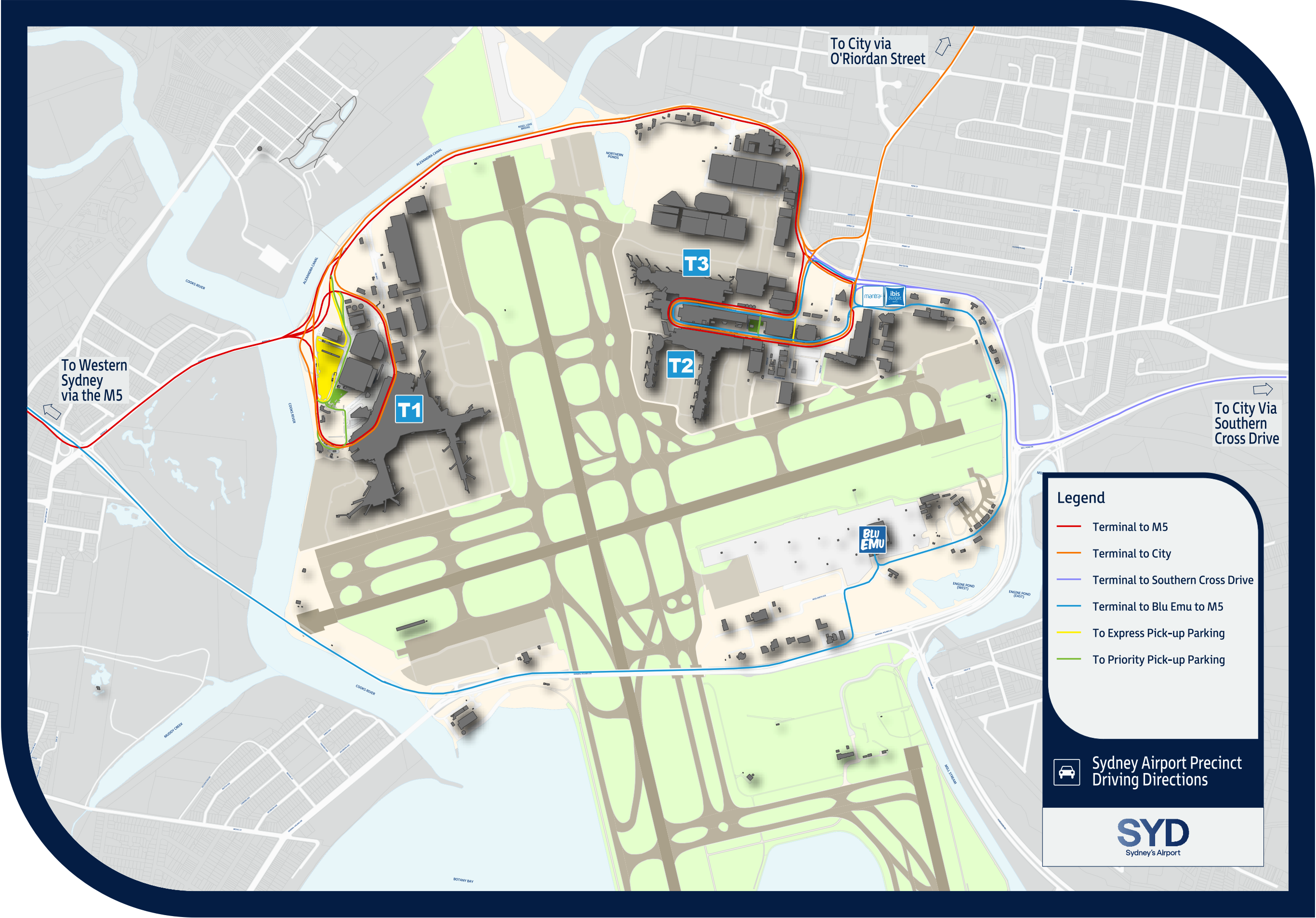 시드니 공항 지도. T1이 국제선 터미널, T2와 T3가 국내선 터미널 (c) sydneyairport.com.au