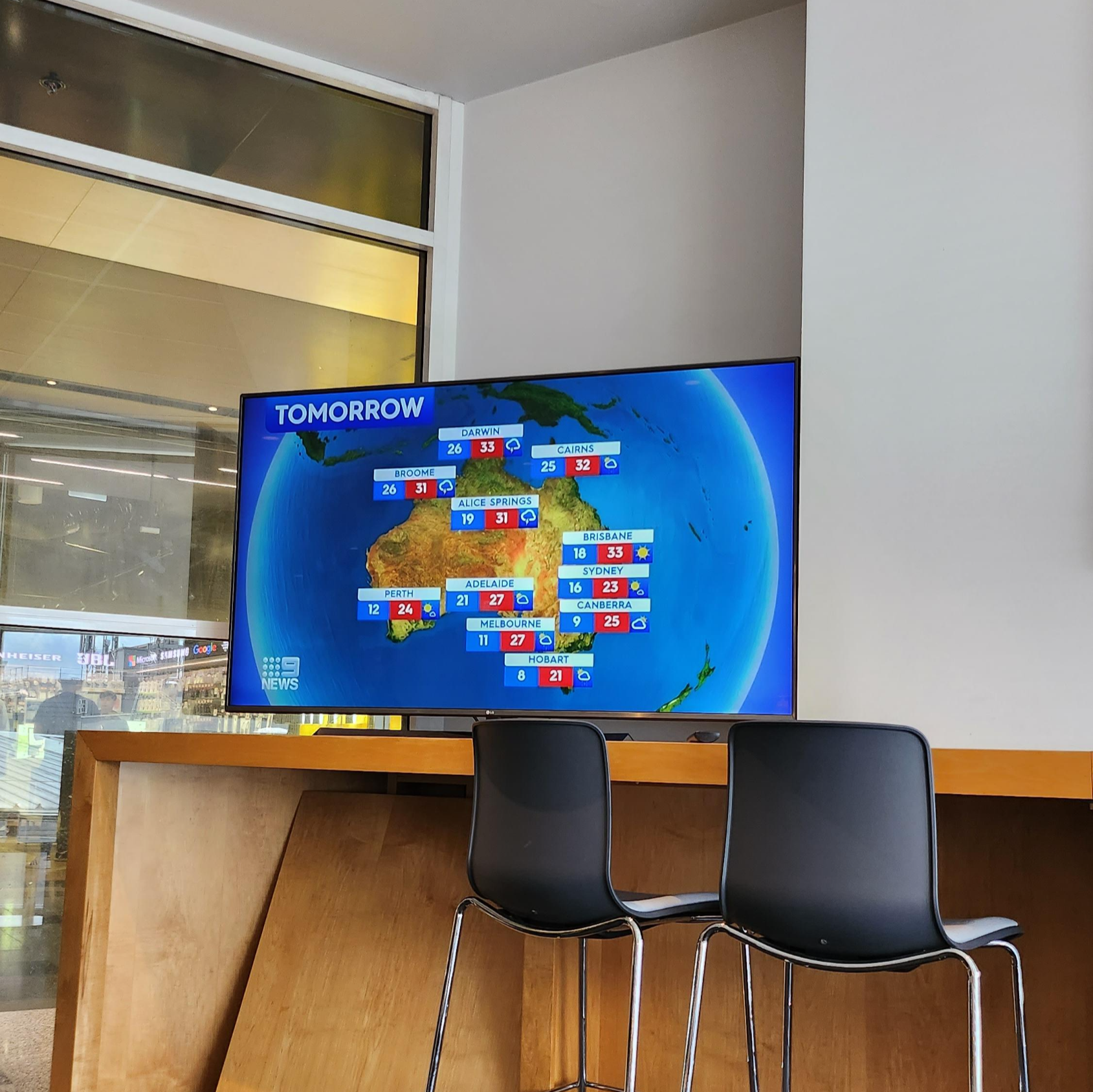 여행지에서 다른 나라에 도착했다는 사실을 깨닫는 방법은 아주 다양합니다. 하지만 호주에서 느꼈던, '여기가 호주구나'라는 느낌은 조금은 새로웠습니다. 국내선 터미널로 이동해 PP카드로 터미널 내에 있는 Rex라운지에 들어갔습니다. Rex라운지는 Rex(Regional Express)라는 호주 항공사에서 운영하는 작은 라운지로 시드니 국내선 터미널인 T2, T3를 통틀어 PP카드로 들어갈 수 있는 라운지입니다. 라운지에서 간단하게 커피를 마시다 뉴스에서 하고 있던 기상예보에 눈이 갔습니다. 가장 먼저 들었던 생각은, 저게 섬이 아니라 대륙이라니. 진짜 호주는 어마어마하게 크다는 점이었습니다. 호주가 크다는 사실은 각 지역 최저/최고 기온에서도 볼 수 있는데 지금 향하고 있는 브리즈번은 아침 최저기온이 18도 낮 최고기온이 33도인데 비해, 지금 있는 시드니는 그보다 시원한 아침 최저기온 16도, 낮 최고 기온이 23도였습니다. 호주 최남단의 태즈메이니아 주의 호바트는 8/21도인데 반해, 호주의 최북단 중 한 곳인 노던 준주의 다윈은 26/33도였습니다. 따지고 보면 제가 사는 텍사스도 최북단과 최남단 사이에 섭씨로 약 20도의 차이가 나지만, 집에서 TV로 날씨 예보를 보는 경우가 거의 드물기 때문에 이렇게 넓은 지역의 예보를 한눈에 보는 게 꽤 색다르게 다가왔습니다.