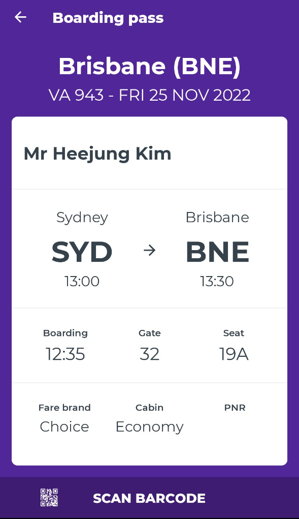 시드니에서 브리즈번까지의 보딩패스.