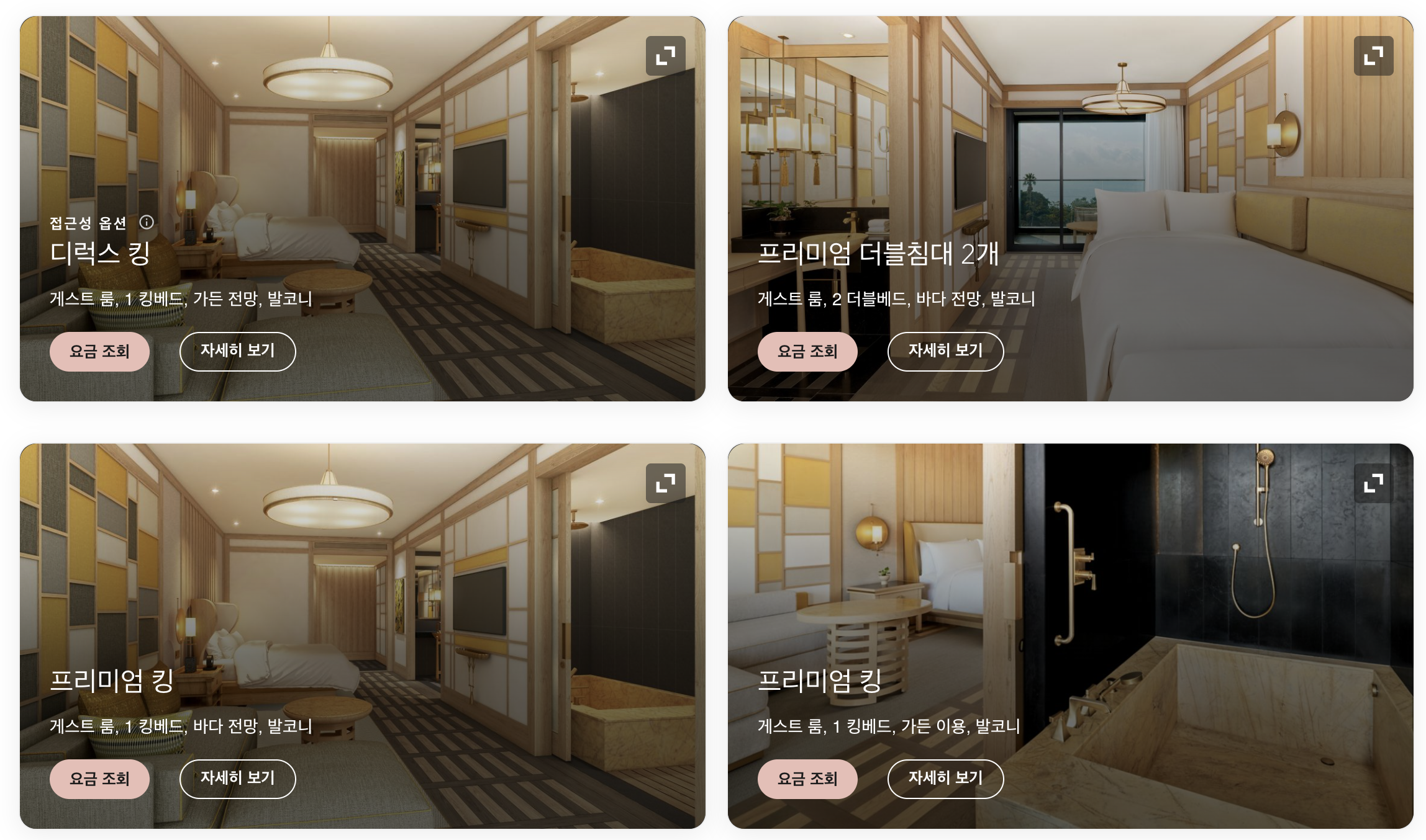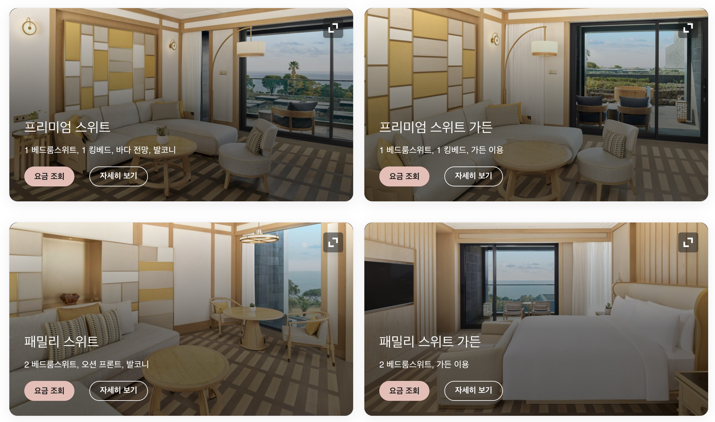 가장 기본 객실은 디럭스 킹으로, 킹 사이즈 침대 1개와 소파베드가 있어 최대 3명까지 투숙 가능하며 전망은 가든 전망입니다. 디럭스 킹의 비수기 최저가는 대략 94만 원 정도로 형성되는 편입니다. 그다음은 프리미엄 2 더블인데, 더블 침대 2개가 들어가지만 투숙 정원은 3명이고, 전망은 바다 전망이라는 점이 특징입니다. 프리미엄 킹은 디럭스 킹과 같은 구성(킹 침대 1개 + 소파베드, 최대 3명)이지만 바다 전망이라는 점이 차이입니다. 마지막으로 프리미엄 킹 가든은 디럭스 킹과 침대/소파 구성 및 기본 전망은 유사하지만, 테라스 밖에 작은 개인 정원이 있고 그 안에 자쿠지가 마련되어 있으며, 개인 정원 너머 공용 정원으로 바로 나갈 수 있다는 점이 큰 차이입니다. 비수기 기준 대략적인 가격은 프리미엄 킹과 프리미엄 킹 가든이 약 115만 원, 프리미엄 2 더블이 약 135만 원 수준입니다.