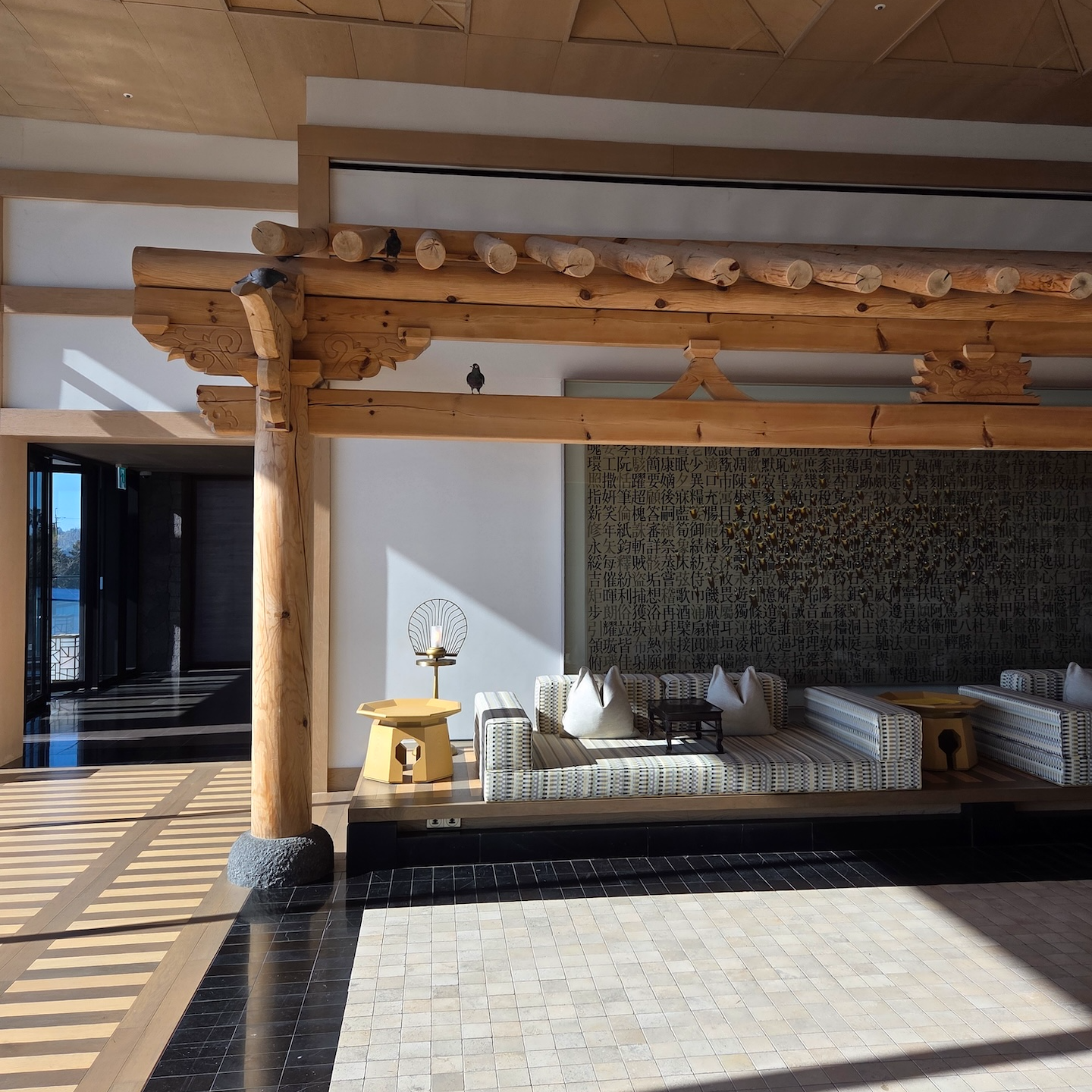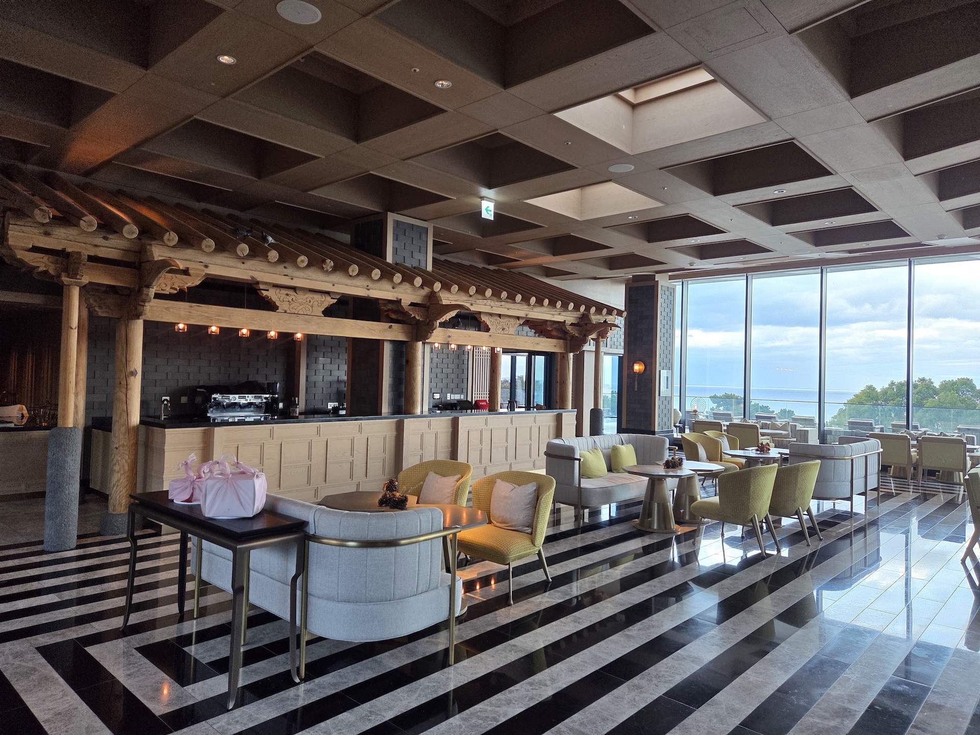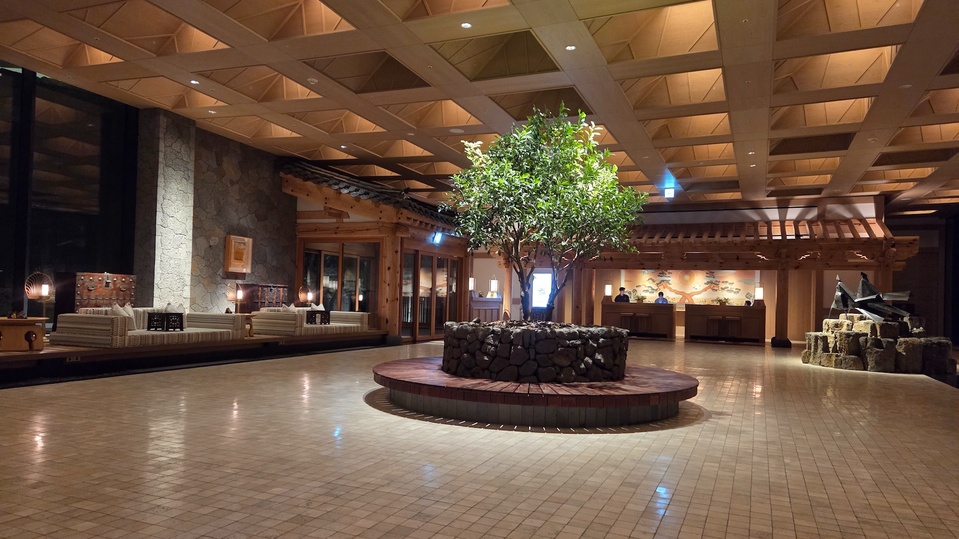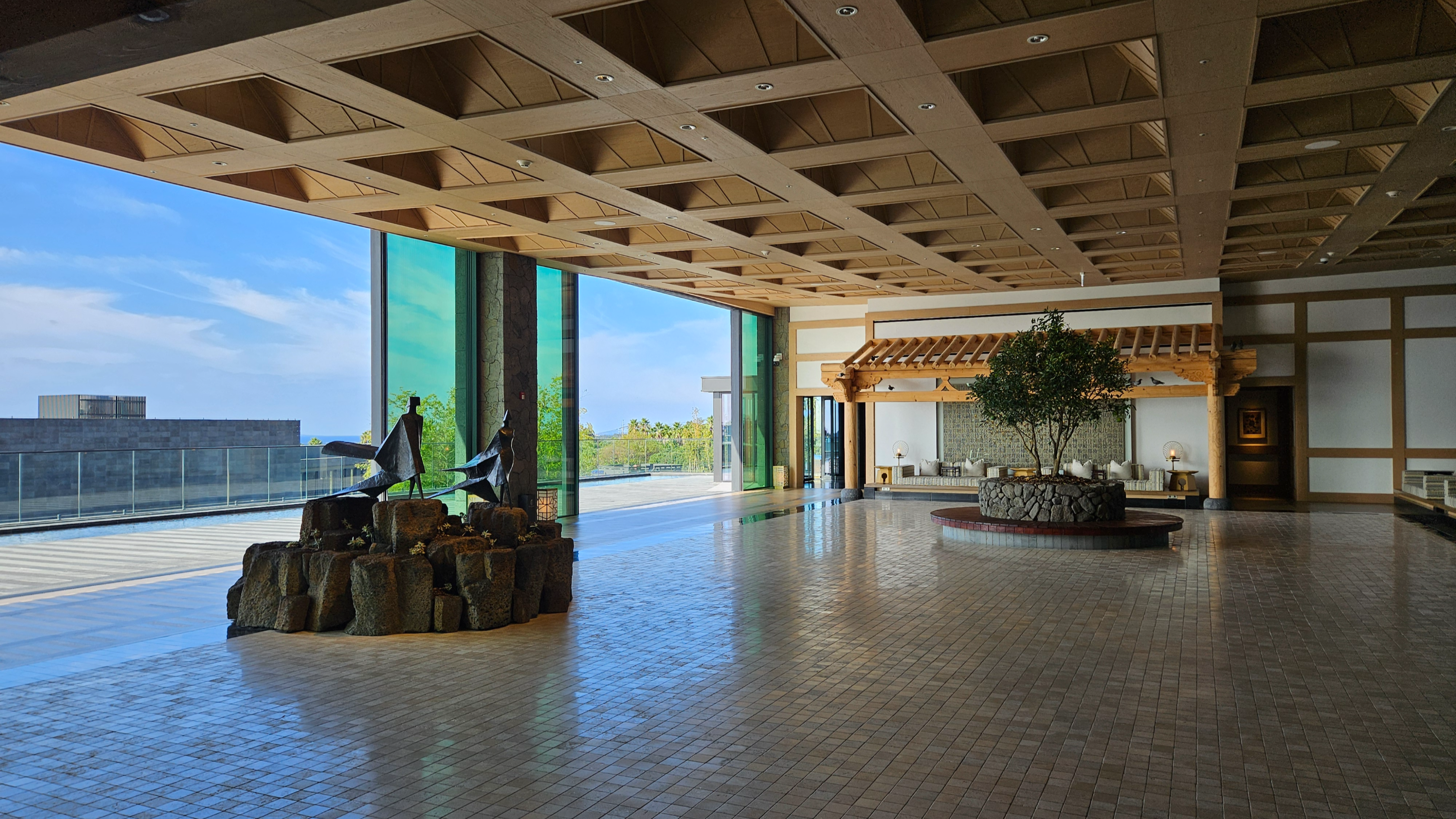 엘리베이터에서 내려 체크인 로비로 들어서는 순간, 이 공간이 단순히 체크인을 처리하는 곳이라기보다는 “제주에 도착했다”는 감각을 먼저 만들어주는 공간이라는 인상을 받았습니다. 로비 중앙에는 현무암 위에 두루미 조형물이 놓여 있는데, 거칠고 단단한 ‘제주의 땅’ 위에 두루미라는 한국적 상징을 추상적으로 재해석해 올려둔 구성이 이 호텔이 빌 벤슬리의 디자인이라는 걸 한 번에 보여주는 장면처럼 느껴졌습니다. 중앙의 두루미 조형물과 목재 벤치에 둘러싸인 나무를 중심으로, 세 면에는 한옥을 그대로 복원한 형태가 아니라 한옥의 비례와 구조감을 현대적으로 차용한 요소들이 배치되어 있어 전통적이면서도 과하지 않은 균형감을 만들어줍니다. 체크인 로비의 남은 한 면은 접이식 창으로 설계되어 날씨가 좋은 날에는 창을 모두 열어 바다와 범섬이 한눈에 들어오며, 실내이면서도 야외에 있는 듯한 시원한 개방감을 느낄 수 있습니다. 다만 제가 방문했을 때는 겨울이라 창이 닫혀 있었고, 유리창에 실내가 반사되어 바깥 풍경이 또렷하게 보이지 않아 조금 아쉬움이 남았습니다. 개인적으로 JW 메리어트 제주 리조트 & 스파의 체크인 로비는 이 호텔이 지향하는 ‘제주의 자연 + 한국적 상징 + 현대적 럭셔리’가 가장 잘 드러나는 공간이라고 느꼈고, 지금까지 가본 호텔 로비들 중에서도 손에 꼽을 정도로 인상적이었습니다.