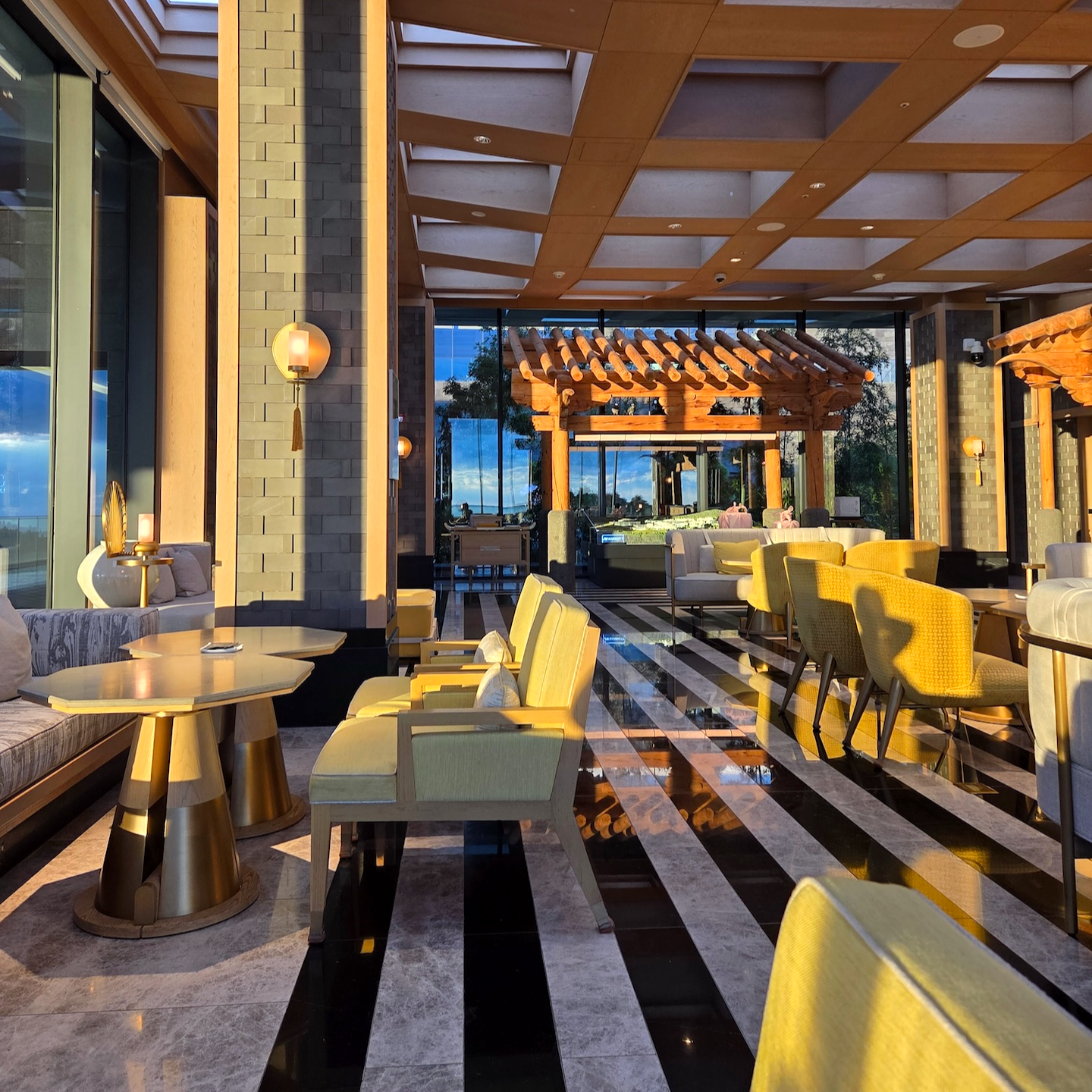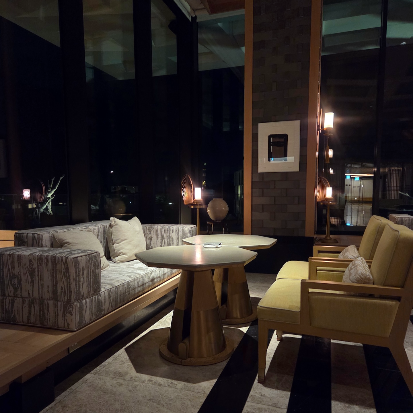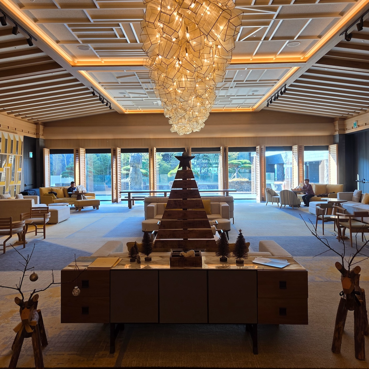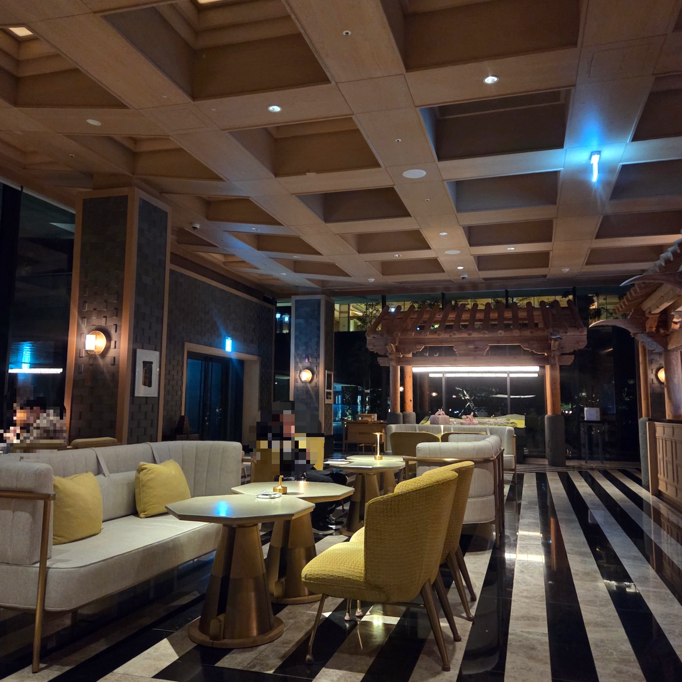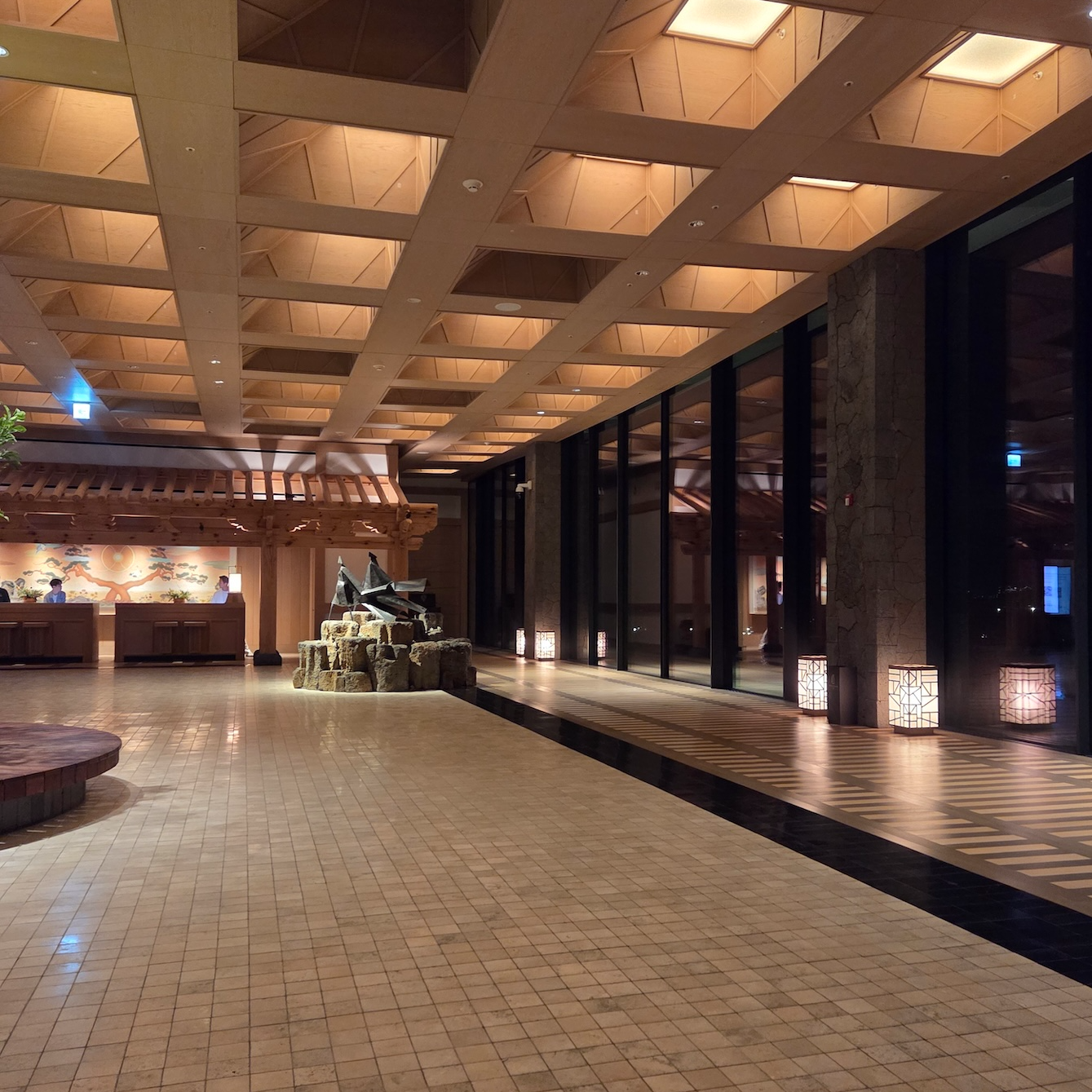 엘리베이터에서 내려 체크인 로비로 들어서는 순간, 이 공간이 단순히 체크인을 처리하는 곳이라기보다는 “제주에 도착했다”는 감각을 먼저 만들어주는 공간이라는 인상을 받았습니다. 로비 중앙에는 현무암 위에 두루미 조형물이 놓여 있는데, 거칠고 단단한 ‘제주의 땅’ 위에 두루미라는 한국적 상징을 추상적으로 재해석해 올려둔 구성이 이 호텔이 빌 벤슬리의 디자인이라는 걸 한 번에 보여주는 장면처럼 느껴졌습니다. 중앙의 두루미 조형물과 목재 벤치에 둘러싸인 나무를 중심으로, 세 면에는 한옥을 그대로 복원한 형태가 아니라 한옥의 비례와 구조감을 현대적으로 차용한 요소들이 배치되어 있어 전통적이면서도 과하지 않은 균형감을 만들어줍니다. 체크인 로비의 남은 한 면은 접이식 창으로 설계되어 날씨가 좋은 날에는 창을 모두 열어 바다와 범섬이 한눈에 들어오며, 실내이면서도 야외에 있는 듯한 시원한 개방감을 느낄 수 있습니다. 다만 제가 방문했을 때는 겨울이라 창이 닫혀 있었고, 유리창에 실내가 반사되어 바깥 풍경이 또렷하게 보이지 않아 조금 아쉬움이 남았습니다. 개인적으로 JW 메리어트 제주 리조트 & 스파의 체크인 로비는 이 호텔이 지향하는 ‘제주의 자연 + 한국적 상징 + 현대적 럭셔리’가 가장 잘 드러나는 공간이라고 느꼈고, 지금까지 가본 호텔 로비들 중에서도 손에 꼽을 정도로 인상적이었습니다.