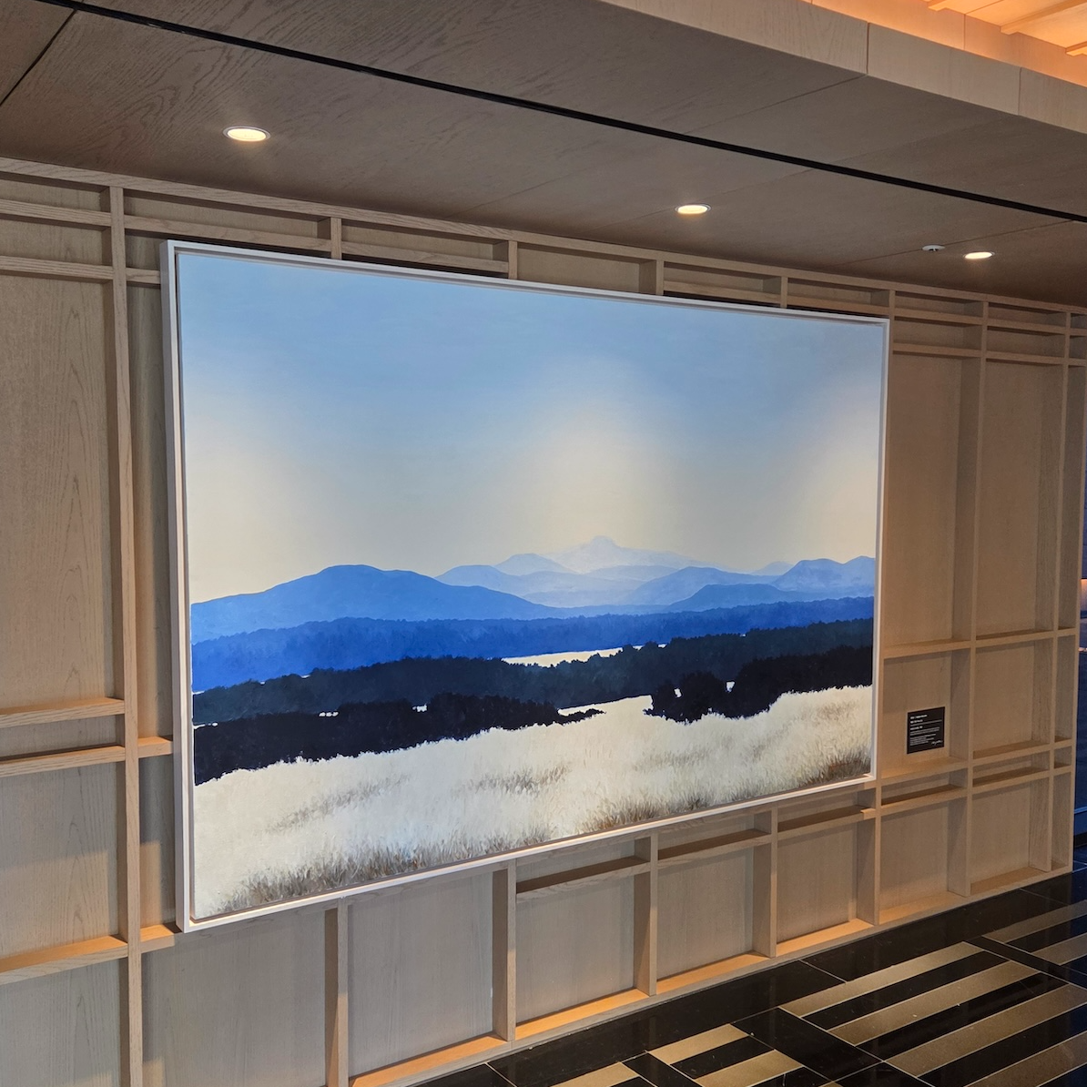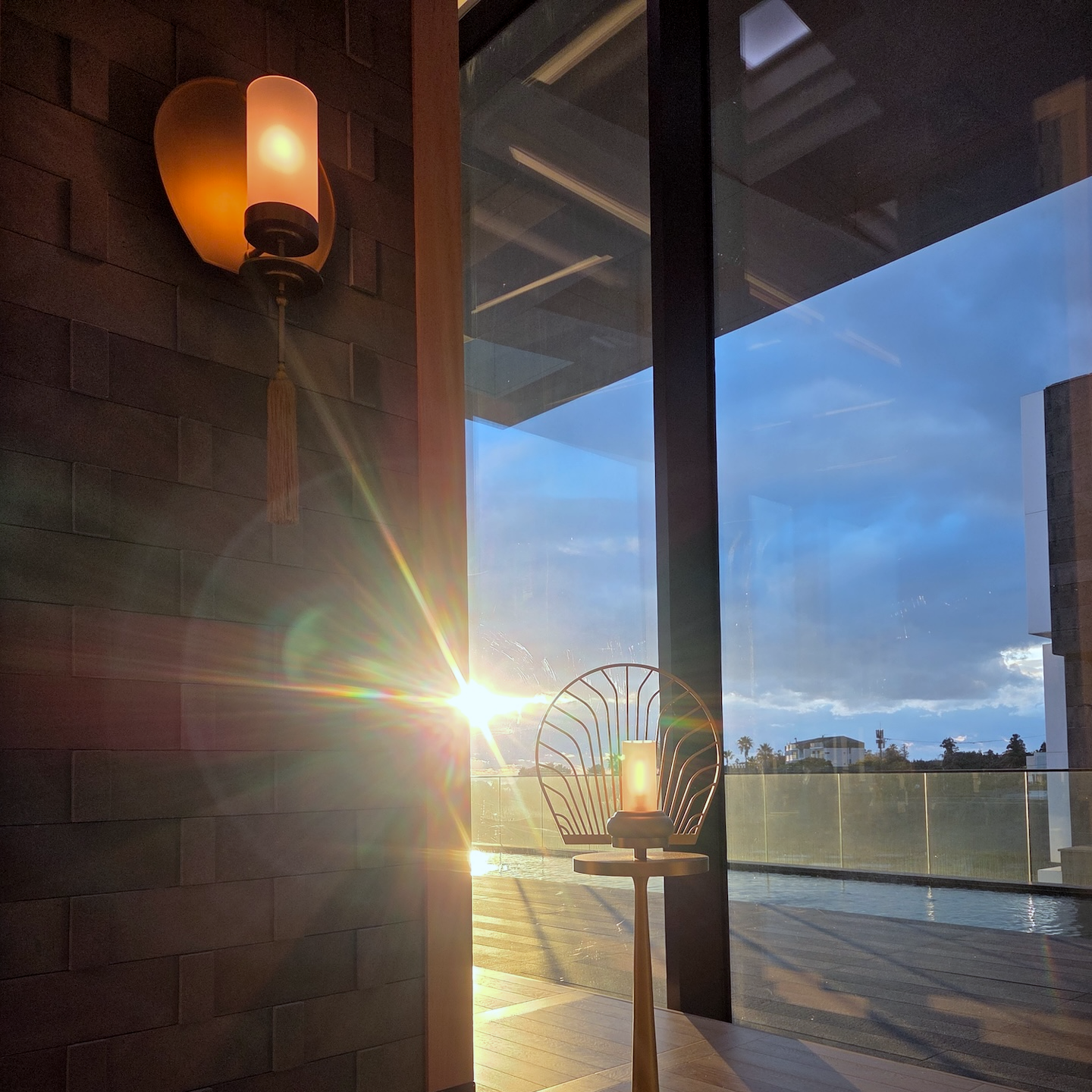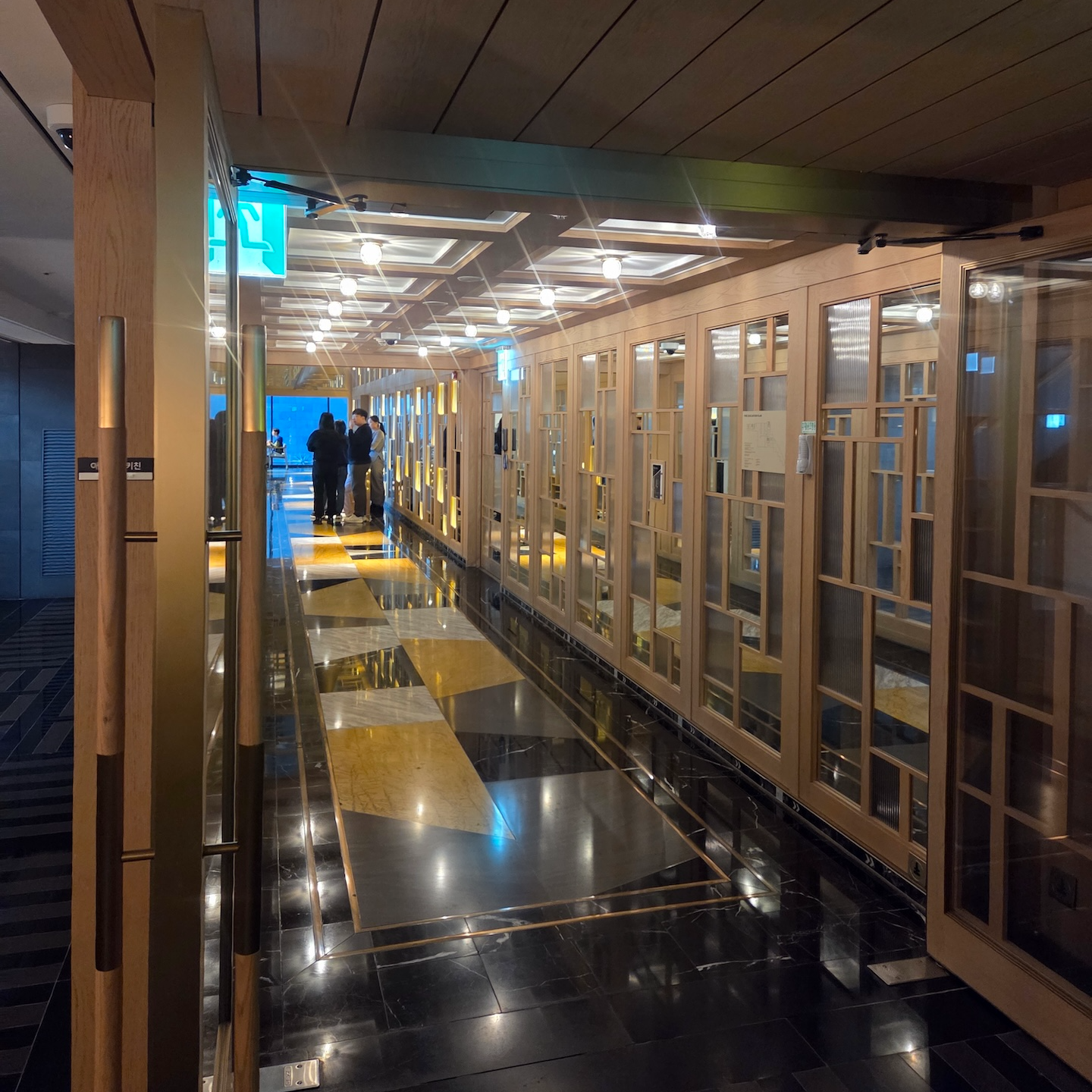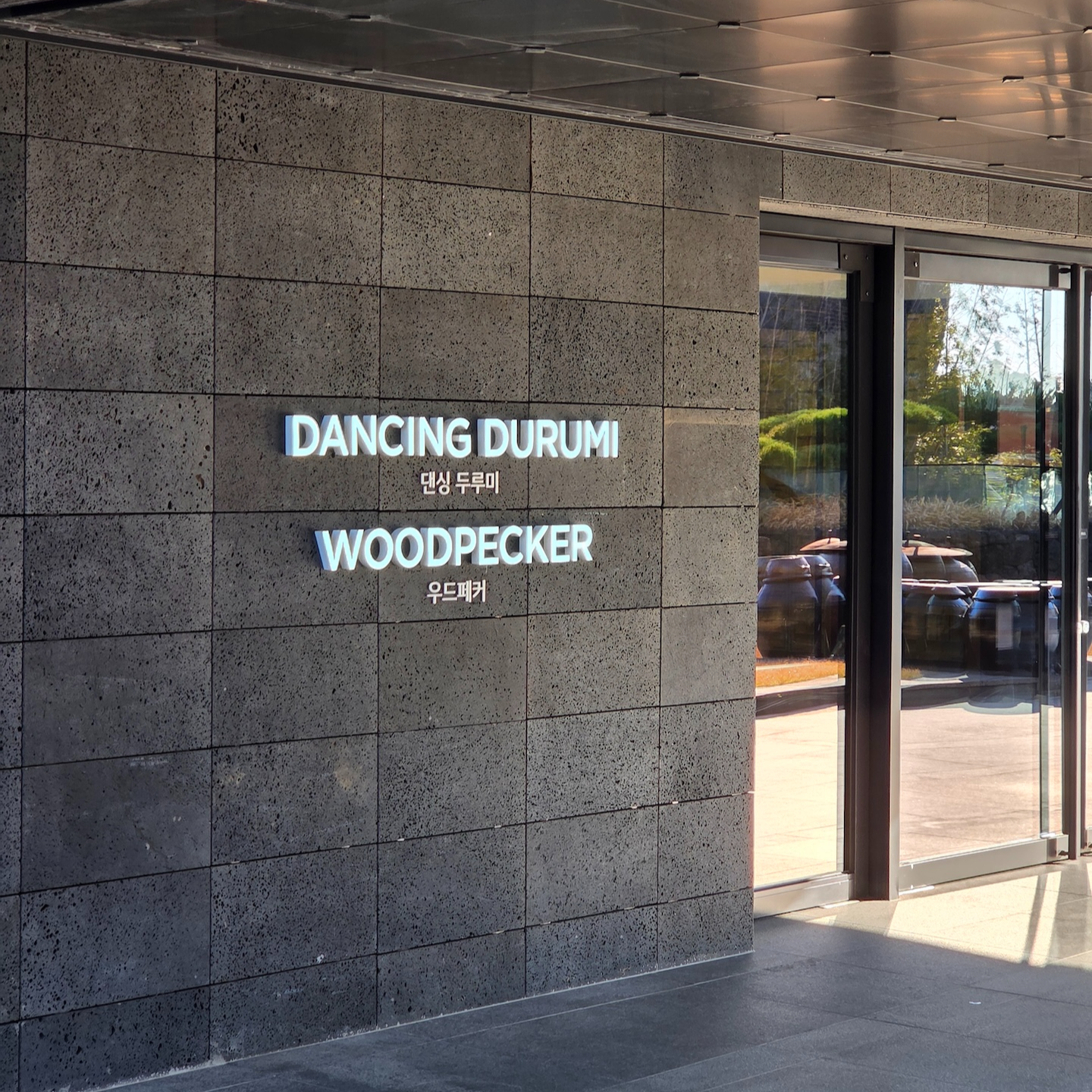 엘리베이터에서 내려 체크인 로비로 들어서는 순간, 이 공간이 단순히 체크인을 처리하는 곳이라기보다는 “제주에 도착했다”는 감각을 먼저 만들어주는 공간이라는 인상을 받았습니다. 로비 중앙에는 현무암 위에 두루미 조형물이 놓여 있는데, 거칠고 단단한 ‘제주의 땅’ 위에 두루미라는 한국적 상징을 추상적으로 재해석해 올려둔 구성이 이 호텔이 빌 벤슬리의 디자인이라는 걸 한 번에 보여주는 장면처럼 느껴졌습니다. 중앙의 두루미 조형물과 목재 벤치에 둘러싸인 나무를 중심으로, 세 면에는 한옥을 그대로 복원한 형태가 아니라 한옥의 비례와 구조감을 현대적으로 차용한 요소들이 배치되어 있어 전통적이면서도 과하지 않은 균형감을 만들어줍니다. 체크인 로비의 남은 한 면은 접이식 창으로 설계되어 날씨가 좋은 날에는 창을 모두 열어 바다와 범섬이 한눈에 들어오며, 실내이면서도 야외에 있는 듯한 시원한 개방감을 느낄 수 있습니다. 다만 제가 방문했을 때는 겨울이라 창이 닫혀 있었고, 유리창에 실내가 반사되어 바깥 풍경이 또렷하게 보이지 않아 조금 아쉬움이 남았습니다. 개인적으로 JW 메리어트 제주 리조트 & 스파의 체크인 로비는 이 호텔이 지향하는 ‘제주의 자연 + 한국적 상징 + 현대적 럭셔리’가 가장 잘 드러나는 공간이라고 느꼈고, 지금까지 가본 호텔 로비들 중에서도 손에 꼽을 정도로 인상적이었습니다.