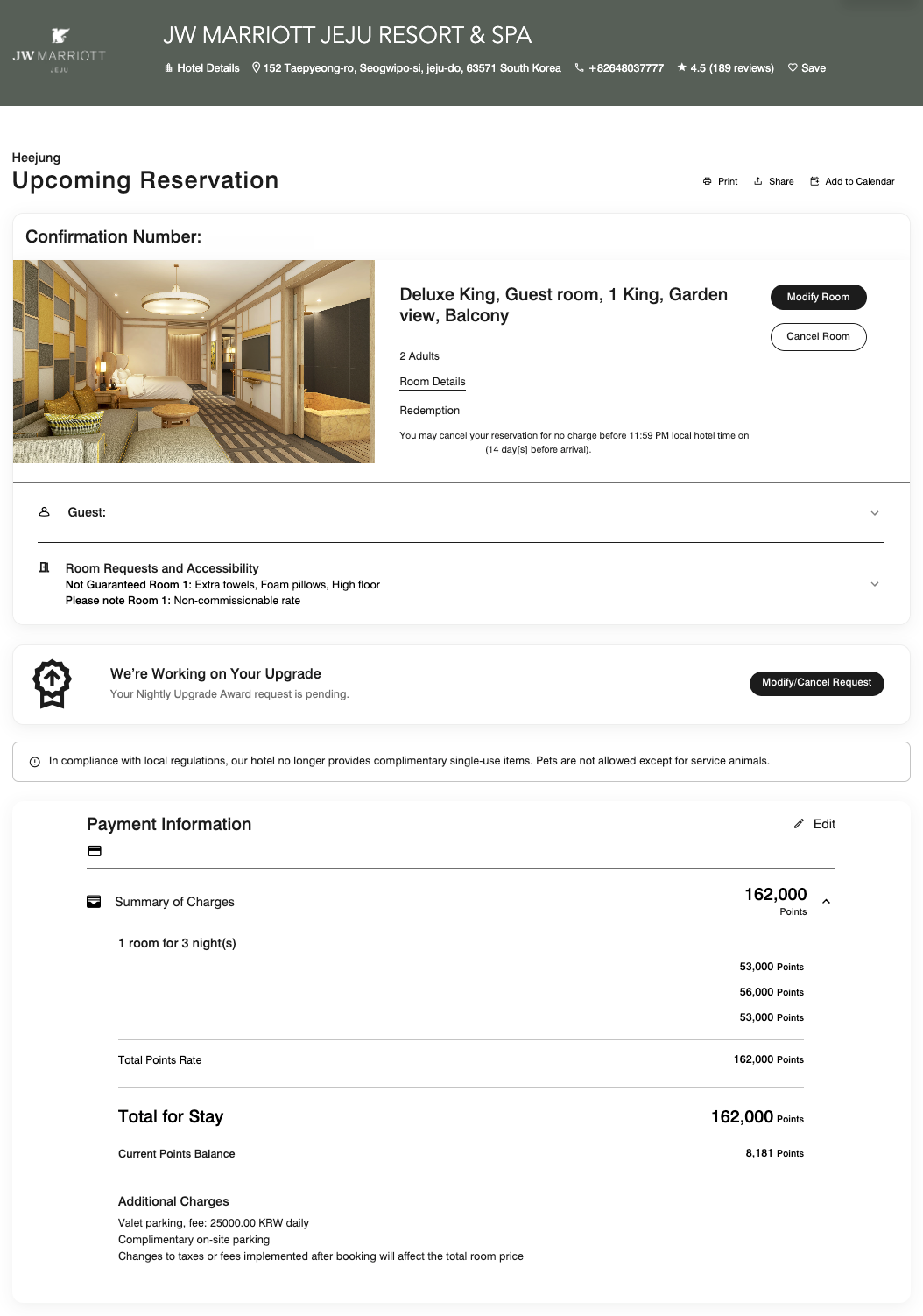 JW 메리어트 제주 리조트 & 스파 예약 내역 (c) marriott.com