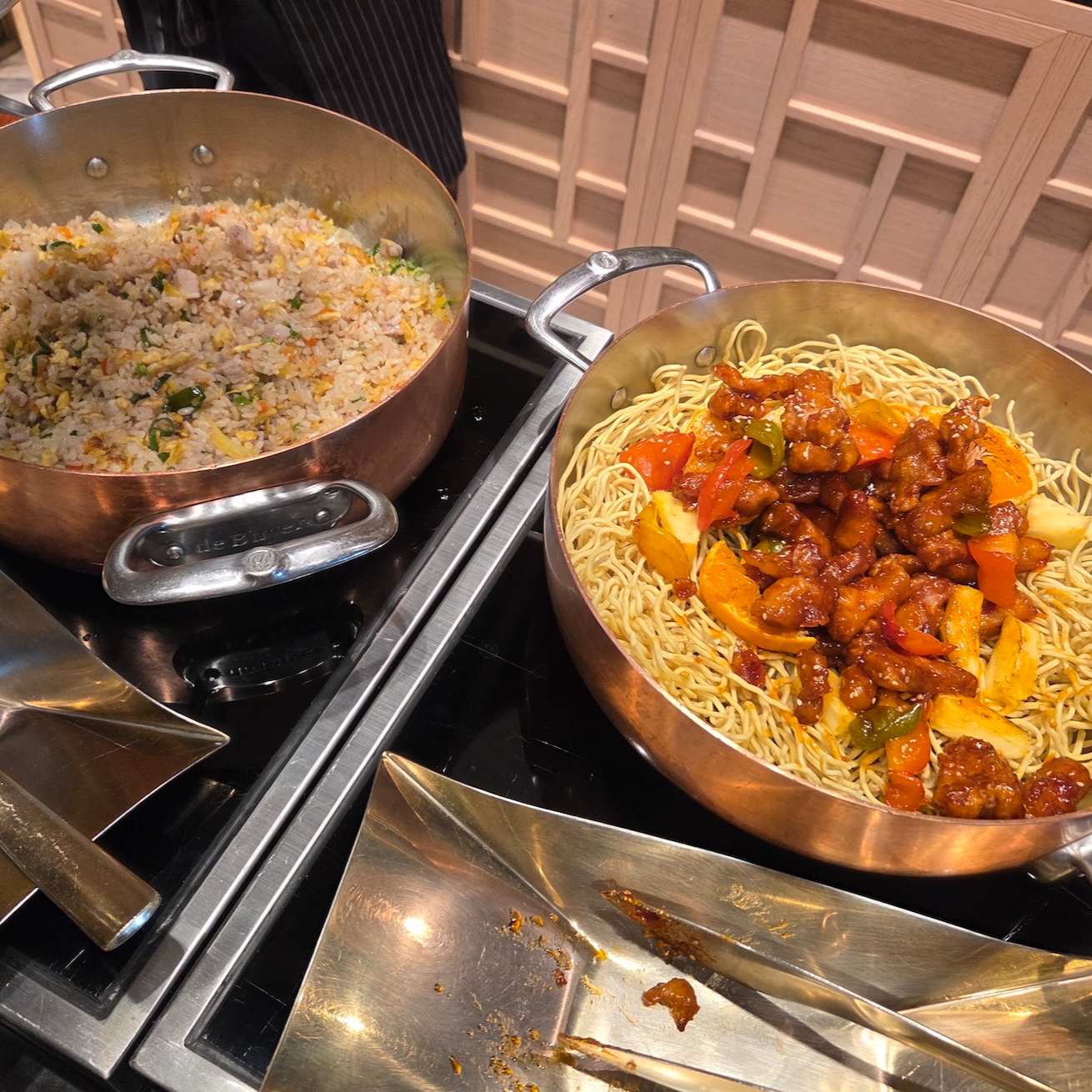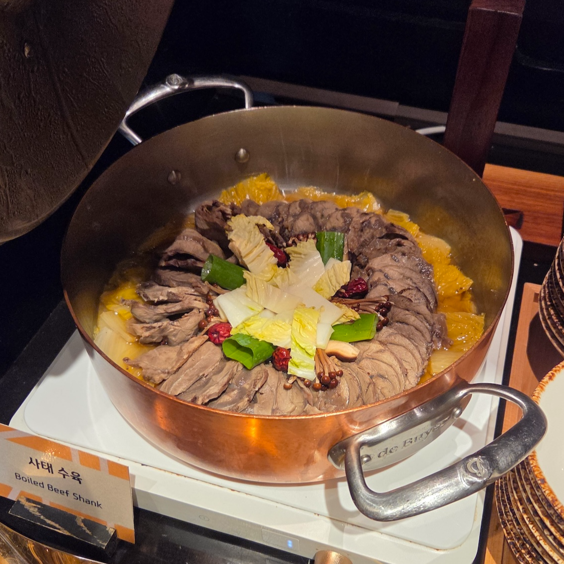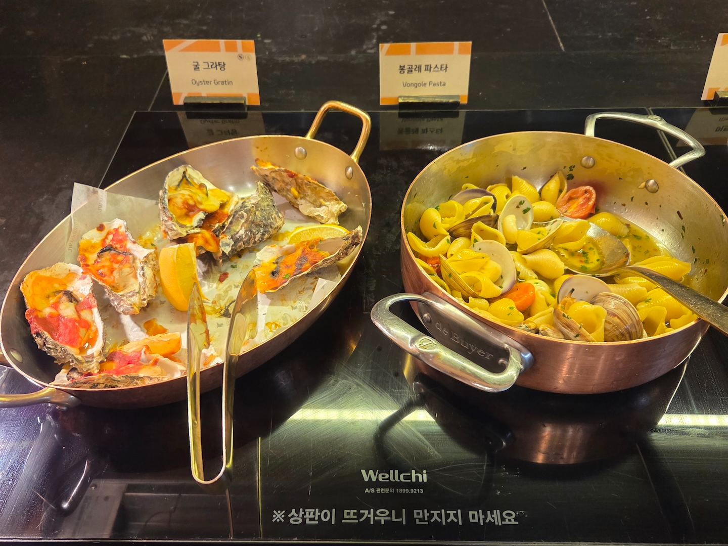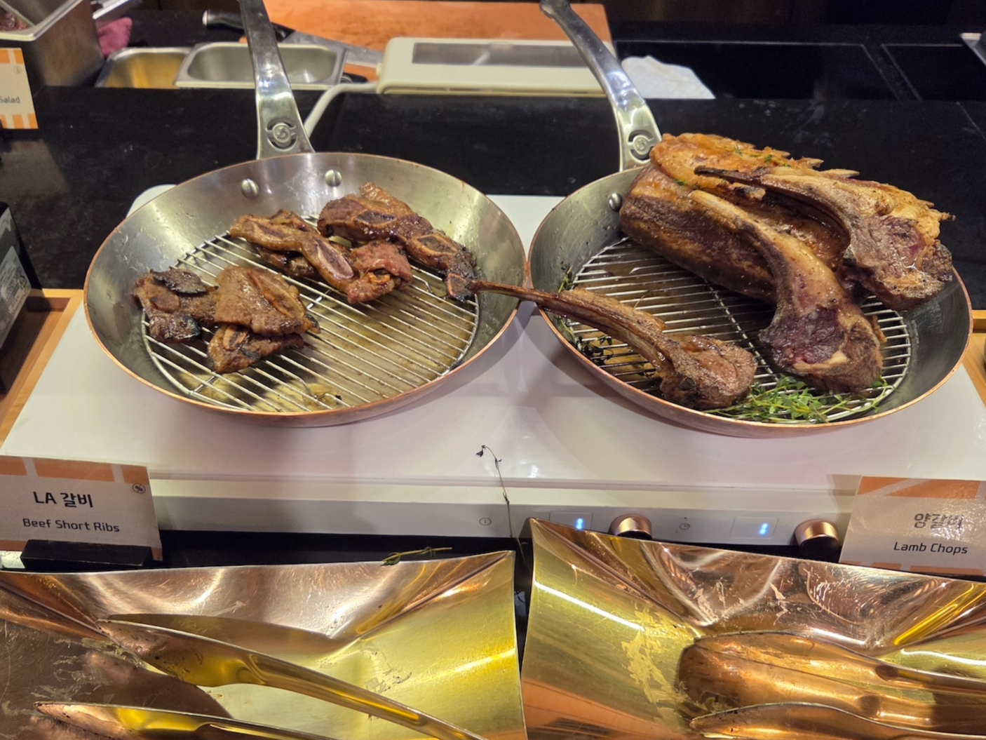 핫푸드로는 굴 그라탕, 봉골레 파스타, 미트볼, 구운 연어, LA 갈비, 양갈비, 돈 우대갈비, 돼지 목살, 양송이 크림 치킨, 구운 옥수수와 구운 양파를 포함한 구운 채소, 사태 수육, 고로육, 볶음밥, 단호박 스프, 전복죽, 홍합탕, 흑돼지 김치찌개, 닭갈비, 생선구이 등이 제공되었습니다.