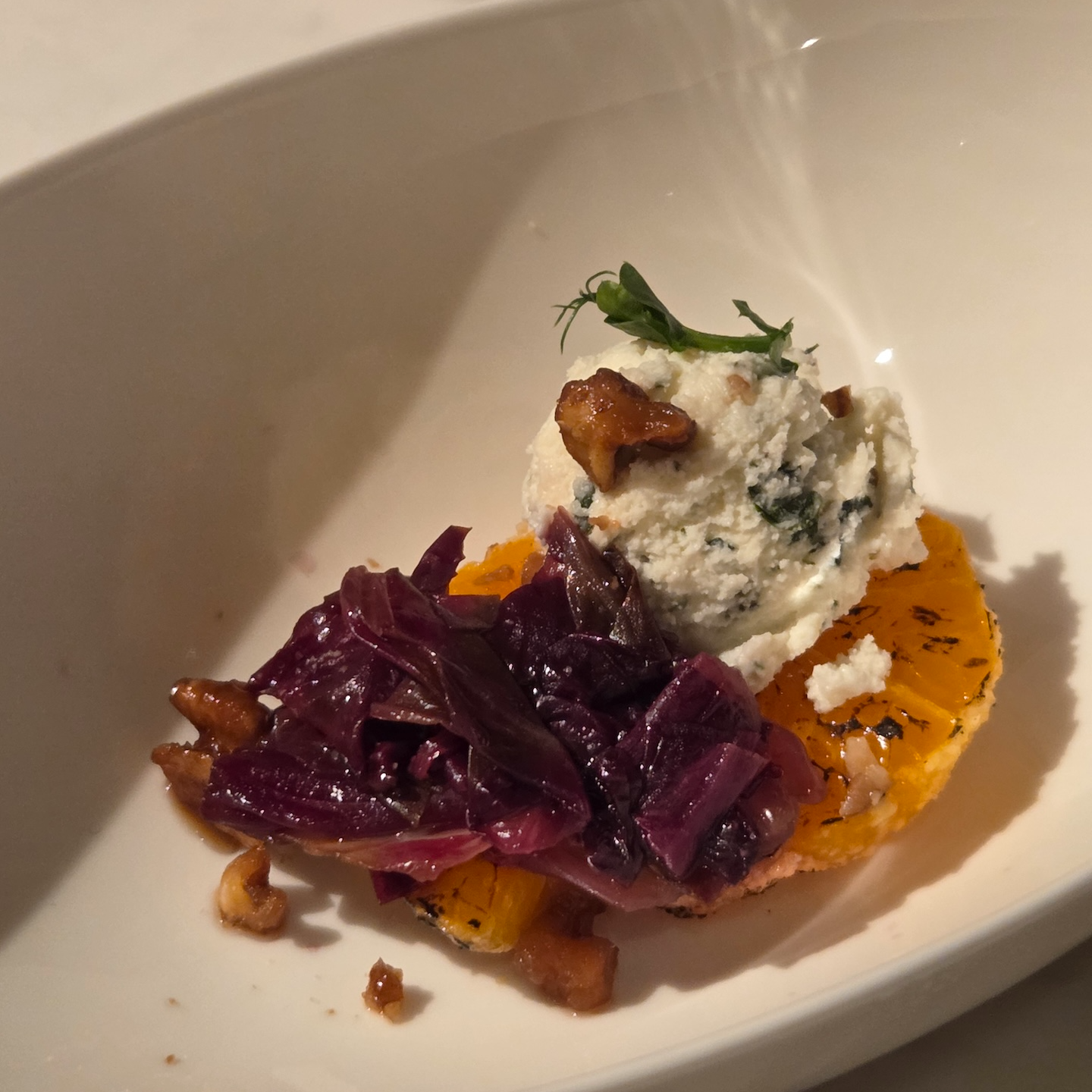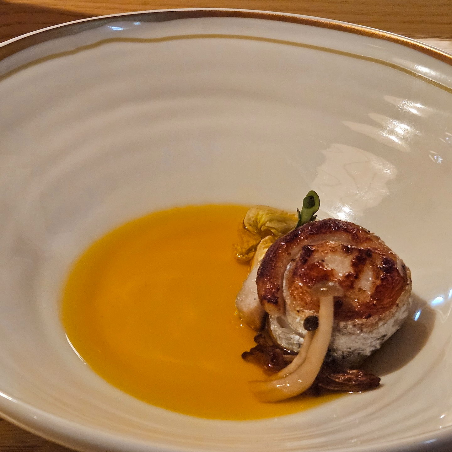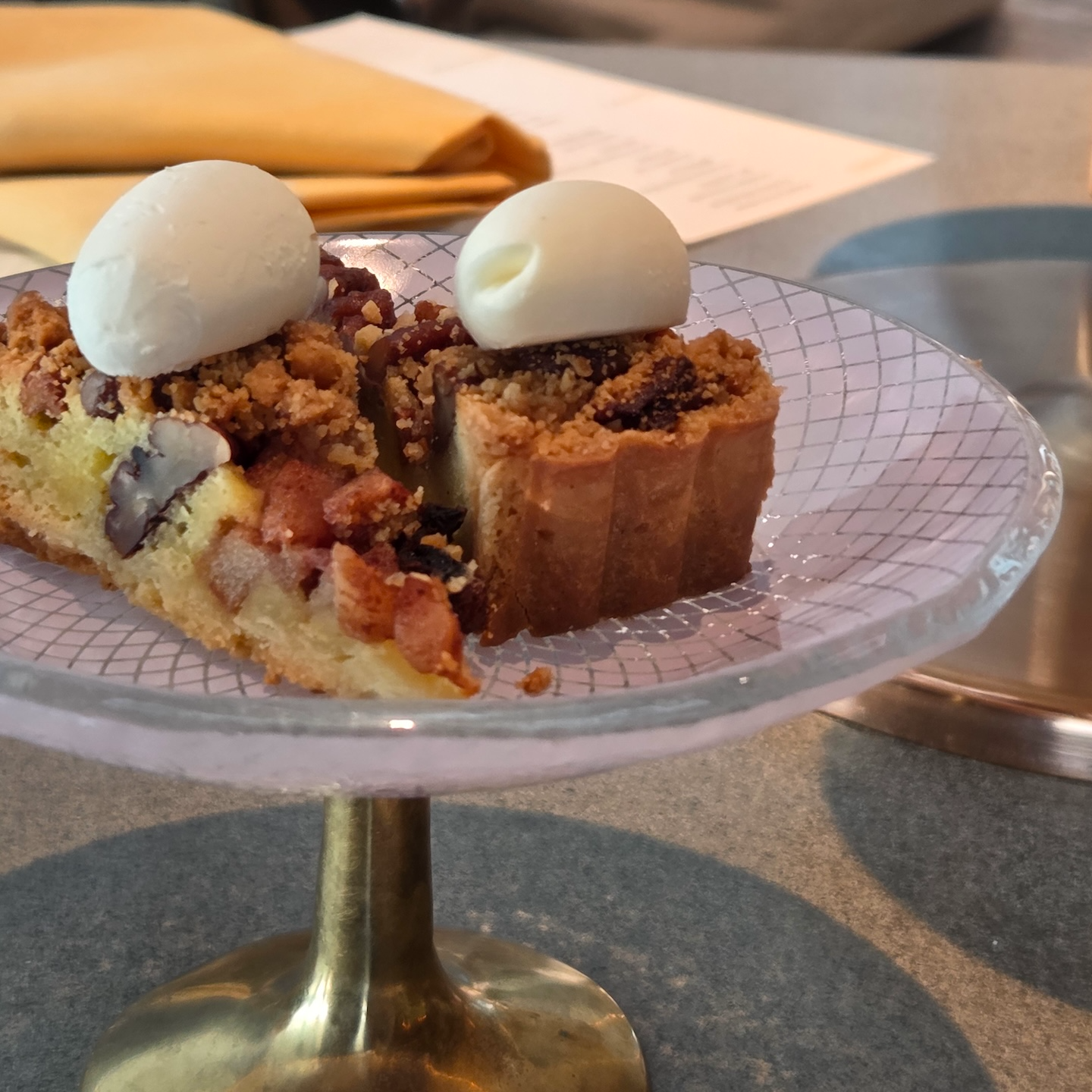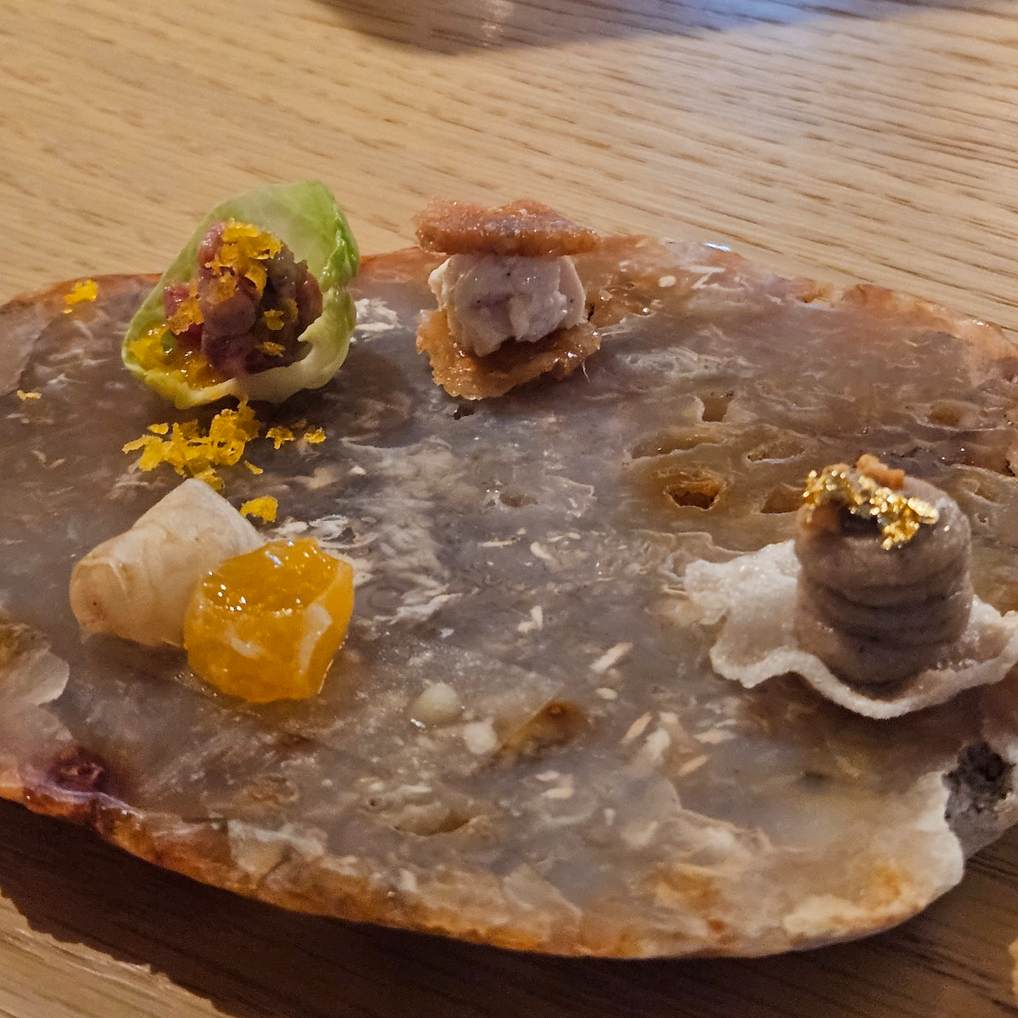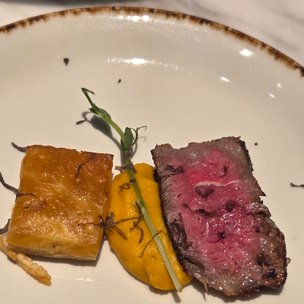 스몰바이트는 크게 세이보리한 디저트와 스윗한 디저트로 구성되어 있었고, 세이보리는 총 4가지가 제공되었습니다. 가장 먼저 가든 타르트는 얇은 타르트 쉘 위에 절인 감, 미니 양배추, 콩 등이 올라가 있었는데, 쉘의 바삭함과 감의 달달함, 양배추의 아삭함, 콩의 고소함, 소스의 산미 조합이 정말 좋았습니다. 신선한 채소들로 가득한 제주도의 정원을 연상시키는 느낌이라 개인적으로 가장 맛있었던 메뉴였습니다. 다음은 치즈 크루통으로, 바삭한 빵 위에 절인 배와 치즈를 올린 구성인데 배의 상큼함과 크루통의 바삭함, 치즈의 고소함이 잘 어우러졌고 먹고 난 뒤에도 치즈의 고소한 여운이 진하게 남아 인상적이었습니다. 랍스터 샌드위치는 브리오슈 빵에 수비드한 랍스터와 치폴레 소스를 곁들인 메뉴로, 브리오슈의 고소함과 랍스터의 부드러움, 치폴레 소스의 매콤함, 소스에 버무려진 채소의 아삭함, 위에 살짝 올라간 캐비어의 감칠맛이 느껴졌습니다. 다만 치폴레 소스의 캐릭터가 강하다 보니 랍스터 맛이 상대적으로 덜 느껴진 점은 아쉬웠습니다. 마지막은 파스트라미 머핀으로, 잉글리시 머핀 사이에 한우 파스트라미를 넣고 요거트 소스를 더한 구성인데 쫄깃한 빵과 파스트라미의 진한 맛을 중심으로 요거트가 산미를 더해주는 괜찮은 조합이었습니다.