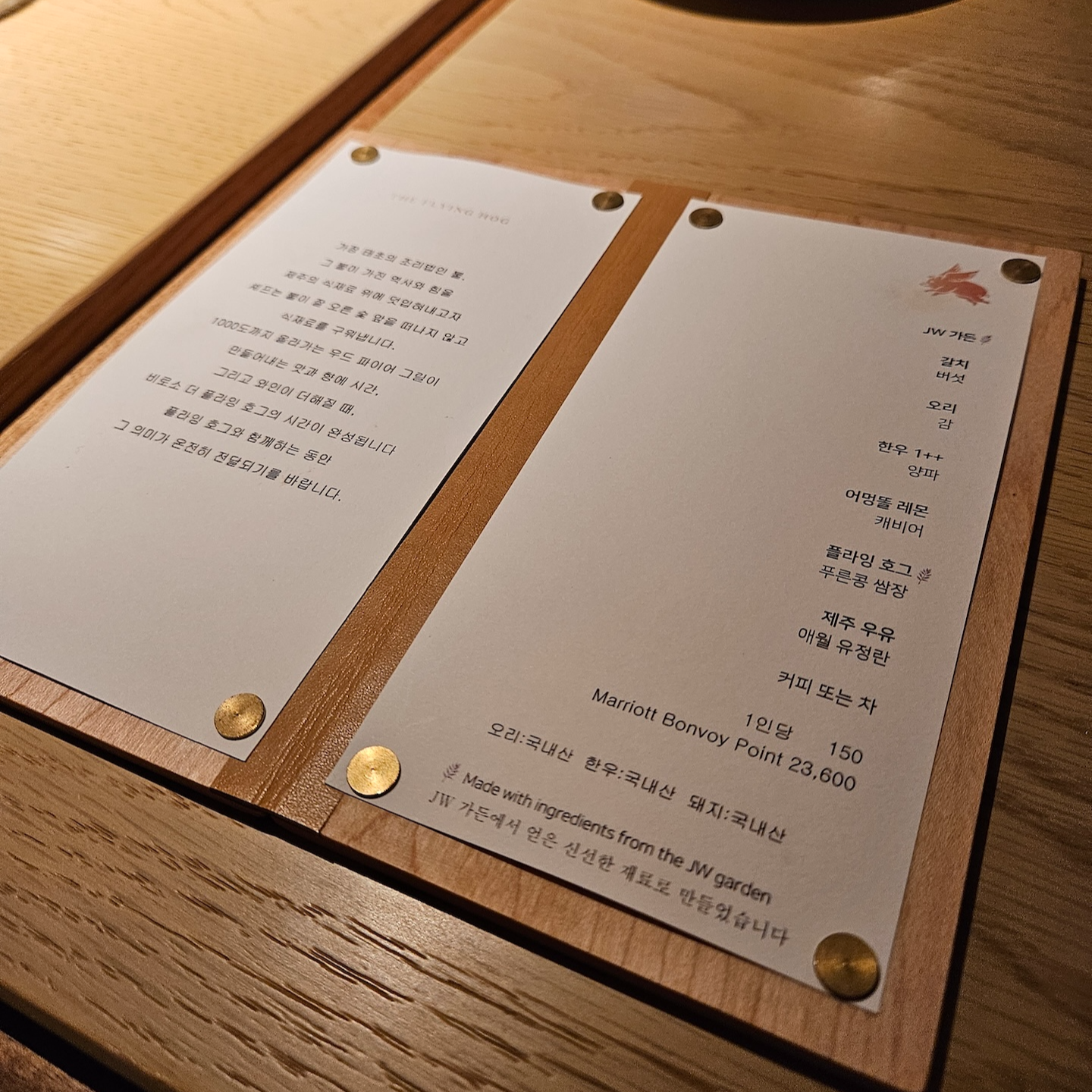 플라잉 호그는 저녁 시간대만 운영하는 그릴 다이닝이며, 단품 메뉴와 코스 메뉴를 모두 판매합니다. 이번 투숙에서는 이용하지 않았지만, 지난 투숙 때의 경험을 떠올려보면 제철 식재료를 활용한 메뉴들을 코스로 즐길 수 있어 만족스러웠던 기억이 있습니다. 코스 가격은 성인 1인 기준 더 플라잉 호그 테이스팅 4코스 100,000원, 라 리스트 셀렉션 7코스 150,000원, 더 플라잉 호그 스페셜 캐비아 7코스 250,000원이며, 저는 지난 방문 때 150,000원 코스를 이용했었습니다. 개인적으로는 돈이 아깝다는 생각이 들지 않았던 만족스러운 코스였습니다.