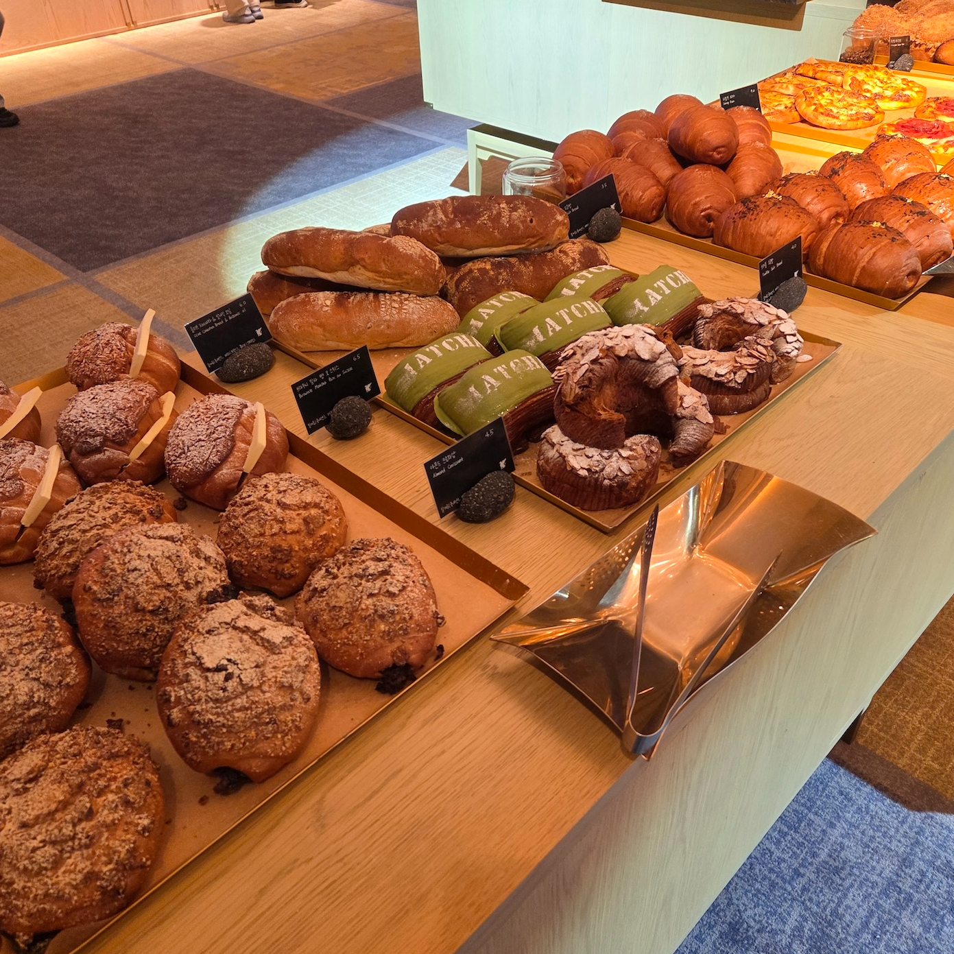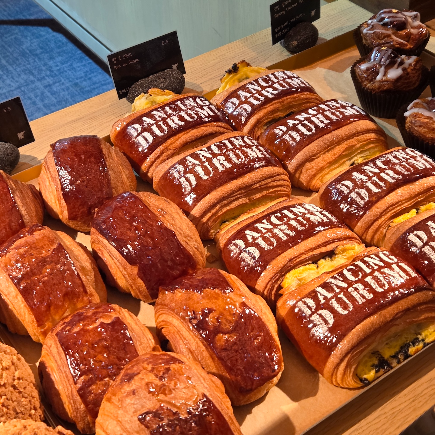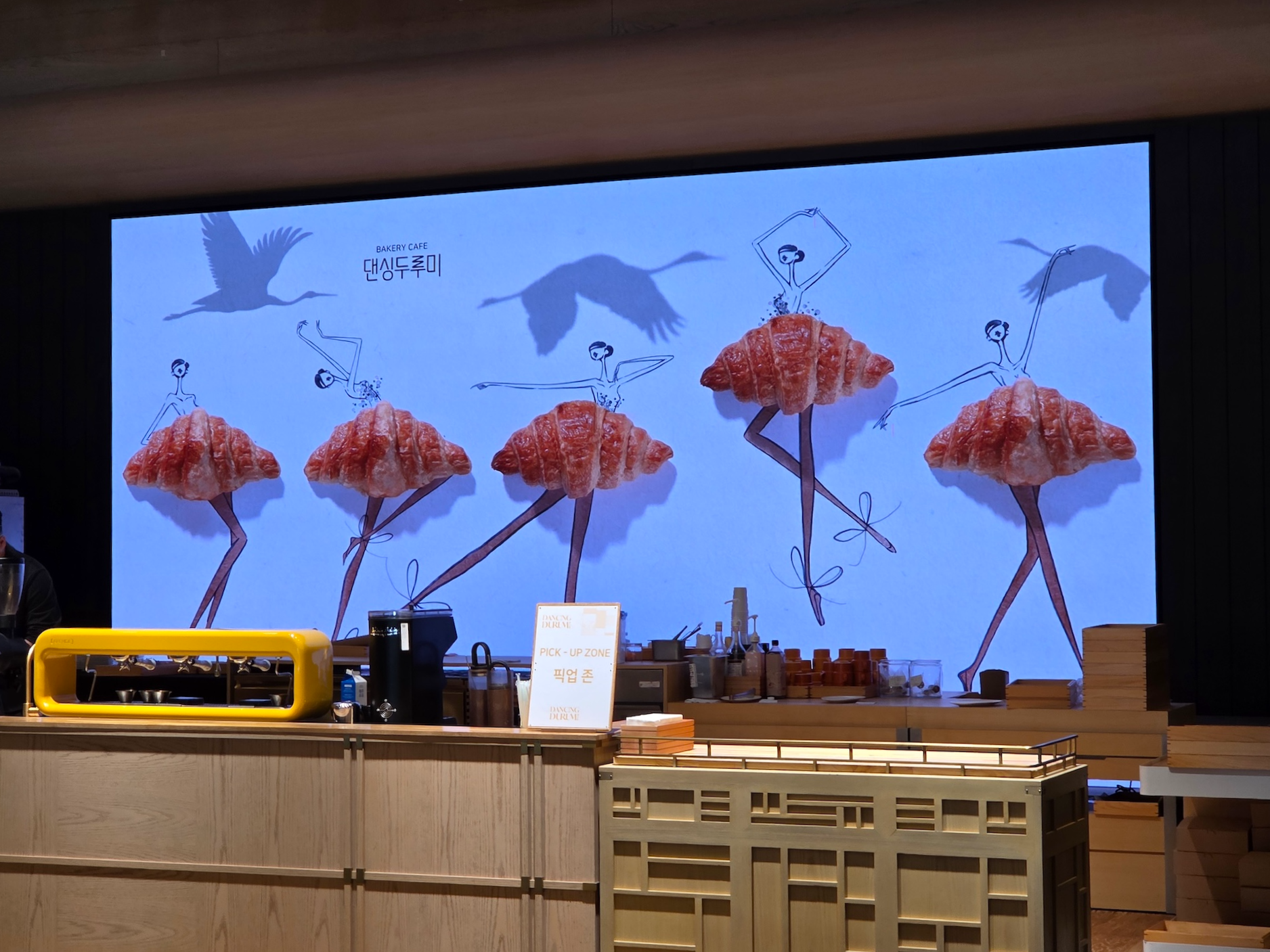 댄싱 두루미는 체크인 로비가 있는 건물 6층에 위치한 베이커리로, 오전 10시부터 오후 8시까지 운영합니다. 댄싱 두루미에서는 생소하면서도 인상적인 다양한 빵들을 판매하는데, 당장 떠오르는 것만 해도 딸기 말차 카이막 대니쉬, 잠봉 포카치아, 청귤 단팥빵, 우도로 간 소보로, 단팥 말차 크루아상 등이 있을 정도입니다. 직원분께서 말씀하시길 오후가 되면 인기 메뉴들은 품절되는 경우가 많다고 하니, 당장 먹지 않더라도 일찍 들러 마음에 드는 빵이 있으면 미리 사두는 것도 좋을 것 같습니다.