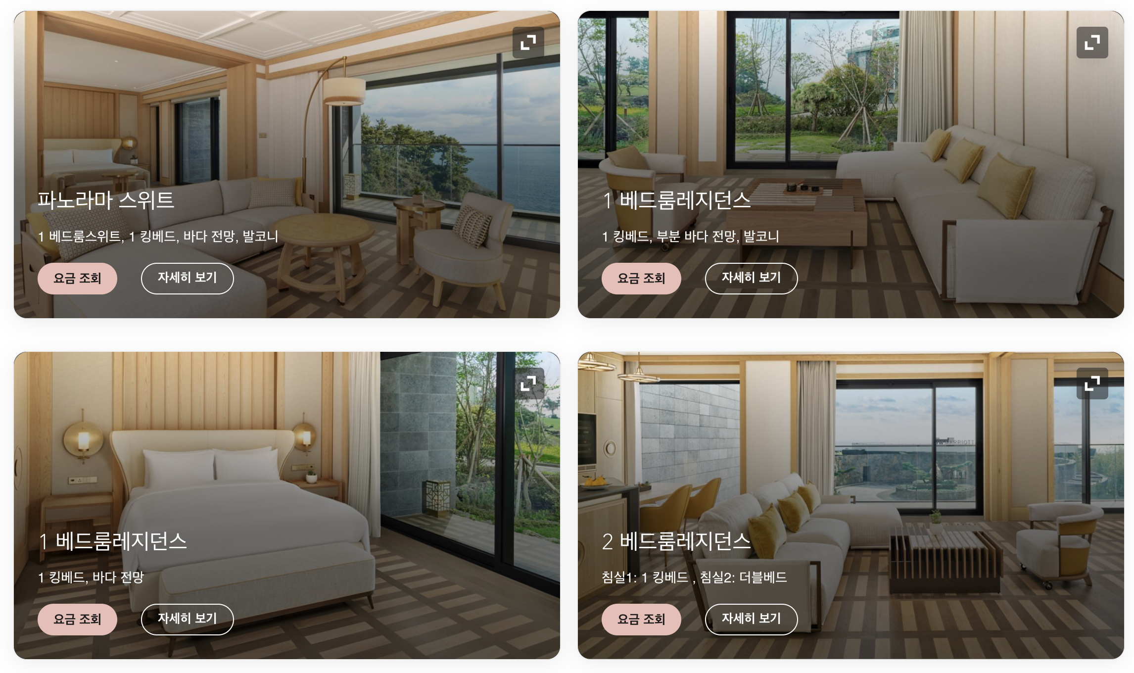 JW 메리어트 제주 리조트 & 스파의 게스트룸은 크게 디럭스 킹, 프리미엄 2 더블, 프리미엄 킹, 프리미엄 킹 가든으로 나눌 수 있습니다. 객실 면적은 모두 43~47㎡로 비슷하고, 모든 객실에 발코니가 있다는 점도 동일하지만, 침대 구성과 전망, 그리고 테라스/가든 여부에 따라 차이가 납니다.