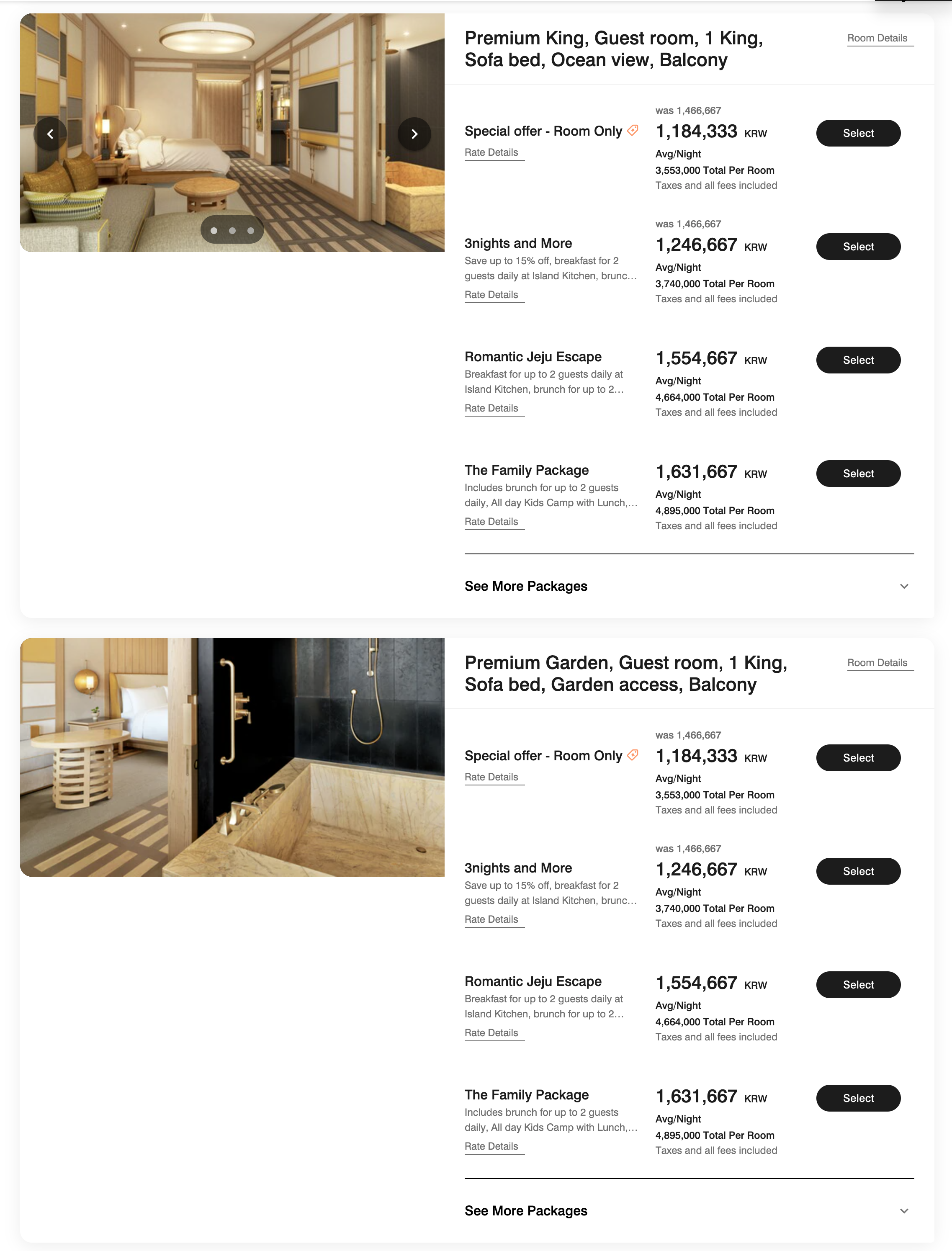JW 메리어트 제주 리조트 & 스파에는 총 5개의 스위트가 있습니다. 프리미엄 스위트프리미엄 스위트 가든은 모두 90㎡로, 일반 게스트룸 2개를 붙여 놓은 정도의 크기이며 침실과 거실이 각각 독립되어 있습니다. 두 객실 모두 정원은 3명이고 테라스가 있다는 점은 같지만, 프리미엄 스위트는 바다 전망(개인 정원 없음)이라면 프리미엄 스위트 가든은 개인 정원과 자쿠지가 있는 타입입니다. 비수기 주중 기준으로 프리미엄 스위트는 140만 원대 후반, 프리미엄 스위트 가든은 160만 원대 후반 정도로 형성됩니다. 이외에도 방이 2개인 패밀리 스위트가 있고, 최상위 스위트로는 파노라마 스위트가 있습니다. 패밀리 스위트는 약 180만 원 내외, 파노라마 스위트는 약 190만 원 내외였습니다. 참고로 모든 객실이 ‘정원 3명’으로 표기되어 있는데, 이는 성인 기준이라 자녀 동반 시에는 4명까지도 투숙 가능한 경우가 있다는 점도 함께 참고하시면 좋겠습니다. (위에서 언급한 가격은 모두 조식 미포함, 비수기 주중 1박, 세금 포함 기준입니다.)