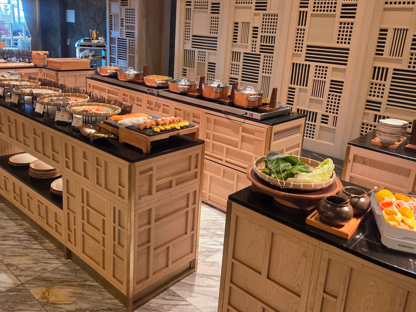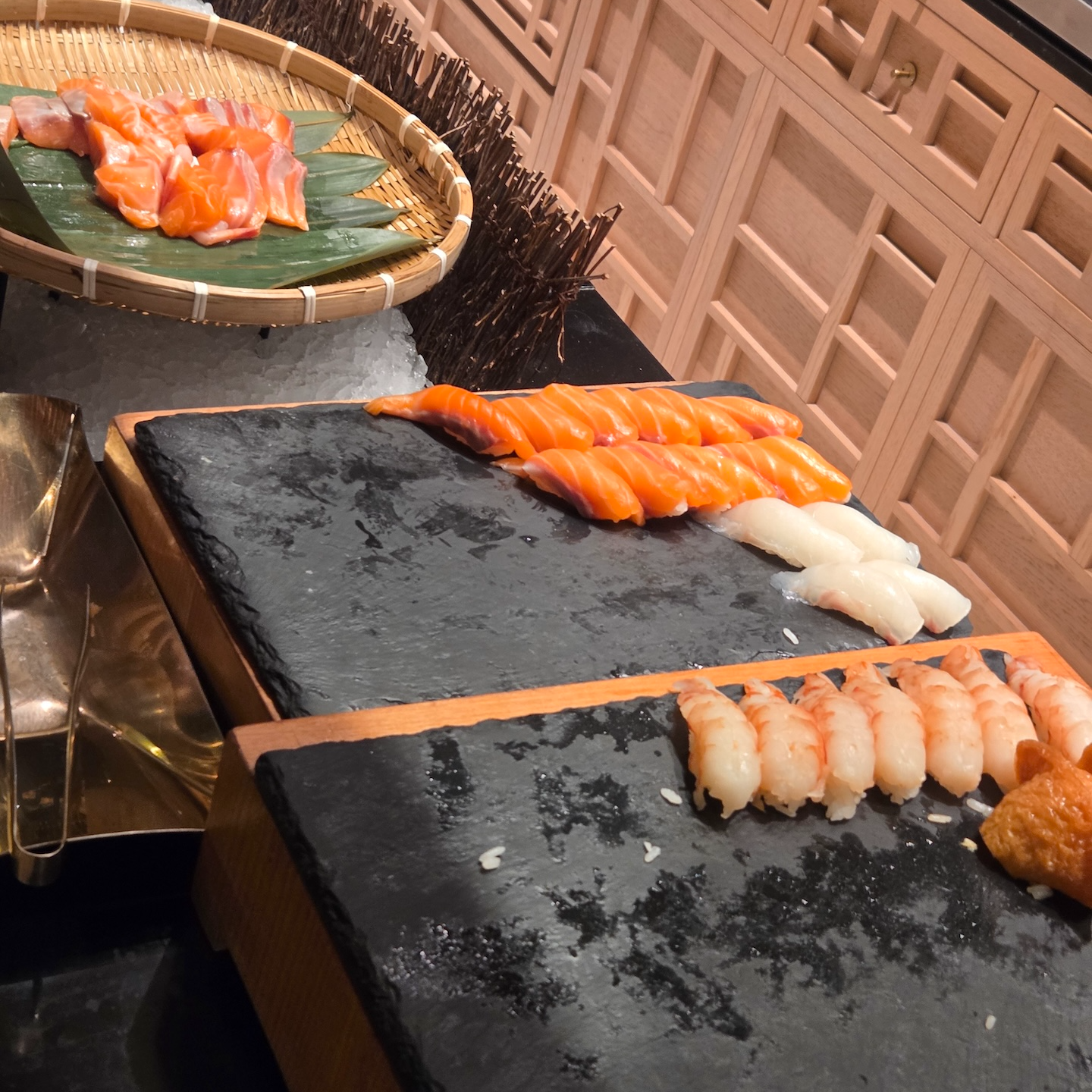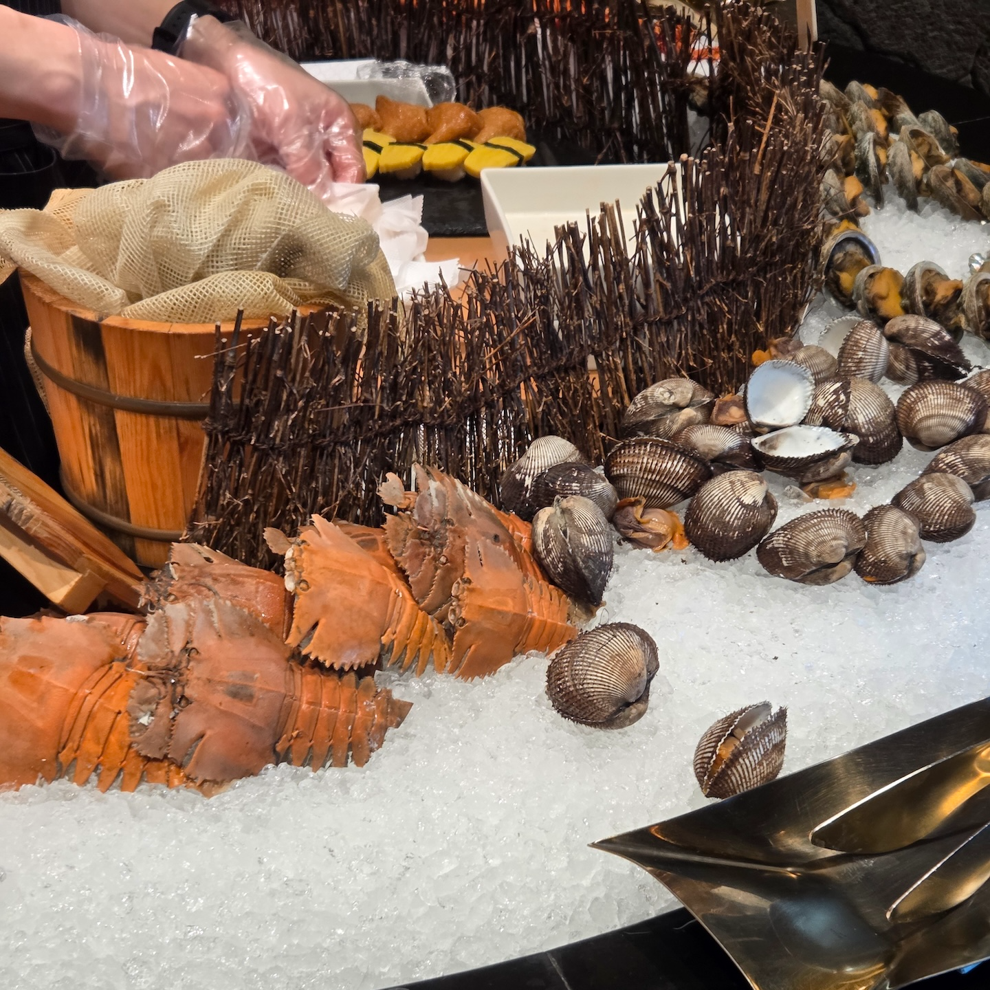 브런치 로얄의 뷔페는 해산물을 중심으로 다양한 핫푸드, 샐러드, 베이커리류로 구성되어 있었습니다. 부채새우, 새우, 꼬막, 전복은 한 번 삶아낸 뒤 차갑게 제공되었고, 회로는 참돔, 연어, 광어, 방어, 단새우 등이 준비되어 있었습니다. 초밥으로는 연어초밥, 광어초밥, 새우초밥, 유부초밥이 제공되었습니다.