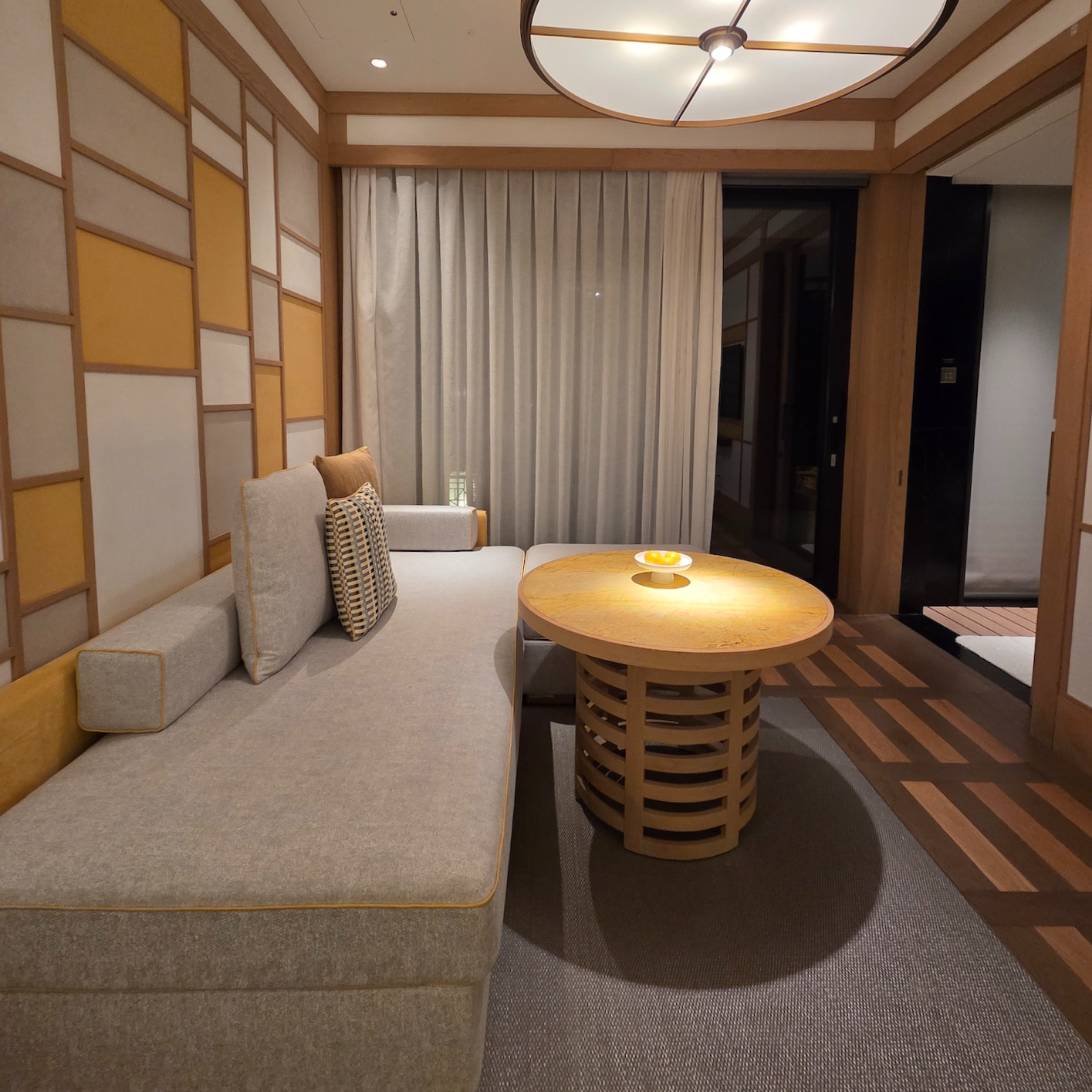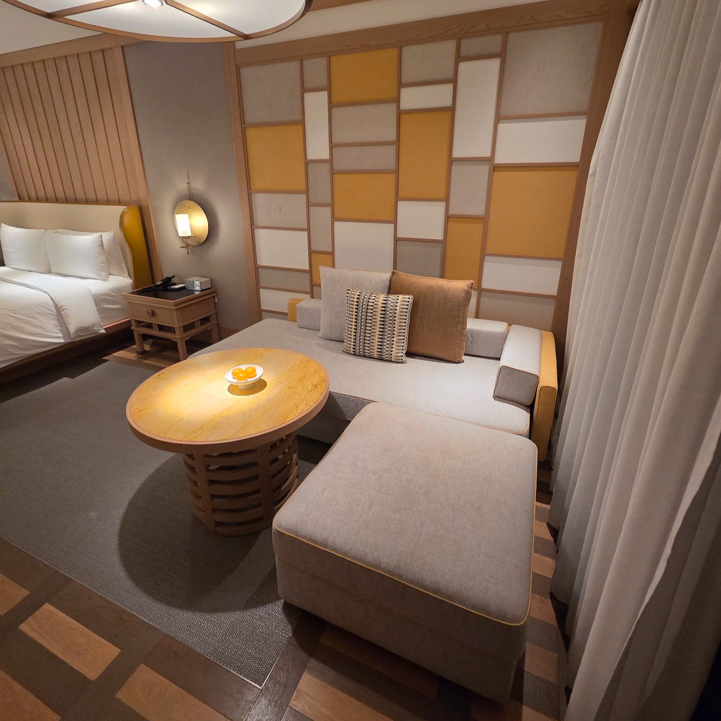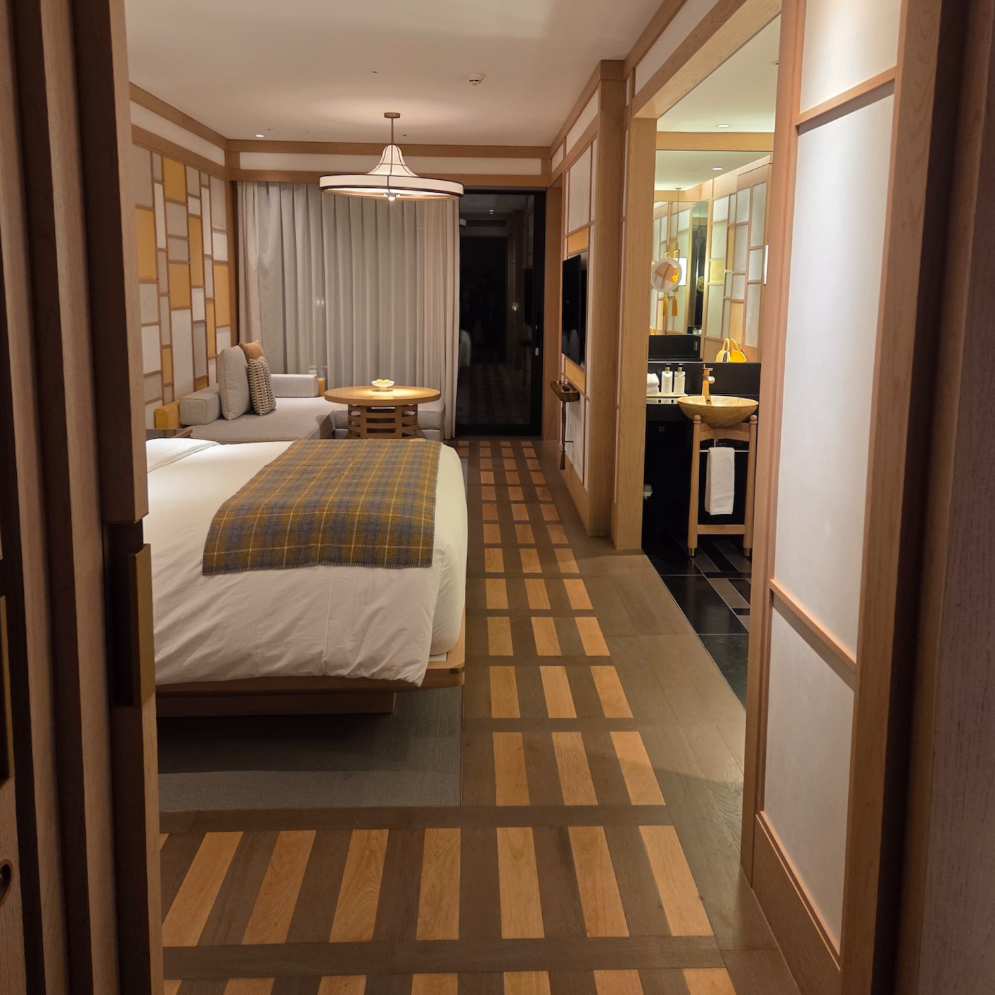 JW 메리어트 제주 리조트 & 스파의 객실은 과하게 화려하지 않으면서도 제주의 요소를 잘 담아 차분하고 단단한 자연의 분위기가 느껴지는 공간이었습니다. 가구와 벽면 장식은 전통 한옥의 비례와 선을 단순화해 현대적으로 해석한 느낌이었고, 불필요한 장식을 최소화해 창밖 풍경이 공간의 주인공이 되도록 설계된 점이 인상적이었습니다. 침대와 소파에서 통창을 통해 바깥 정원 풍경을 쉽게 바라볼 수 있어 객실 안에 머무는 시간 자체가 풍경을 감상하는 경험처럼 이어졌고, 조명 역시 강한 직접 조명 대신 은은한 간접 조명을 사용해 하루를 마무리하는 휴식 공간으로서의 성격을 분명히 보여주었습니다. 전체적으로 이 객실은 ‘럭셔리한 방’이라기보다는, 제주 자연 속에 조용히 머무는 하나의 작은 쉼터처럼 느껴졌습니다.