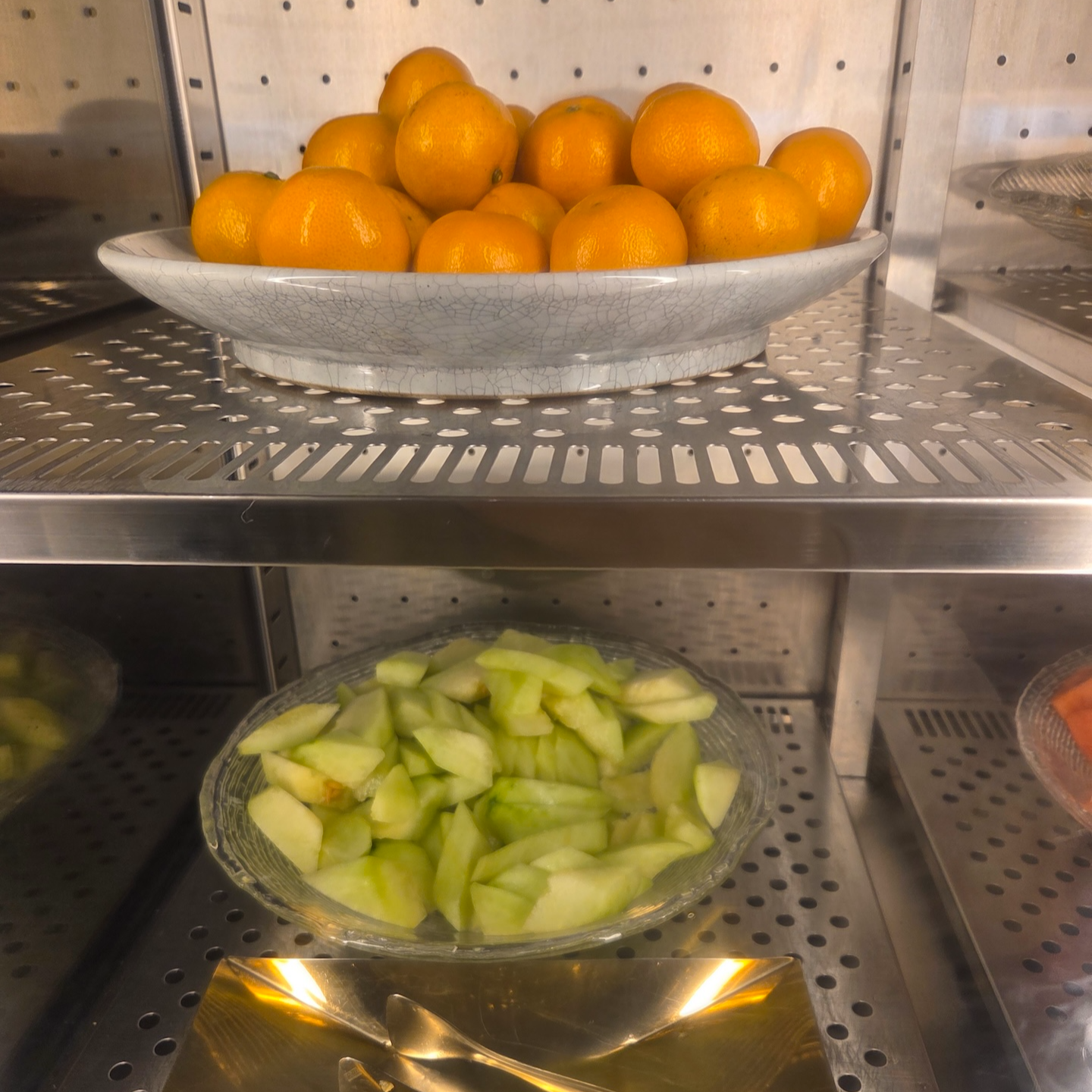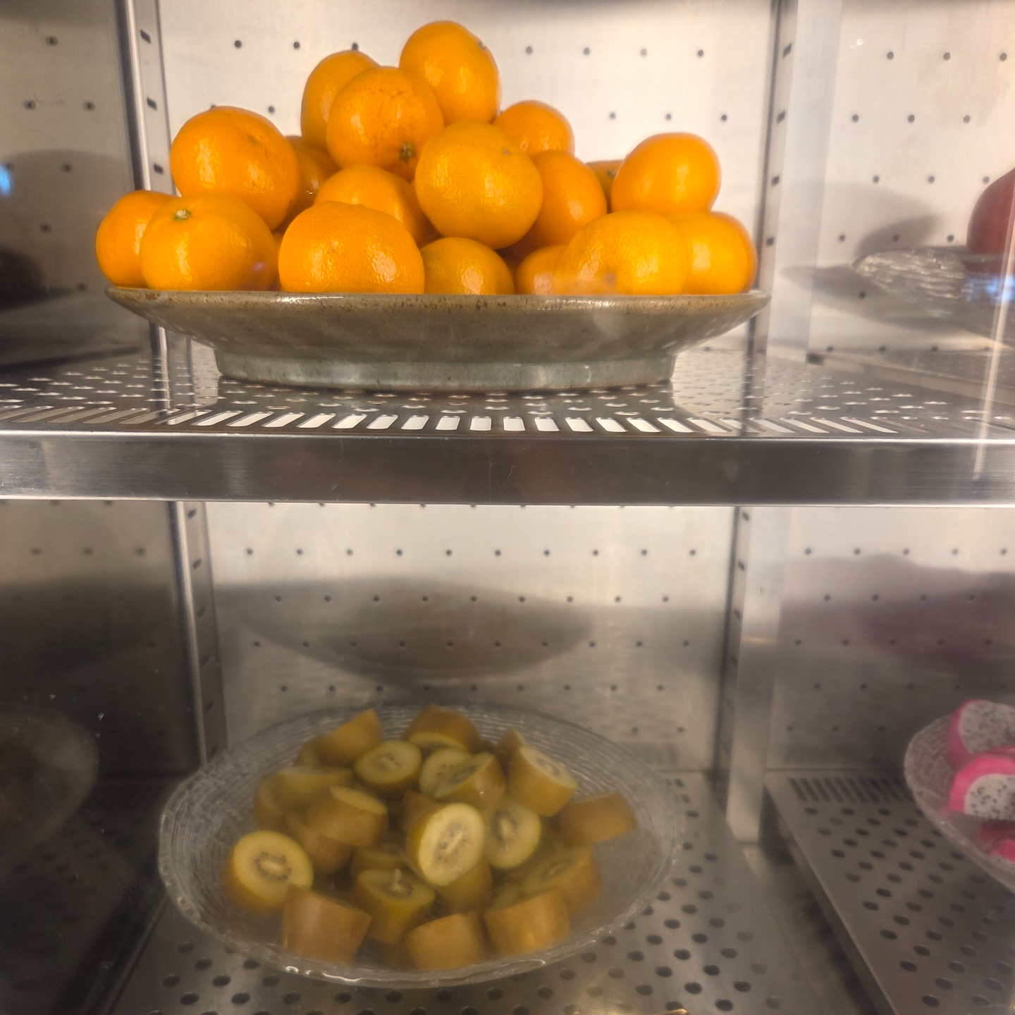 과일은 귤, 멜론, 수박, 오렌지, 키위, 사과, 용과가 제공되었고, 주스로는 사과주스, 감귤주스, 자몽주스가 있었습니다. 탄산음료로는 칠성사이다, 펩시 콜라, 펩시 제로 라임이 준비되어 있었습니다.
