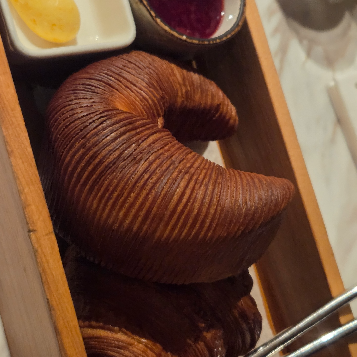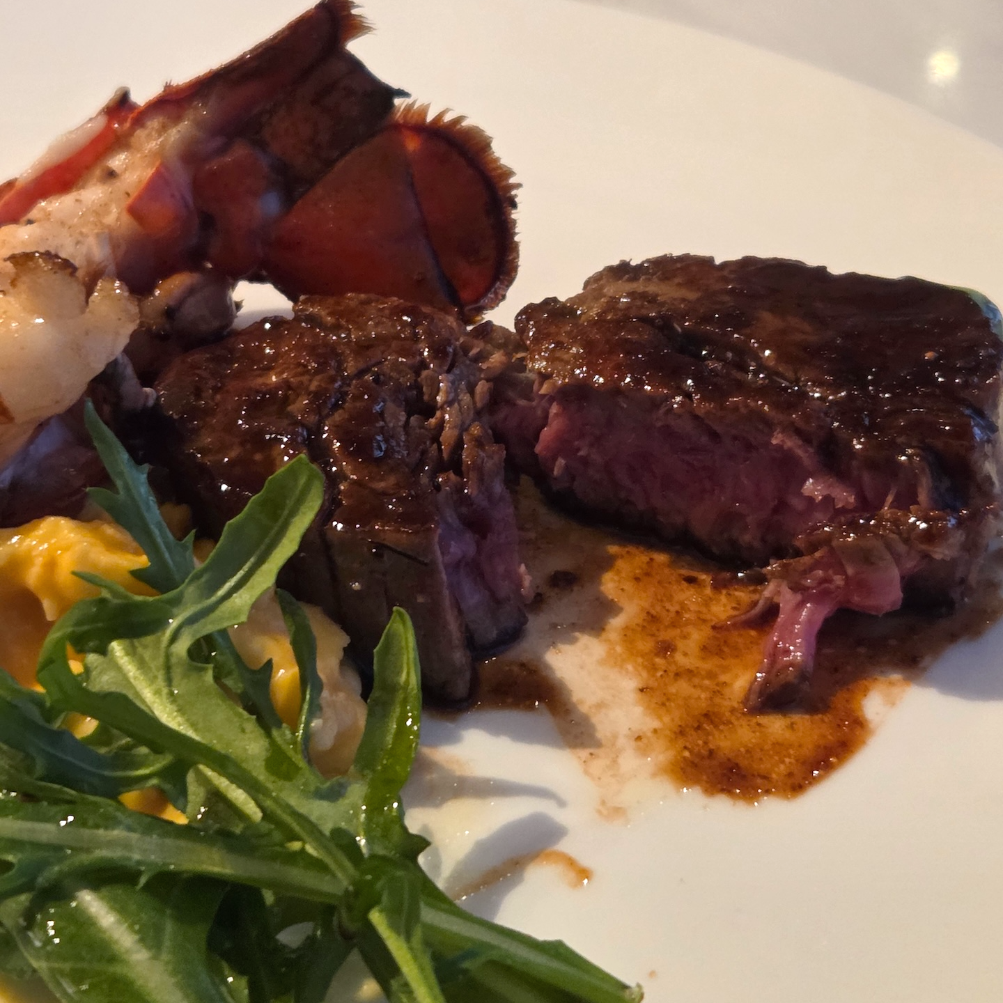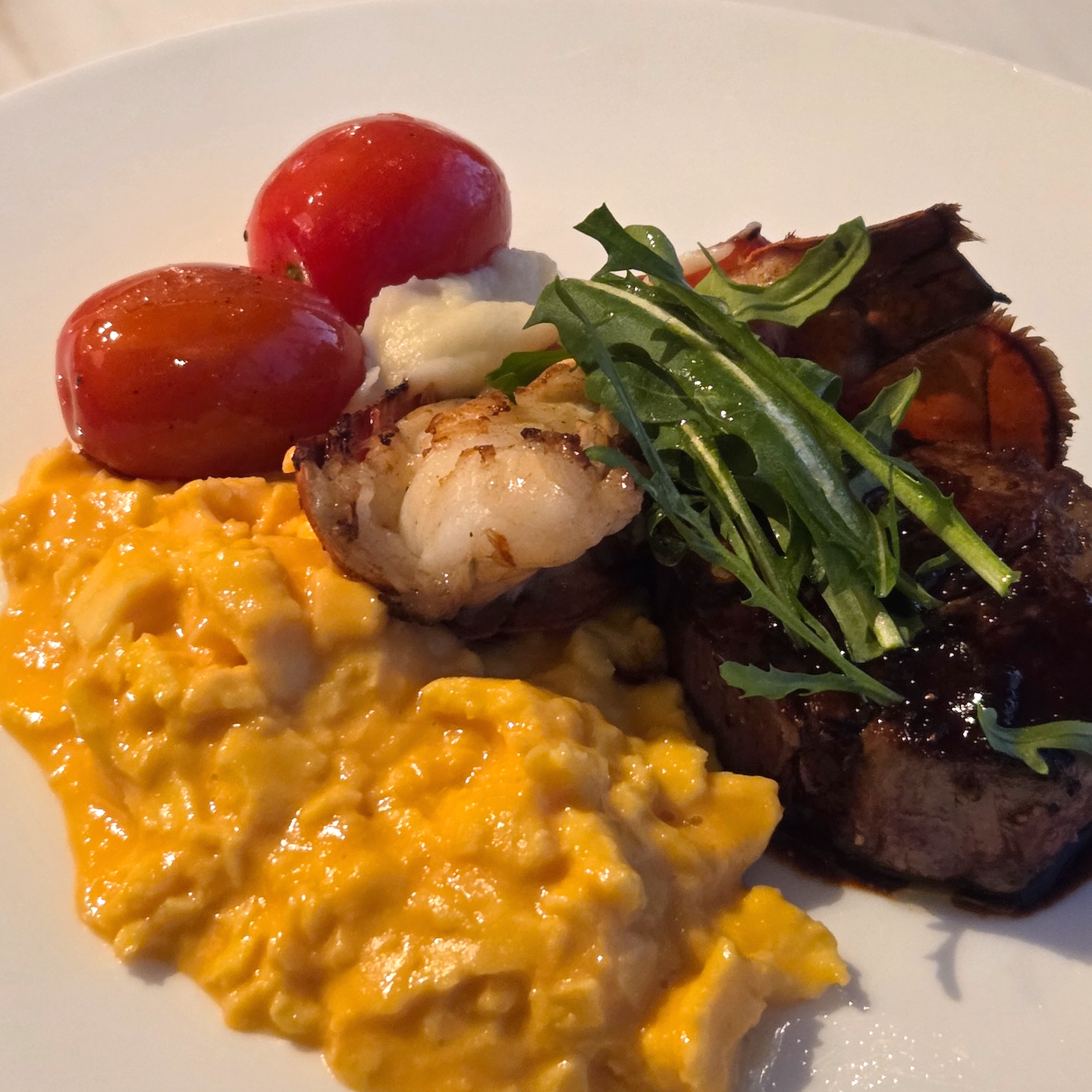 둘째 날에는 스테이크와 랍스터가 함께 나오는 Surf & Turf 메뉴인 JW 에그 로얄을 먹었습니다. 스테이크는 굽기 선택에 대한 안내는 따로 없었고 기본 굽기로 제공되었는데, 시각적으로는 미디엄 레어 정도로 괜찮아 보였으나 실제 식감은 기대만큼 부드럽지는 않아 다소 아쉬웠습니다. 발사믹 베이스의 스테이크 소스는 맛이 과하지 않으면서 고기의 감칠맛을 살려주는 점이 좋았습니다. 랍스터는 테일 반쪽 분량이 제공되었고 크기는 크지 않았지만 익힘이 좋아 탱글한 식감이 잘 살아 있었습니다. 스크램블 에그는 촉촉하고 몽글한 식감으로 간이 세지 않아 계란의 맛이 잘 느껴졌는데, 계란 향이 비교적 강해 이 부분은 호불호가 갈릴 수 있겠다는 생각이 들었습니다. 사이드로 나온 매시드 포테이토는 크림보다 감자 비중이 높은 스타일이라 감자 맛이 잘 느껴졌고, 구운 방울토마토는 겉만 강하게 익혀져 속에 찬기가 남아 있었던 점이 개인적으로는 아쉬웠습니다.