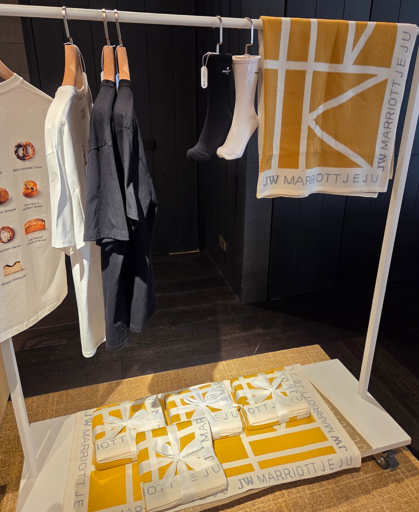빵 외에도 손잡이가 귀여운 JW 귀달이컵, 트레이더 조 에코백과 비슷한 디자인의 JW 메리어트 제주 에코백, 노란 플립플롭과 슬리퍼, 비치백과 지비츠, 니트 재질 담요와 티셔츠 등도 판매하고 있으니, 빵에 관심이 없으시더라도 한 번 들러보셔도 좋을 것 같습니다.