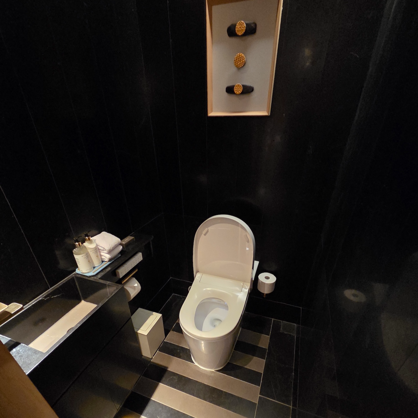 방 문을 열고 들어오자마자 왼쪽에는 변기 공간이 별도로 마련되어 있습니다. 세면대 공간이 침대 앞 오픈형 구조이기 때문에 변기 공간은 독립적으로 분리한 구조로 보였습니다. 변기 공간에는 비데가 장착된 변기와 작은 세면대가 함께 설치되어 있어 사용에 불편함은 없었고, 오히려 2인 이상 투숙 시에는 이렇게 공간이 분리되어 있는 점이 더 편리하게 느껴졌습니다. 변기는 사용자를 감지해 자동으로 커버를 열고 닫으며 물까지 내려주는 방식이라 야간에도 편하게 사용할 수 있었습니다.