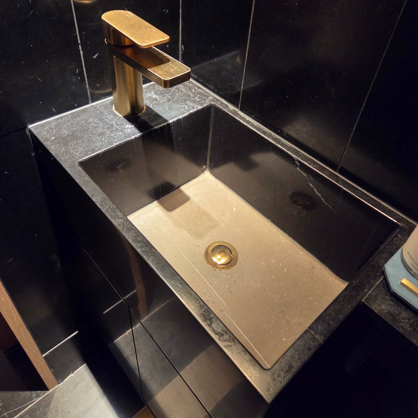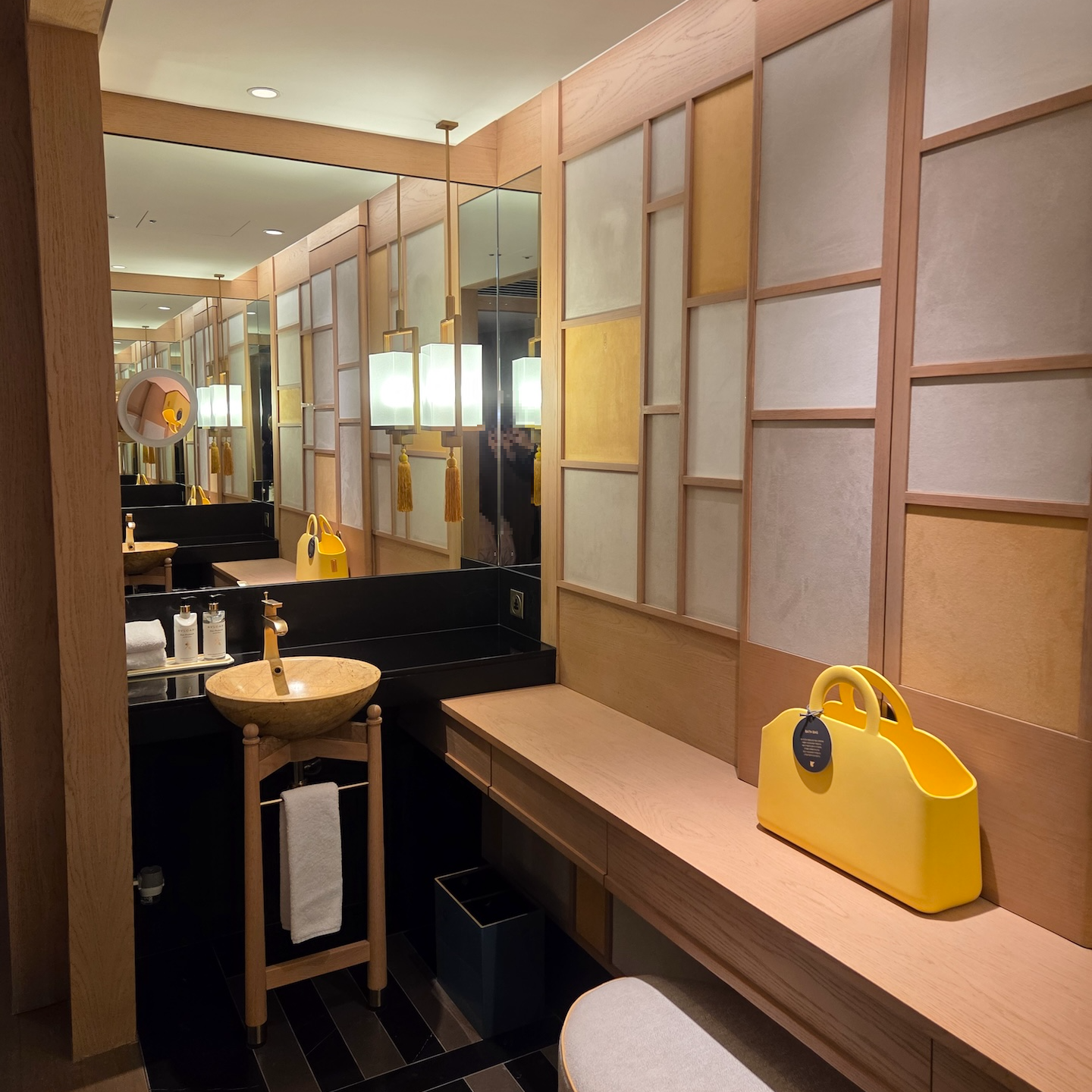 침대 맞은편에는 두 개의 세면대가 설치된 세면 공간이 마련되어 있습니다. 세면대는 공간 양 끝에 배치되어 있고, 상판은 검정 돌 소재, 세면대 자체는 노란 대리석 소재가 사용되었습니다. 세면대 깊이가 아주 깊지는 않아 세수나 양치 시 물이 튀는 경우도 있었지만, 큰 불편함은 없었습니다. 상판 공간이 충분히 넓고 세면대가 2개 설치되어 있어 2인 이상 투숙 시에도 각자의 세면도구를 놓기에 여유로웠습니다. 두 세면대를 연결하는 중앙 서랍 공간은 화장대로 활용할 수 있도록 오토만 의자와 큰 거울이 마련되어 있었고, 헤어드라이어도 이곳에 보관되어 있었습니다.
