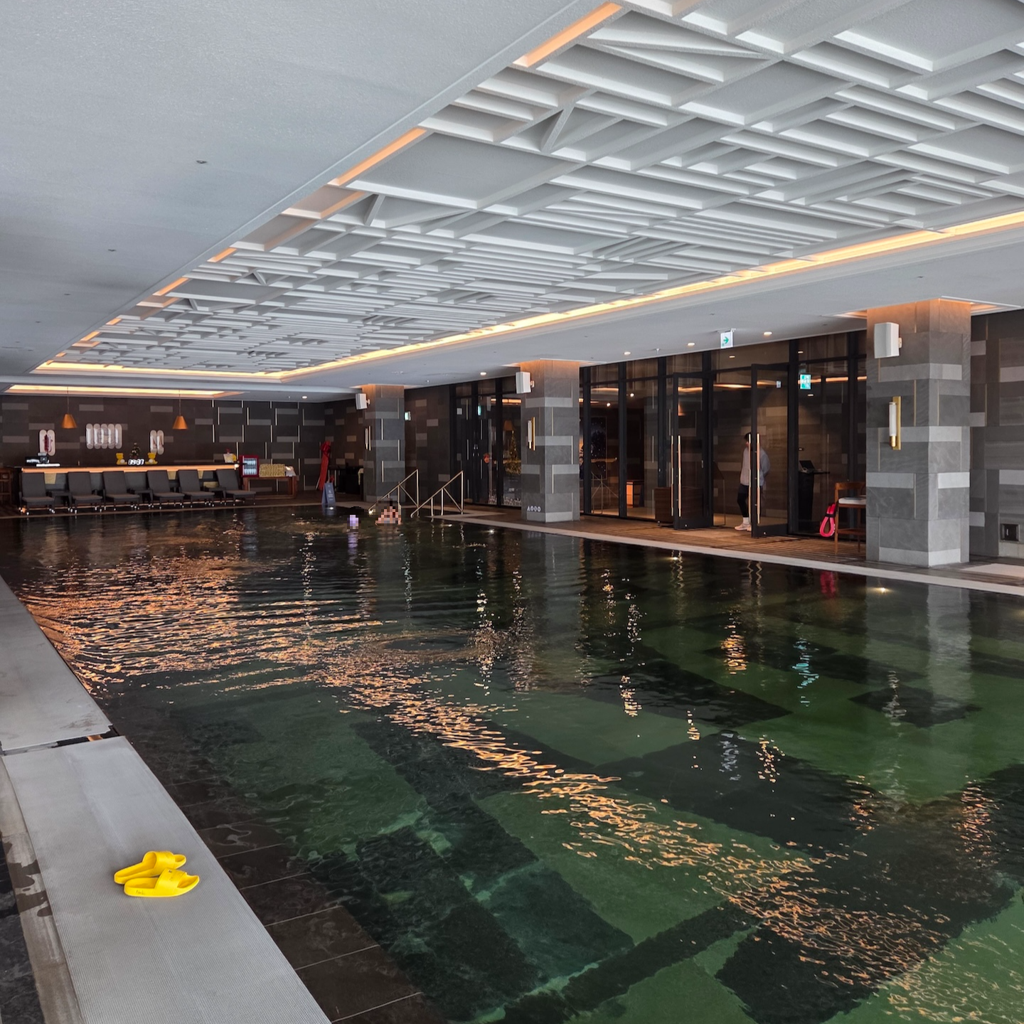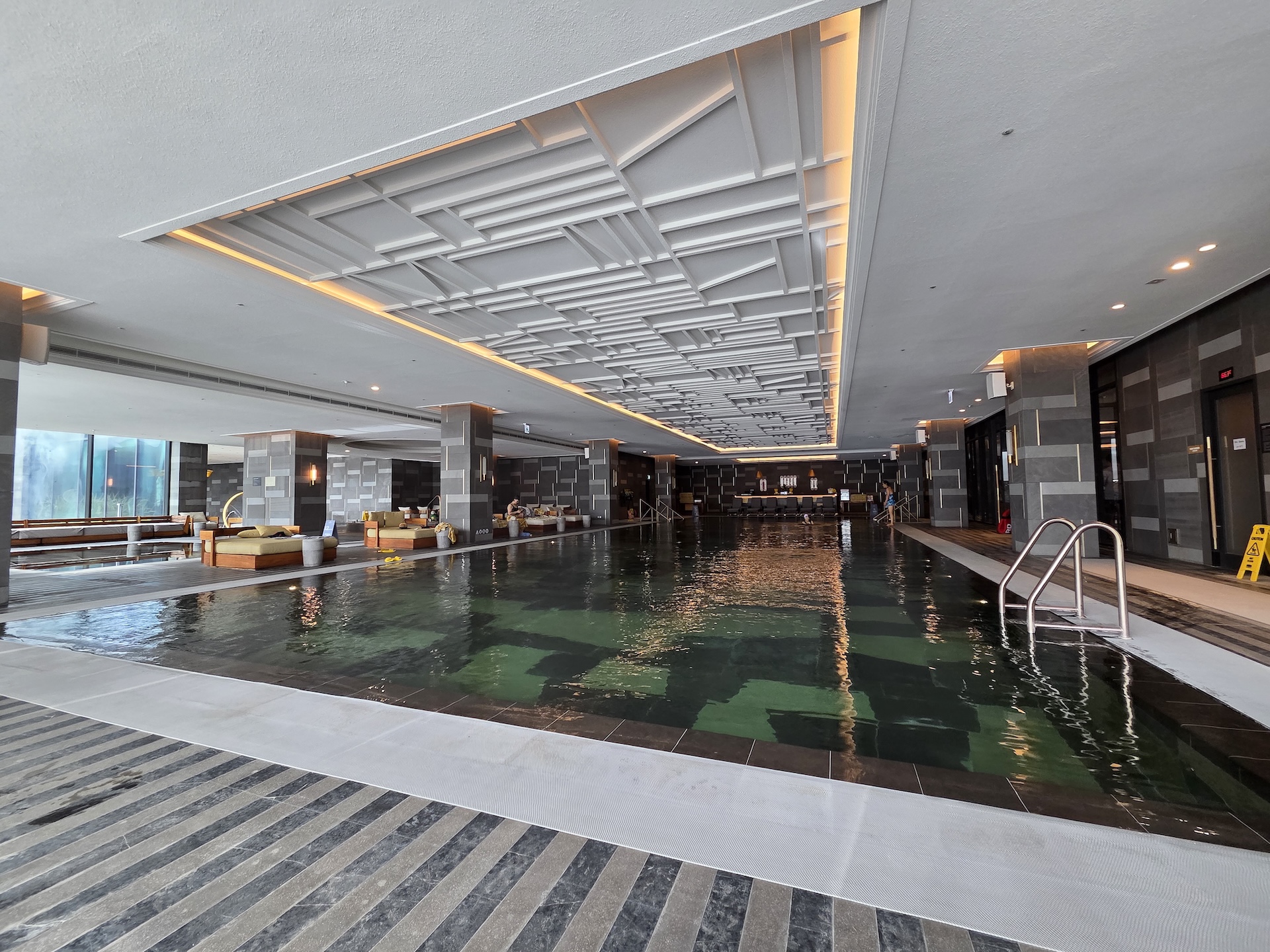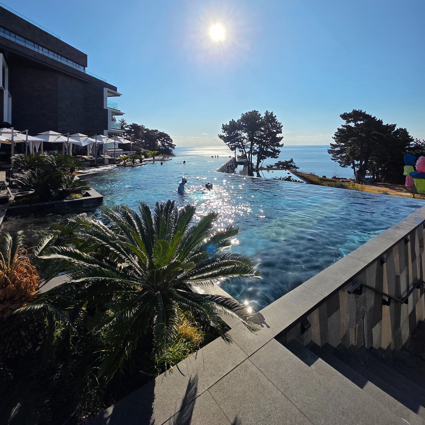 JW 메리어트 제주 리조트 & 스파의 수영장은 실내와 실외의 성격이 분명히 나뉘어 있습니다. 실내 수영장은 본격적인 수영을 하기 좋은 길이와 구조를 갖춘 공간으로, 따뜻한 자쿠지와 아이들이 놀 수 있는 물놀이 공간이 함께 마련되어 있어 성인과 가족 모두 편하게 이용할 수 있었습니다. 반면 실외 수영장은 바다를 정면으로 바라보는 인피니티 풀 형태로, 제주도의 바다와 앞의 범섬을 가장 직접적으로 느낄 수 있는 공간입니다. 겨울에도 온수풀로 운영되어 쌀쌀한 날씨에도 물속에 있을 때는 따뜻하게 이용할 수 있었고, 다만 물 밖으로 나오면 바람 때문에 체감 온도가 급격히 떨어져 이동할 때는 확실히 춥게 느껴졌습니다. 이때는 실내 수영장 공간의 온수 자쿠지나, 실내 수영장 한쪽에 마련된 습식/건식 사우나에서 몸을 덥힐 수 있어 날씨가 쌀쌀하더라도 수영장을 이용하는 데 큰 불편은 없었습니다. 전체적으로 실내는 ‘수영을 위한 공간’, 실외는 ‘풍경과 휴식을 위한 공간’으로 역할이 잘 구분된 수영장이었습니다.