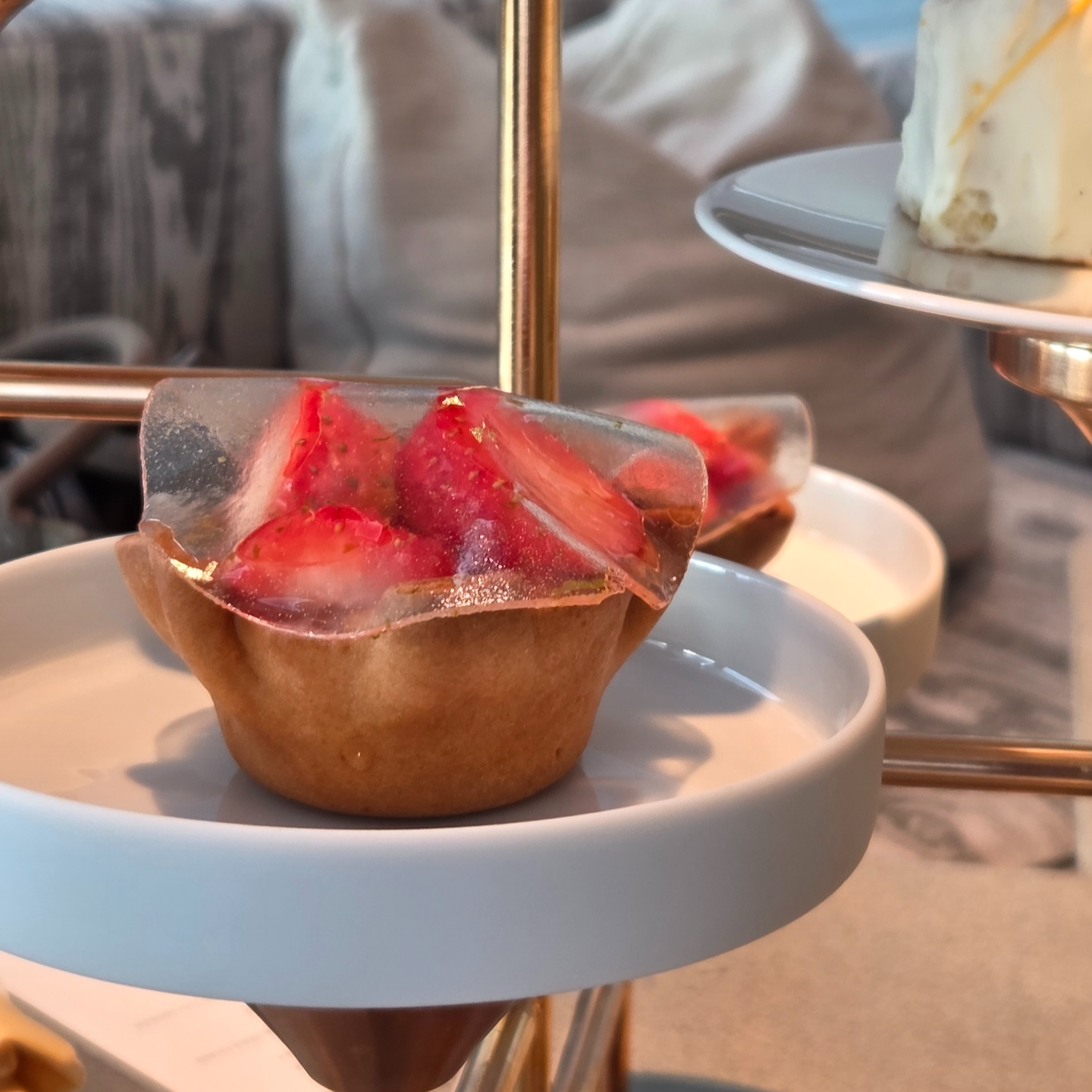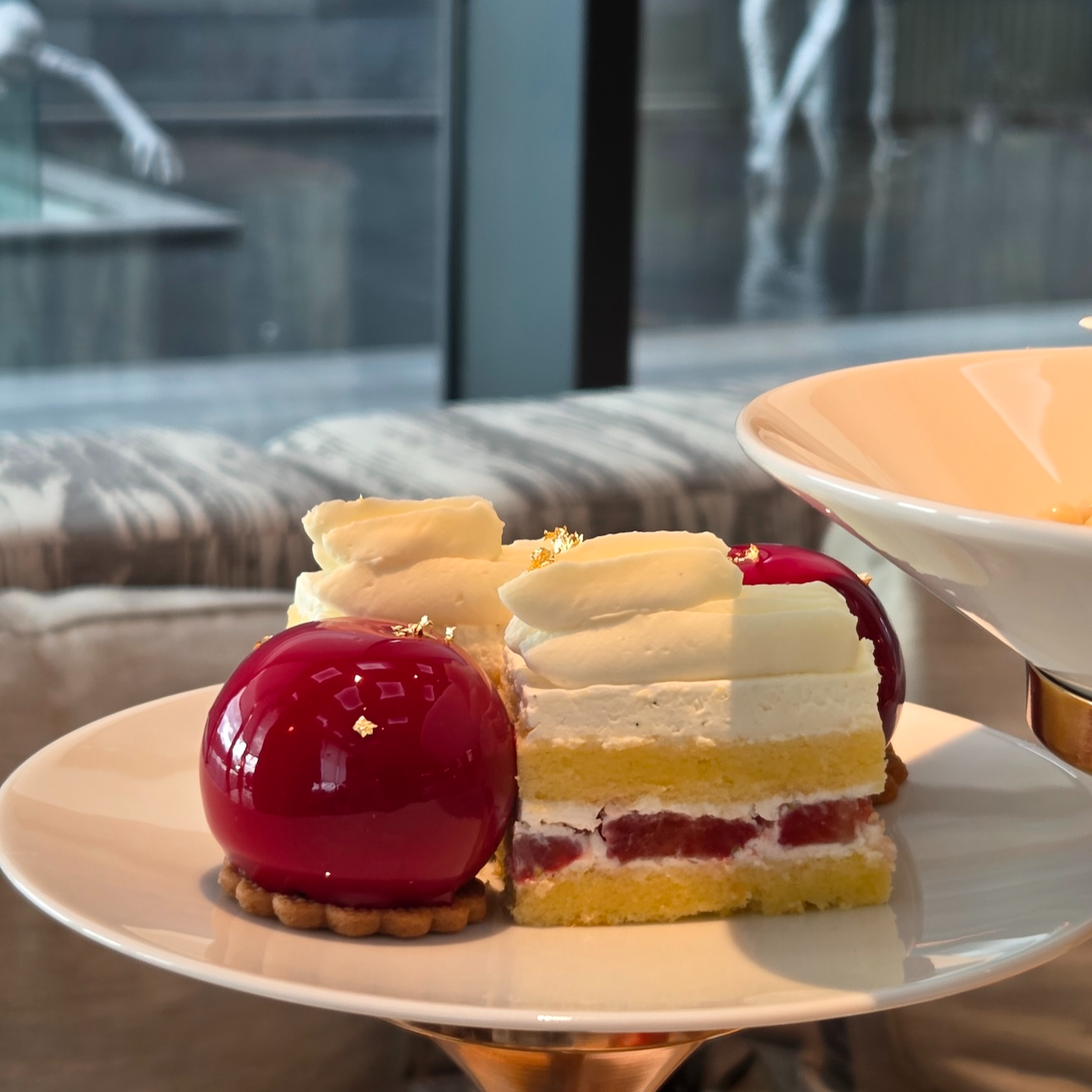 애프터눈 티 세트는 음료를 2잔 주문할 수 있으며, 선택 가능한 음료는 아메리카노, 카푸치노, 애플시나몬 티, 딸기라떼가 있습니다. 저는 일행과 함께 아메리카노, 딸기라떼, 애플시나몬 티를 마셨습니다. 아메리카노는 조식이나 점심 뷔페 때 마실 수 있는 아메리카노와 비슷한 느낌이었지만 달달한 디저트들과 함께하기에 무난했고, 딸기라떼는 집에서 딸기를 잔뜩 넣고 만든 딸기청에 우유를 부어 마시는 듯 달달하면서도 딸기 맛이 진한 라떼였습니다. 가장 인상적이었던 건 애플시나몬 티였는데, 한 모금 마시고 처음 든 생각이 ‘라이트한 뱅쇼 느낌’이었습니다. 직원분께서도 정확히 그렇게 느낀 게 맞다며 뱅쇼 느낌이 나도록 만든 음료라고 설명해주셨습니다. 뱅쇼보다 가볍지만 특유의 따뜻한 느낌은 잘 전달해주고, 단맛·신맛·위에 뿌려진 시나몬의 밸런스도 좋았습니다. 특히 일반적인 잎차처럼 맑지는 않고, 청을 탄 음료처럼 되직하지도 않은 중간 정도의 텍스처가 딱 적당해서 뱅쇼 느낌을 더 잘 살려주는 것 같았습니다.
