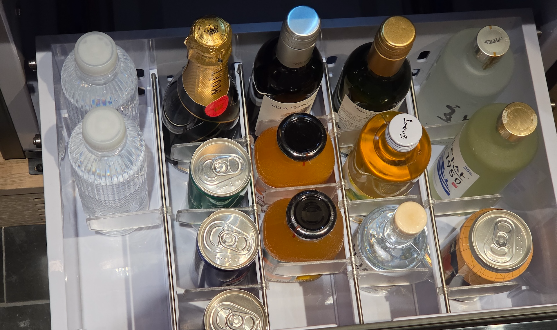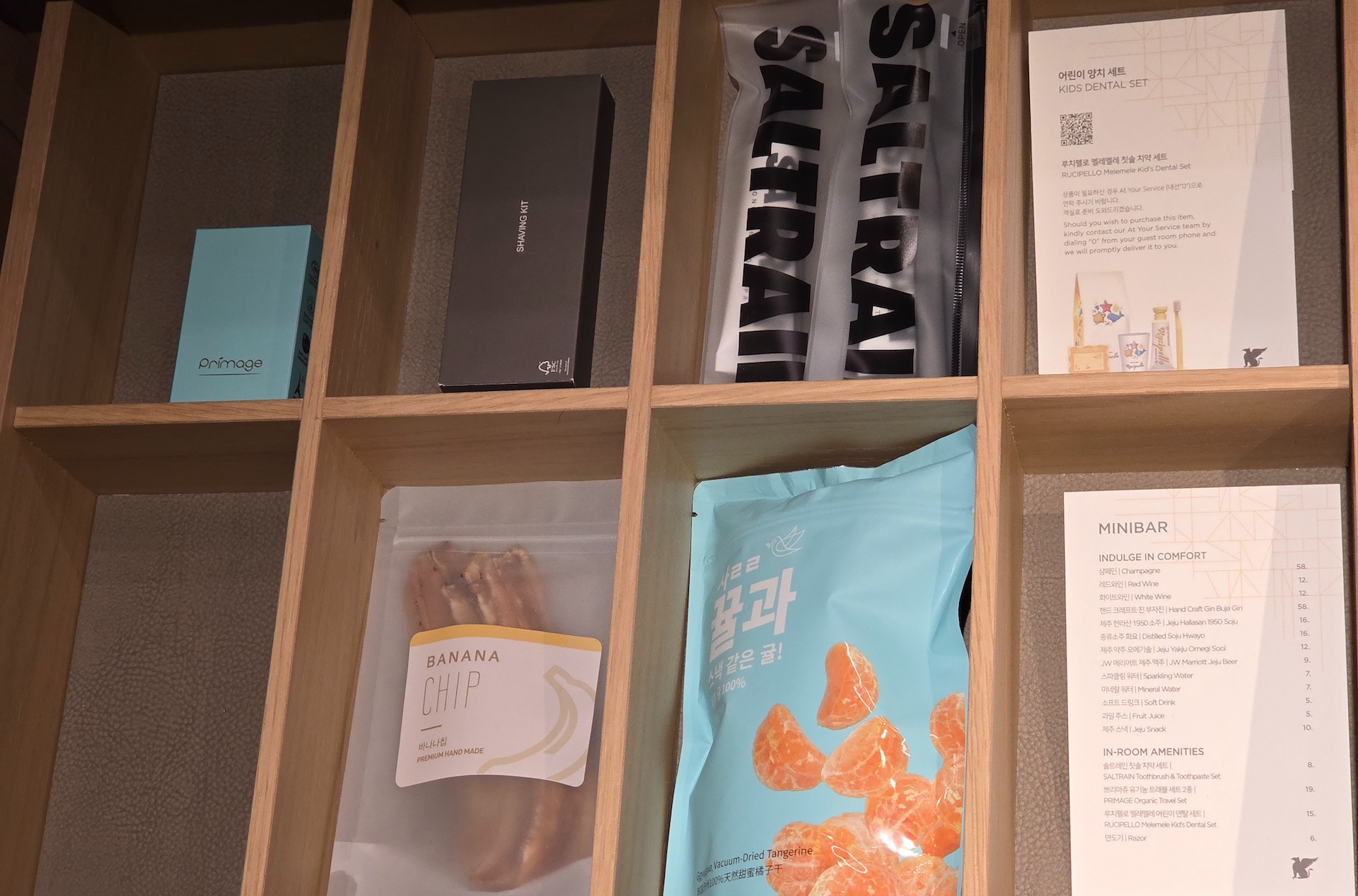 미니바 구성도 인상적이었습니다. 기본적인 샴페인, 레드와인, 화이트와인뿐 아니라 제주 지역 술과 전통주들이 다양하게 준비되어 있었는데요, 제주 한라산 1950 소주, 증류식 소주 화요, 제주 약주 오메기술, JW 메리어트 제주 맥주 등 지역색이 느껴지는 구성이라는 점이 특히 좋았습니다. 생수는 기본적으로 충분히 제공되었고, 턴다운 서비스나 하우스키핑 시에도 넉넉하게 보충해 주셔서 물이 부족하다는 느낌은 전혀 받지 못했습니다.