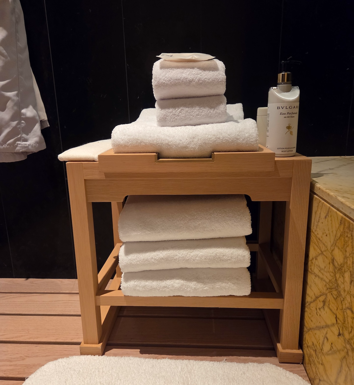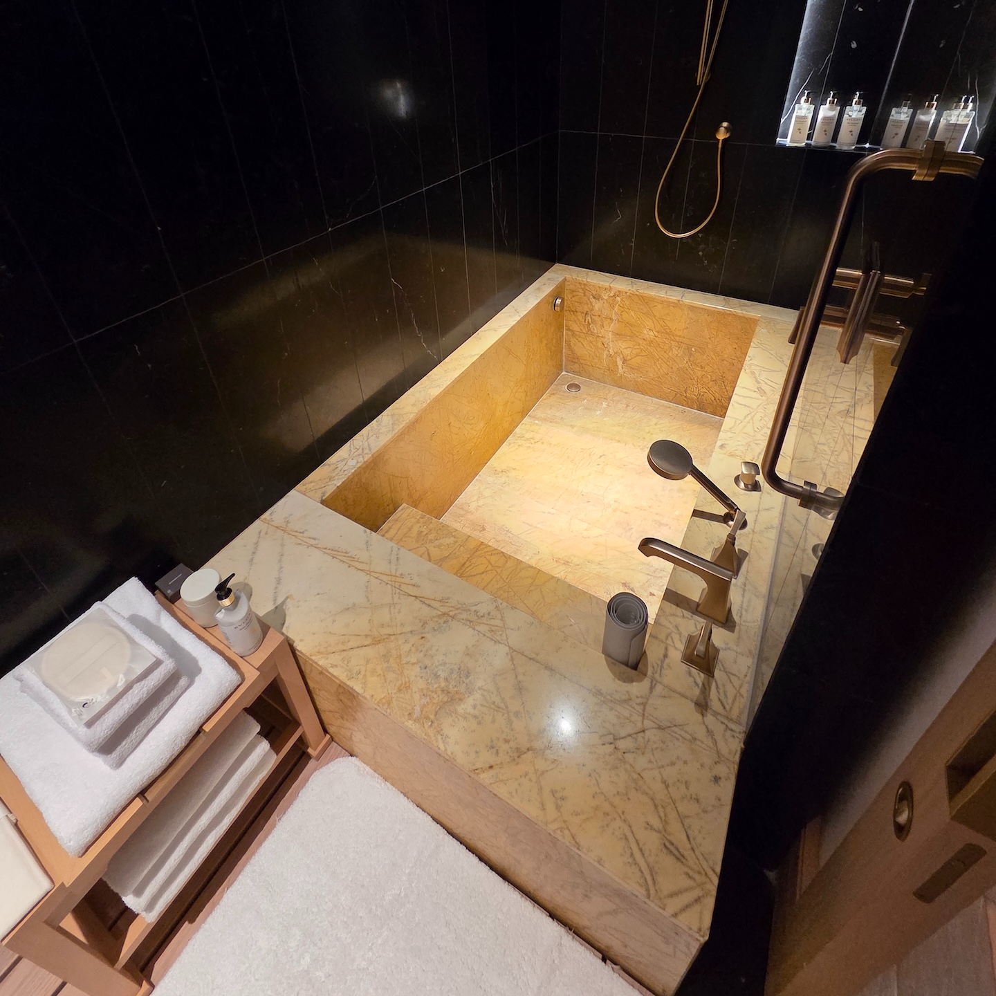 소파 맞은편에는 욕조가 설치된 샤워 공간이 있으며, 세면 공간과 달리 이 욕조 공간은 문을 닫을 수 있도록 분리되어 있습니다. 이 공간에는 노란 대리석으로 제작된 매우 넓은 욕조가 설치되어 있는데, 성인 3명이 들어가도 될 정도로 여유로운 크기였습니다. 욕조 끝에는 샤워기가 설치되어 있어 욕조를 사용하지 않더라도 물 튐 걱정 없이 샤워가 가능했습니다. 욕조 밖 바닥에는 원목 데크가 설치되어 물이 자연스럽게 빠지도록 설계되어 있었고, 옆에는 수건이나 옷을 걸 수 있는 후크와 선반도 마련되어 있었습니다. 다만 컨디셔너 사용 후에는 대리석 욕조 바닥이 상당히 미끄러워지기 때문에, 반드시 비치된 미끄럼 방지 매트를 사용하는 것을 추천드립니다. 또한 제가 투숙한 객실을 포함해 일부 객실의 경우 욕조 공간 블라인드를 내리지 않으면 외부에서 내부가 보일 수 있어 샤워 시 블라인드를 내리는 것이 필요합니다.
