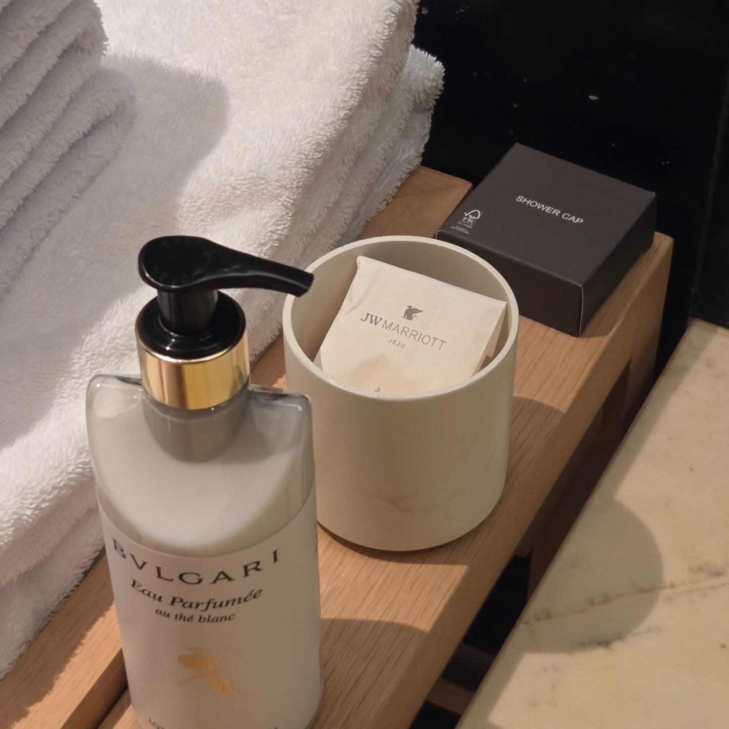 JW 메리어트 제주 리조트 & 스파에서는 정부 정책상 무료로 제공이 불가능한 어매니티를 제외하고, 투숙에 필요한 대부분의 어매니티를 충분히 제공합니다. 먼저 욕실 어매니티로는 불가리 제품이 제공되는데요, 샤워가 가능한 욕조 공간에는 샴푸, 컨디셔너, 샤워젤, 바디로션이, 세면대와 변기 공간에는 핸드 워시와 핸드 로션이 각각 준비되어 있어 상황에 따라 사용하기 편리했습니다. 욕실에는 JW 메리어트 제주 리조트 & 스파에서 자체 제작한 유자와 허브 성분이 들어간 배쓰솔트도 제공되었고, 샤워 루파 역시 손에 끼워 사용하는 짧은 타입 1개와 등을 닦을 수 있는 긴 타입 1개, 총 2개가 준비되어 있다는 점이 인상적이었습니다. 샤워 가운도 2벌이 준비되어 있었으며, 타월 역시 종류별로 넉넉하게 제공되어 샤워 후나 자쿠지, 욕조 이용 후에도 부족함 없이 사용할 수 있었습니다.