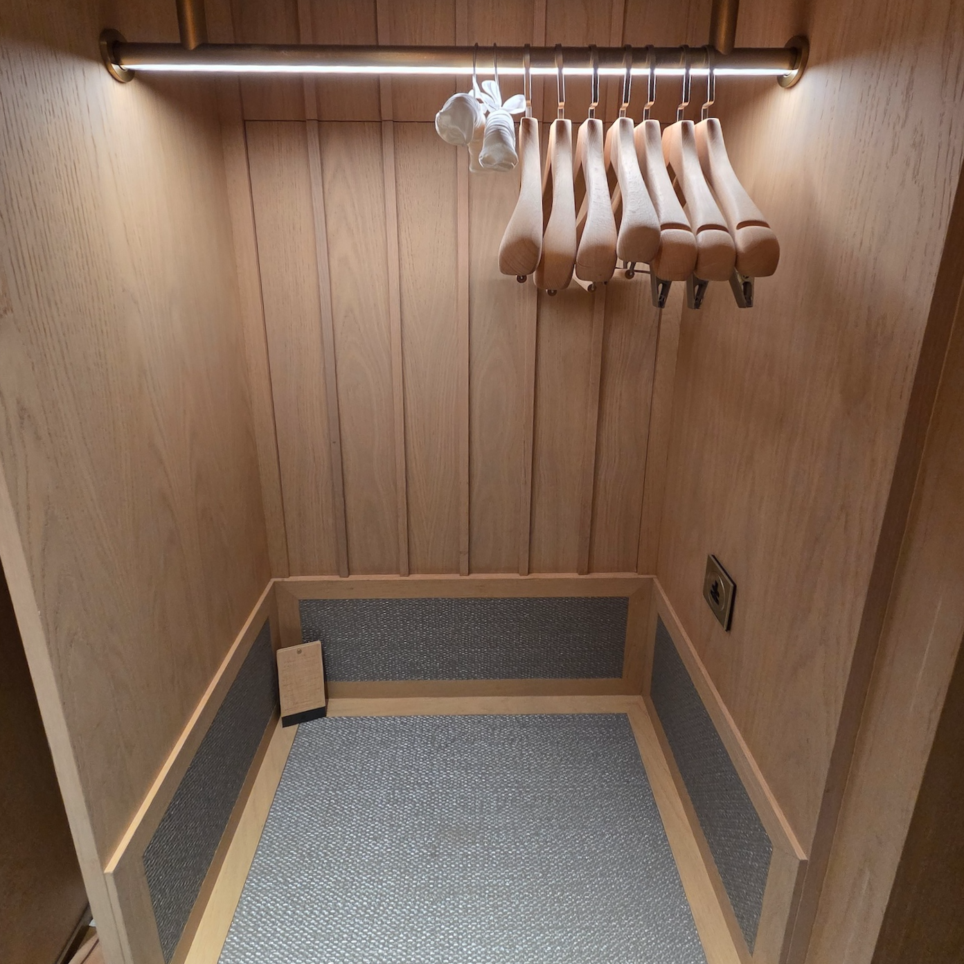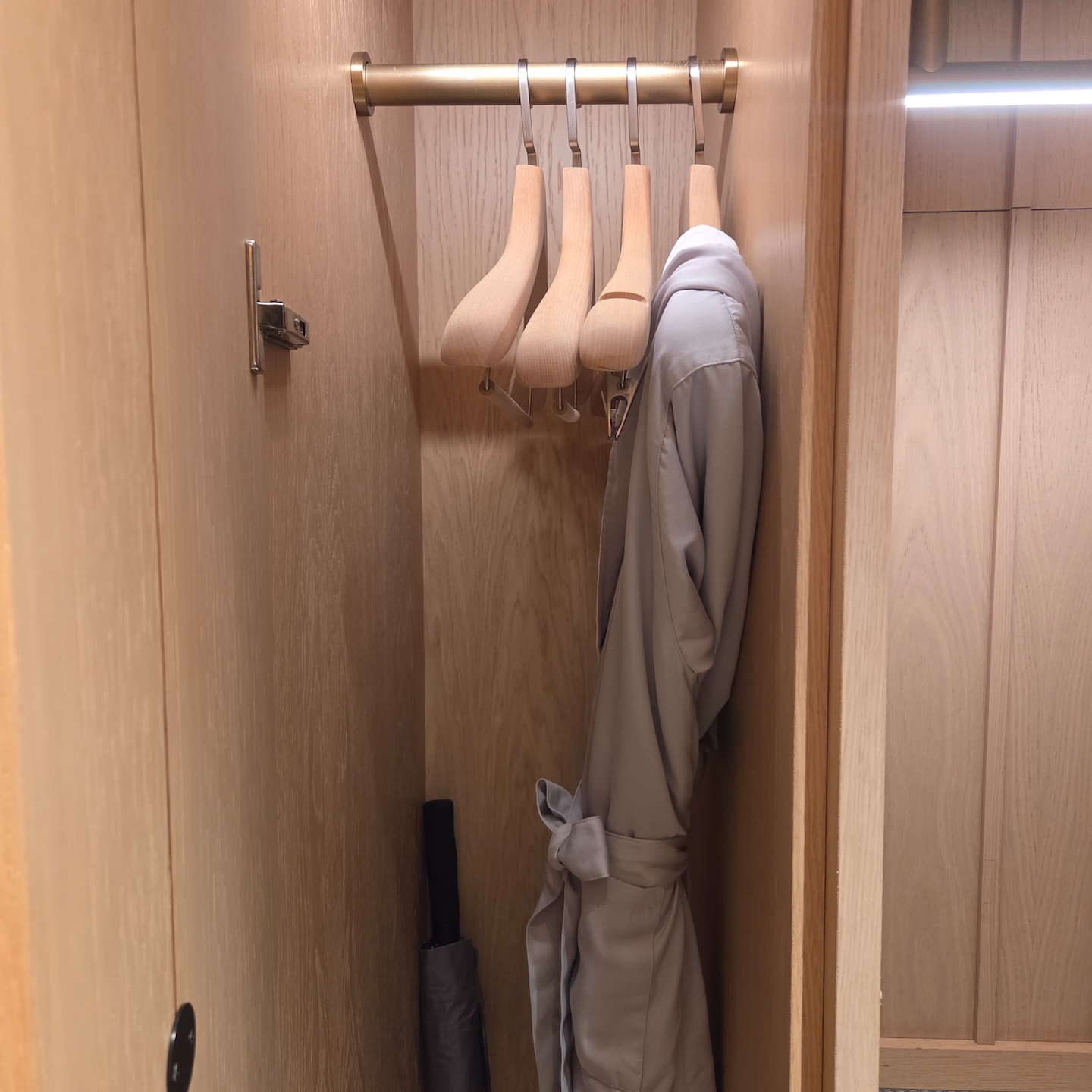 그 외 룸 어매니티로는 슈트리, 슈미트, 구두솔, 구두주걱 등 신발 관련 용품부터 대여 가능한 우산, 넉넉한 수량의 나무 옷걸이, 스팀 다리미까지 잘 갖춰져 있었습니다. 기본으로 제공되는 슬리퍼는 푹신하고 품질이 매우 좋아 지금까지 이용했던 호텔 슬리퍼 중에서도 가장 만족스러운 수준이었습니다. 또한 수영장과 온천 이용 시 편리하게 사용할 수 있도록 물에 젖지 않는 전용 목욕 가방이 준비되어 있다는 점도 인상적이었습니다.