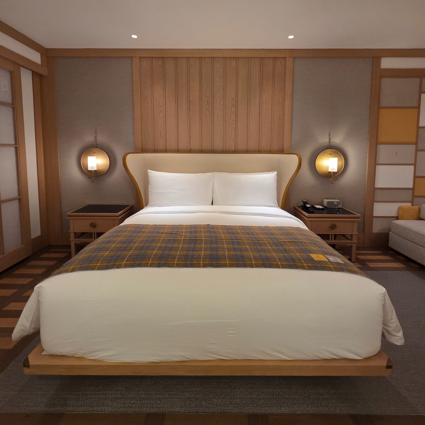 방 문을 열고 들어서면 가장 먼저 넓은 거실 공간이 눈에 들어옵니다. 거실 공간 중 문과 가까운 쪽에는 나무로 만들어진 침대 프레임과 흰색과 노란색 가죽으로 마감된 헤드보드가 사용된 킹 사이즈 침대 1개가 놓여 있습니다. 침대 헤드보드는 직선이 아닌 완만한 곡선으로 마무리되어 있어, 침대에 누웠을 때 공간 전체가 조금 더 부드럽고 포근하게 느껴졌습니다.