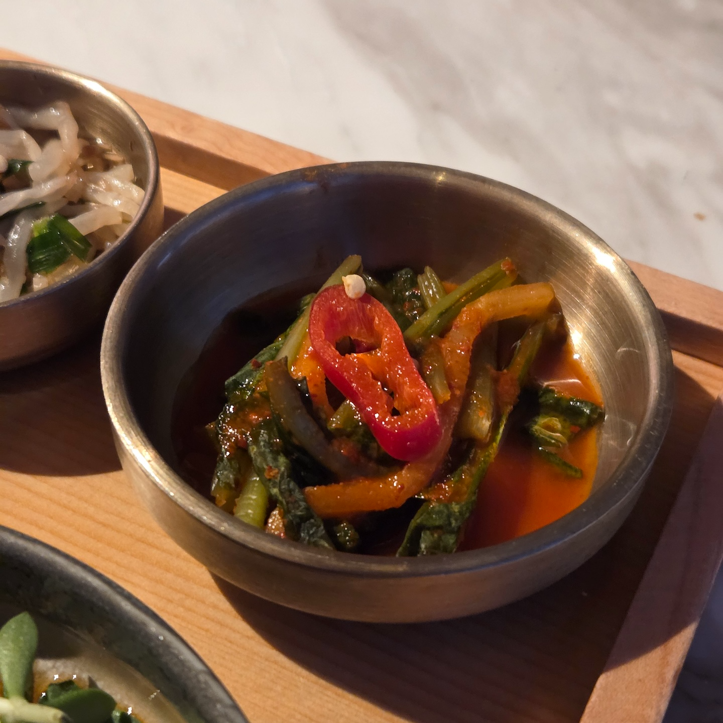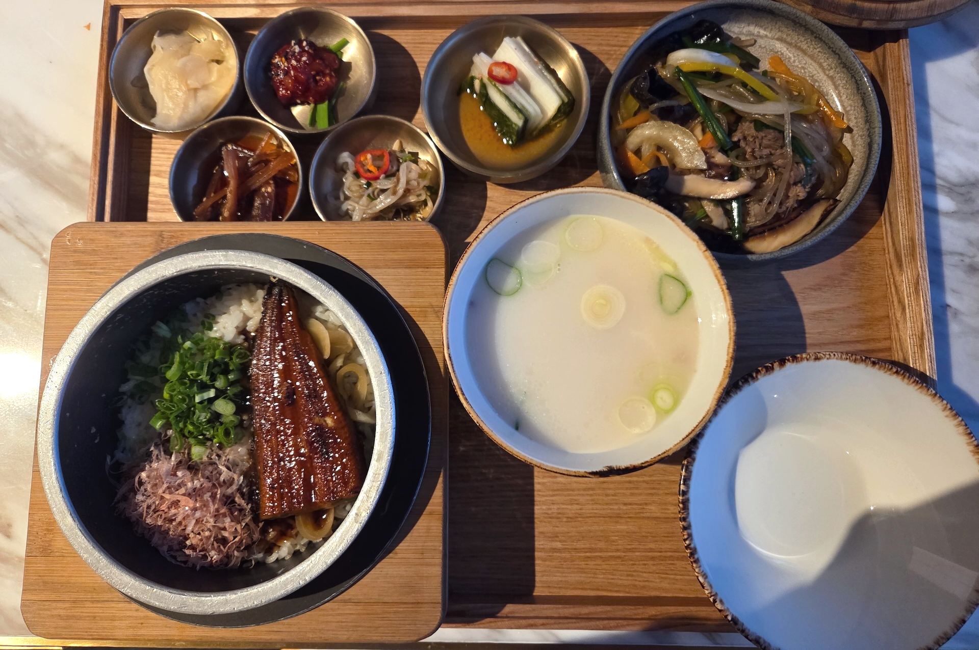 메인 메뉴로는 첫째 날 JW 반상, 둘째 날 JW 에그 로얄, 셋째 날 매생이 굴 수제비를 선택했습니다. 첫째 날 JW 반상은 장어 솥밥과 곰탕, 잡채, 그리고 다섯 가지 반찬이 한 트레이에 담겨 나왔습니다. 장어 솥밥은 달달한 간장 맛과 장어의 고소함이 잘 어울렸고, 함께 나온 생강 초절임과의 궁합도 좋았습니다. 다만 솥밥에 참기름이 다소 많이 들어가 전체적으로 오일리한 느낌이 강했던 점은 아쉬웠습니다. 곰탕은 기본 간이 잘 잡혀 있었고, 고소함이 진하게 느껴지는 만족스러운 맛이었습니다. 잡채는 채소가 과하지 않게 조리되어 식감과 향이 잘 살아 있었고, 당면 비중이 높지 않아 개인적으로 선호하는 스타일이었습니다. 반찬으로 나온 물김치는 간이 세지 않으면서도 아삭했고, 창난젓은 특유의 향이 과하지 않아 부담 없이 먹기 좋았습니다. 숙주나물과 우엉조림 역시 각각 식감과 간이 잘 맞아 전반적으로 완성도가 높았습니다.