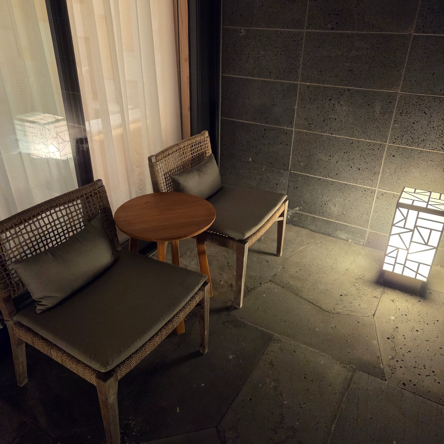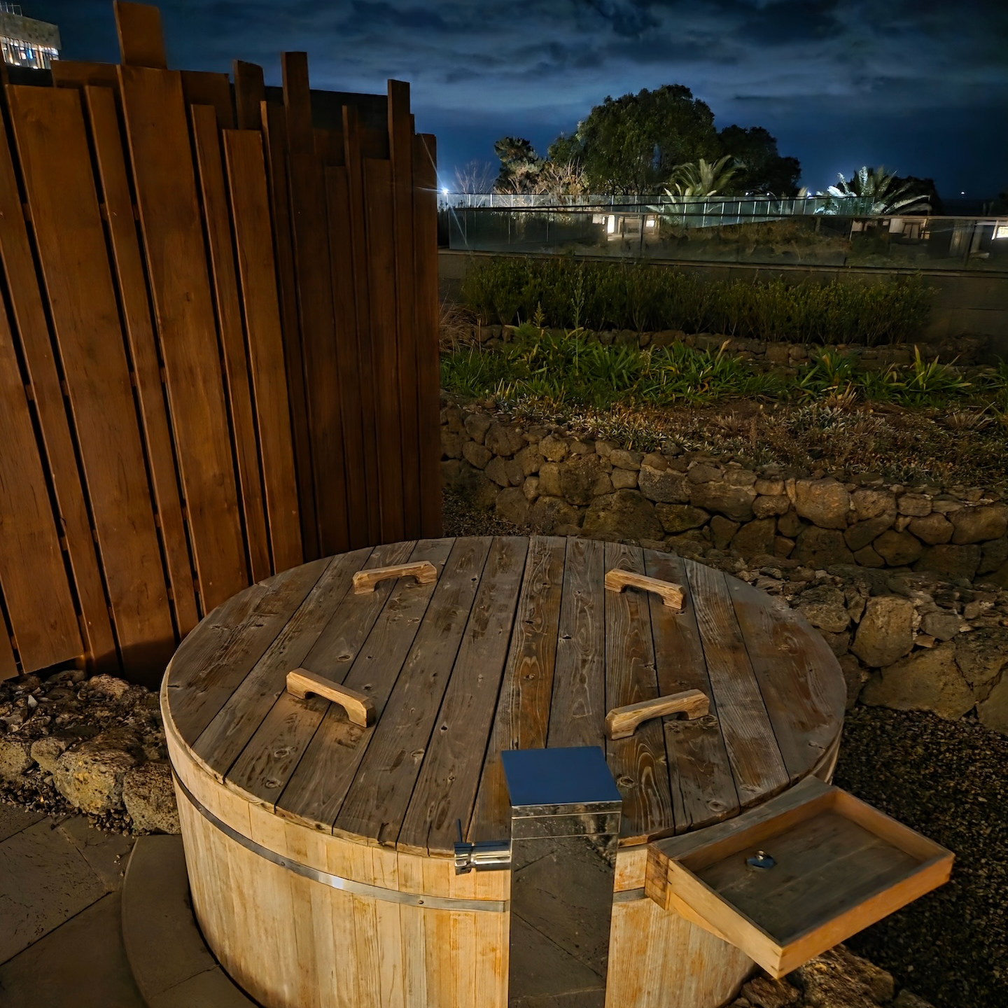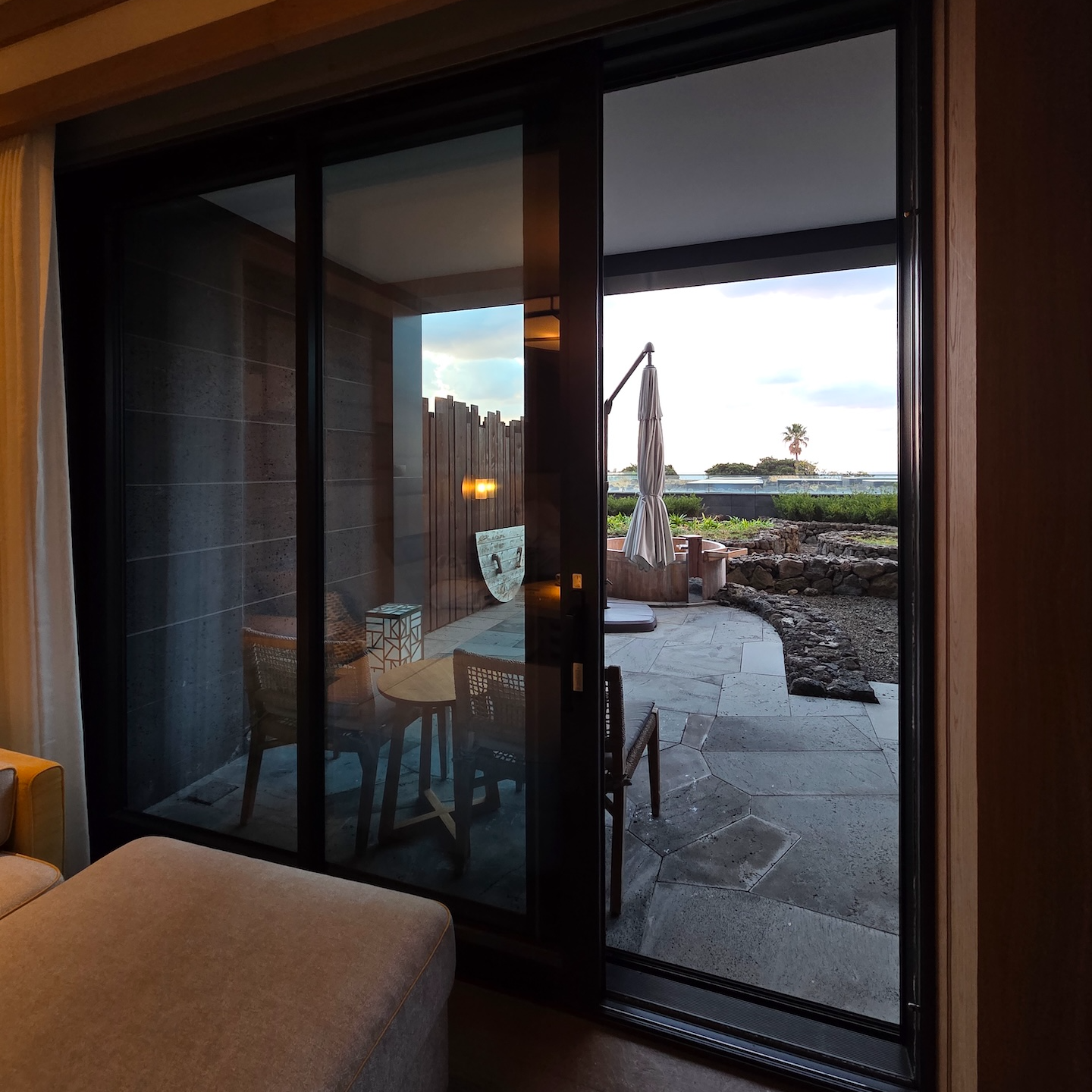 문을 열고 밖으로 나가면 어두운 현무암 계열의 돌로 마감된 테라스가 있습니다. 테라스에는 의자 2개와 사이드 테이블이 놓여 있어 밖에 앉아 차를 마시며 시간을 보내기 좋았습니다. 제가 투숙한 객실에는 자쿠지가 함께 마련되어 있었는데, 자쿠지는 테라스보다 약간 낮은 위치에 설치되어 있었습니다. 크기는 3명이 함께 이용해도 충분할 정도였지만, 물을 채우는 데에는 최소 30분 정도가 필요했습니다. 자쿠지는 투숙객 교체 시마다 청소가 이루어지며, 나뭇잎이나 이물질을 방지하기 위해 나무 커버로 덮여 있었습니다. 정면은 가든 뷰로 트여 있고, 좌우는 나무 펜스로 구분되어 있지만, 앞쪽 가든 공간은 다른 투숙객들도 이동할 수 있는 구조이고 위층 테라스에서는 자쿠지가 보일 수 있기 때문에 이용 시 반드시 수영복을 착용해야 합니다. 또한 야외 공간이다 보니 방음이 거의 되지 않는 점도 참고하시면 좋겠습니다.