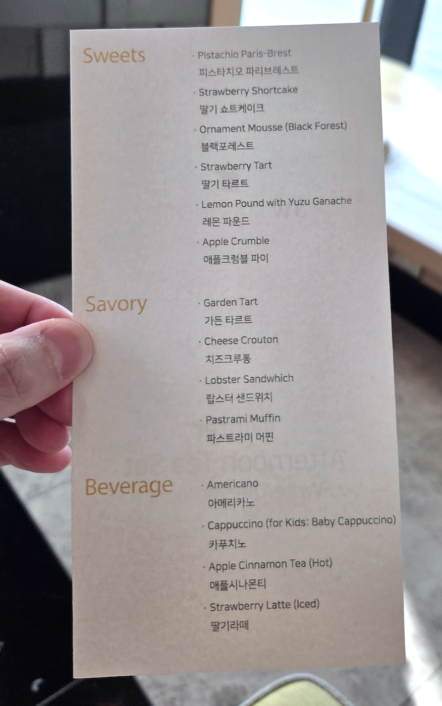 더 라운지에서는 낮 시간대에 애프터눈 티를 이용할 수 있습니다. 애프터눈 티는 1일 전까지 사전 예약이 필요하며, 네이버 플레이스 또는 전화로 예약할 수 있습니다. 제가 방문했을 때는 ‘Winter Afternoon Tea Set, Write Your Moment’라는 주제로 진행되었고 가격은 2인 기준 100,000원이었습니다. 참고로 메리어트 본보이 더 베스트 신한카드를 소지한 투숙객은 조식 외에도 이 애프터눈 티에 5만 원 조식 할인권을 사용할 수 있습니다. 다만 이 할인을 적용하려면 이용 당일 오전 10시 30분부터 오후 11시 사이에 더 라운지에 방문해 5만 원을 사전 결제해야만 혜택을 받을 수 있습니다. 테마는 ‘Write Your Moment’라는 이름 그대로 ‘기록’이었는데, 세트를 즐기며 기록을 남길 수 있는 편지지를 함께 주셨고 메모를 작성해 봉투에 넣어 나갈 때 직원에게 전달하면 새해에 적힌 주소로 보내준다고 안내해주셨습니다. 애프터눈 티를 마시면서 이런 경험을 해본 적은 없었는데, 확실히 이런 작지만 특색 있는 요소들이 전체 경험의 만족도를 올려주는 것 같습니다.