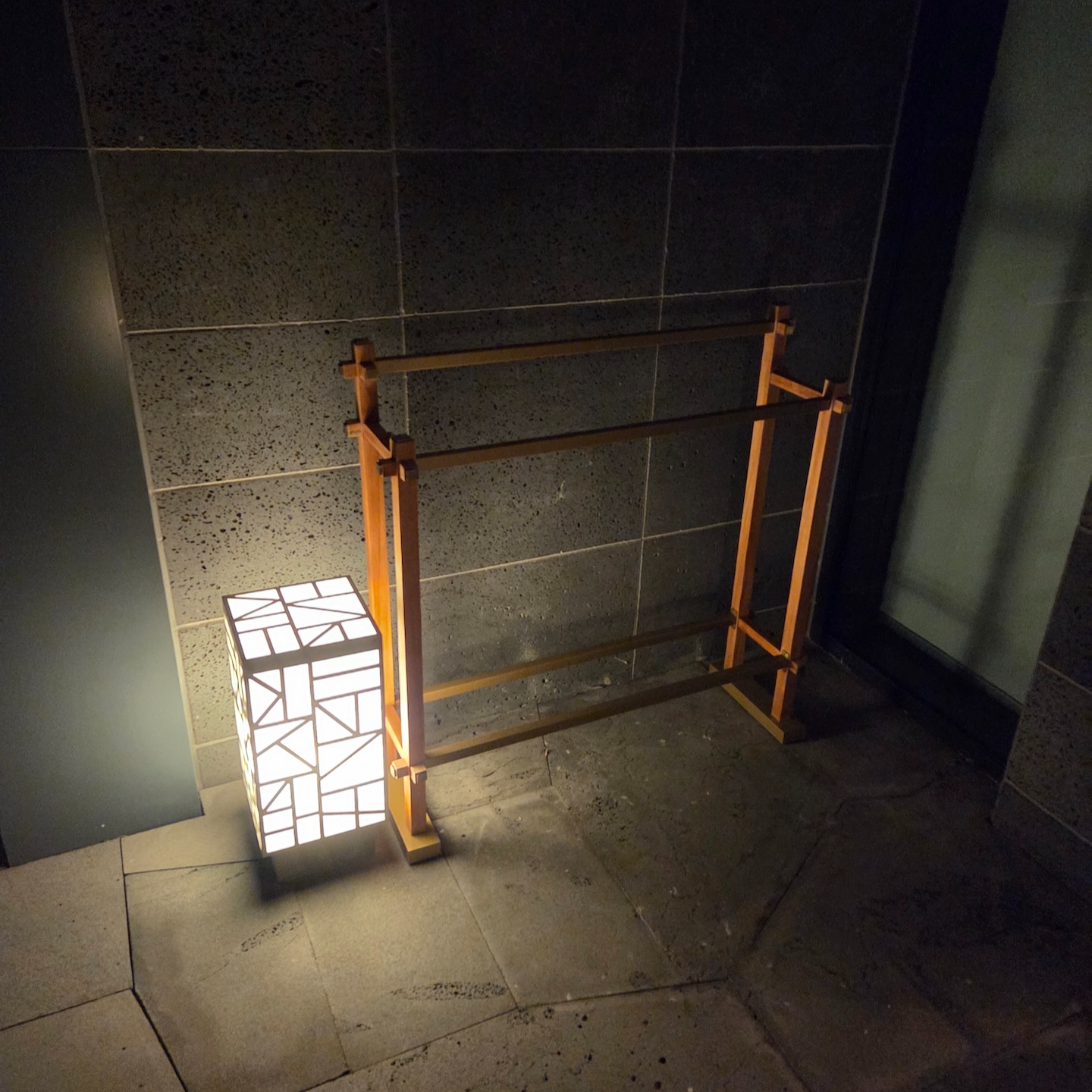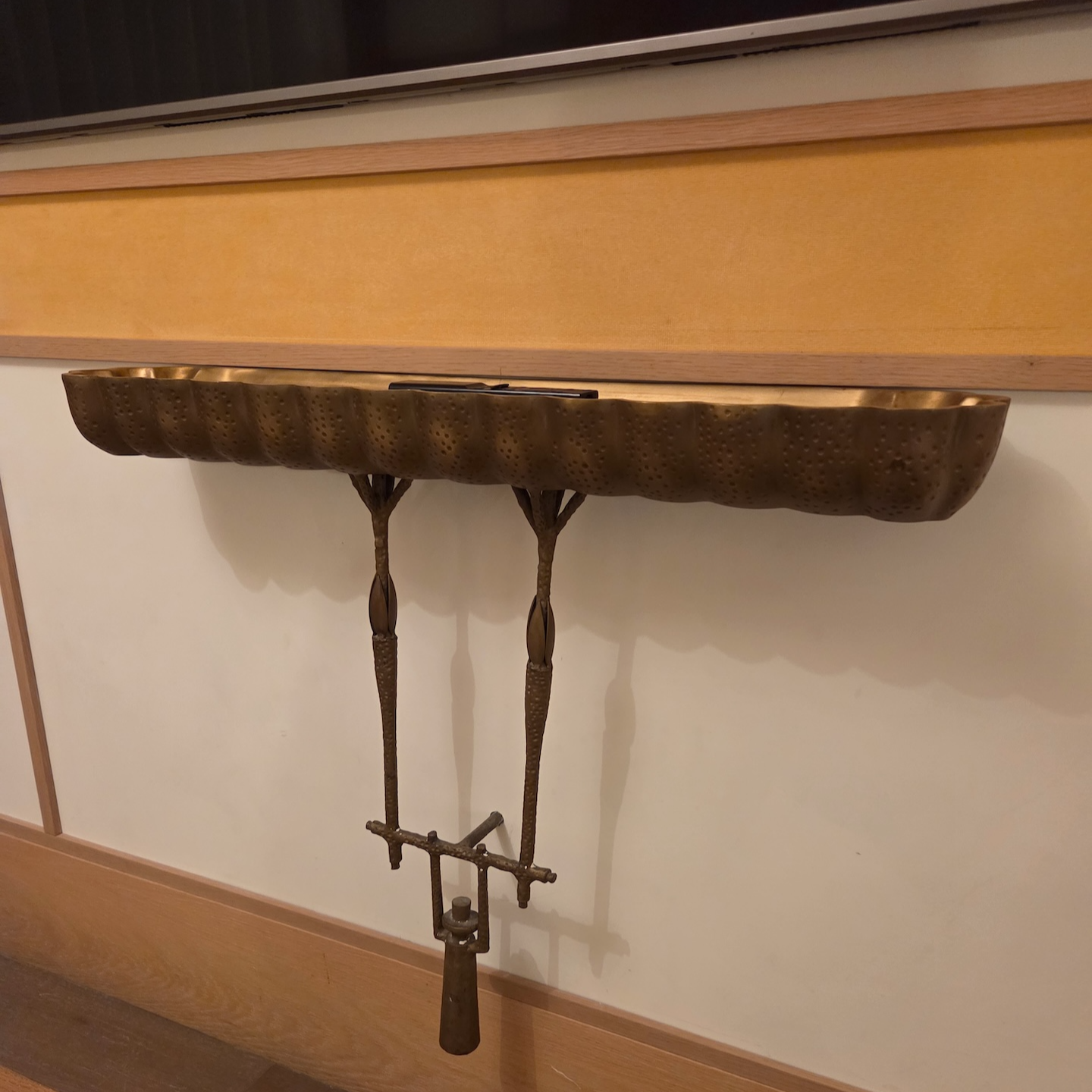 소파 앞 공간에는 TV가 설치되어 있는데, TV는 좌우 각도 조절이 가능한 마운트에 장착되어 있어 침대에서 시청할 때도 편한 각도로 조절할 수 있었습니다. 개인 기기와의 스크린 미러링도 가능해 호텔 와이파이에 연결한 뒤 TV에 표시된 QR 코드를 통해 간단하게 영상 재생이 가능했습니다. TV 아래에는 작은 콘솔 테이블이 놓여 있었는데, 옛 호롱대를 연상시키는 디자인이 인상적이었습니다.