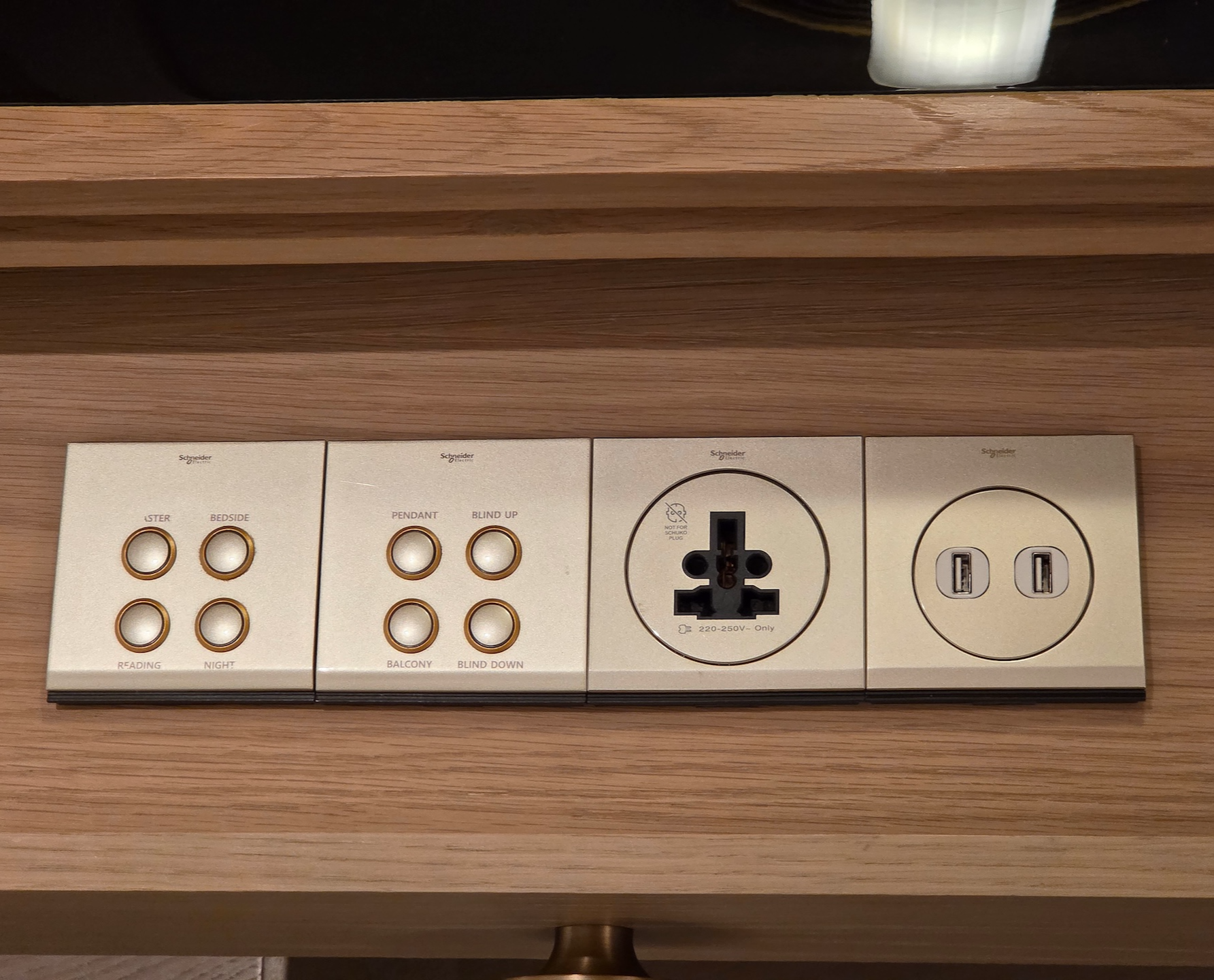 침대 양옆에는 밝은 우드로 마감된 사이드 테이블이 있고, 테이블 탑은 검정색 돌 소재가 사용되어 묵직한 대비감을 줍니다. 사이드 테이블의 서랍 대신에는 룸 내부의 조명을 조절할 수 있는 컨트롤 패널이 설치되어 있는데요, 침대 왼쪽에는 룸 전체 조명을 제어할 수 있는 버튼들이 모여 있고, 오른쪽에는 상대적으로 기본적인 조명만 조절할 수 있는 버튼이 배치되어 있습니다. 조명 스위치 옆에는 어떤 타입의 플러그도 사용할 수 있는 멀티 콘센트가 설치되어 있으며, JW 메리어트 제주 객실의 모든 콘센트는 별도의 어댑터 없이도 220V 프리볼트 제품을 바로 사용할 수 있도록 설계되어 있습니다. 또한 콘센트 옆에는 USB-A 포트 2개가 마련되어 있어 케이블만으로 충전이 가능했습니다. 침대 오른쪽 사이드 테이블 탑에는 무선 충전 패드가 설치되어 있었고, 침대 왼쪽 테이블 위에는 무선 충전 기능을 지원하는 알람시계와 노트패드, 전화기가 놓여 있었습니다.