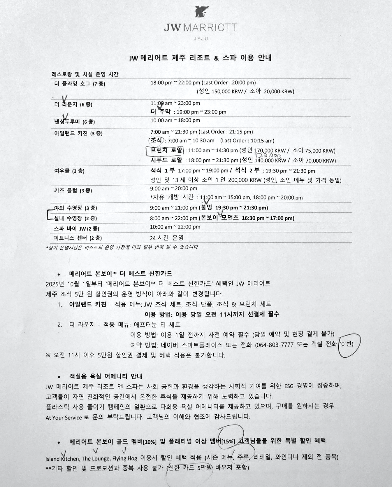저는 이번에 JW 메리어트 제주 리조트 & 스파에 투숙할 당시 플래티넘 엘리트 등급이었고, 이에 따라 프리미엄 킹 가든룸으로 업그레이드, 2인 무료 조식, 아일랜드 키친 및 더 라운지 이용 시 15% 할인 혜택을 받았습니다. JW 메리어트 제주 리조트 & 스파는 별도의 이그제큐티브 라운지가 없기 때문에 라운지 이용 혜택은 해당되지 않았고, 체크아웃 당일에는 일찍 호텔을 떠날 예정이라 레이트 체크아웃도 따로 신청하지 않았습니다. (참고로 JW 메리어트 제주 리조트 & 스파는 ‘리조트’로 분류되기 때문에 오후 4시 레이트 체크아웃이 항상 보장되지는 않습니다.) 또한 50박/75박 달성 시 받을 수 있는 NUA(업그레이드 어워드)를 사용해 스위트 업그레이드도 신청해 봤지만, 연말 성수기라 그런지 스위트 업그레이드는 가능하지 않았습니다