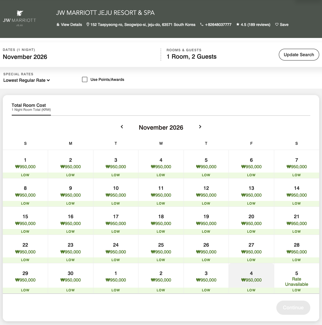 JW 메리어트 제주 리조트 & 스파의 포인트 투숙 최저가 (c) marriott.com