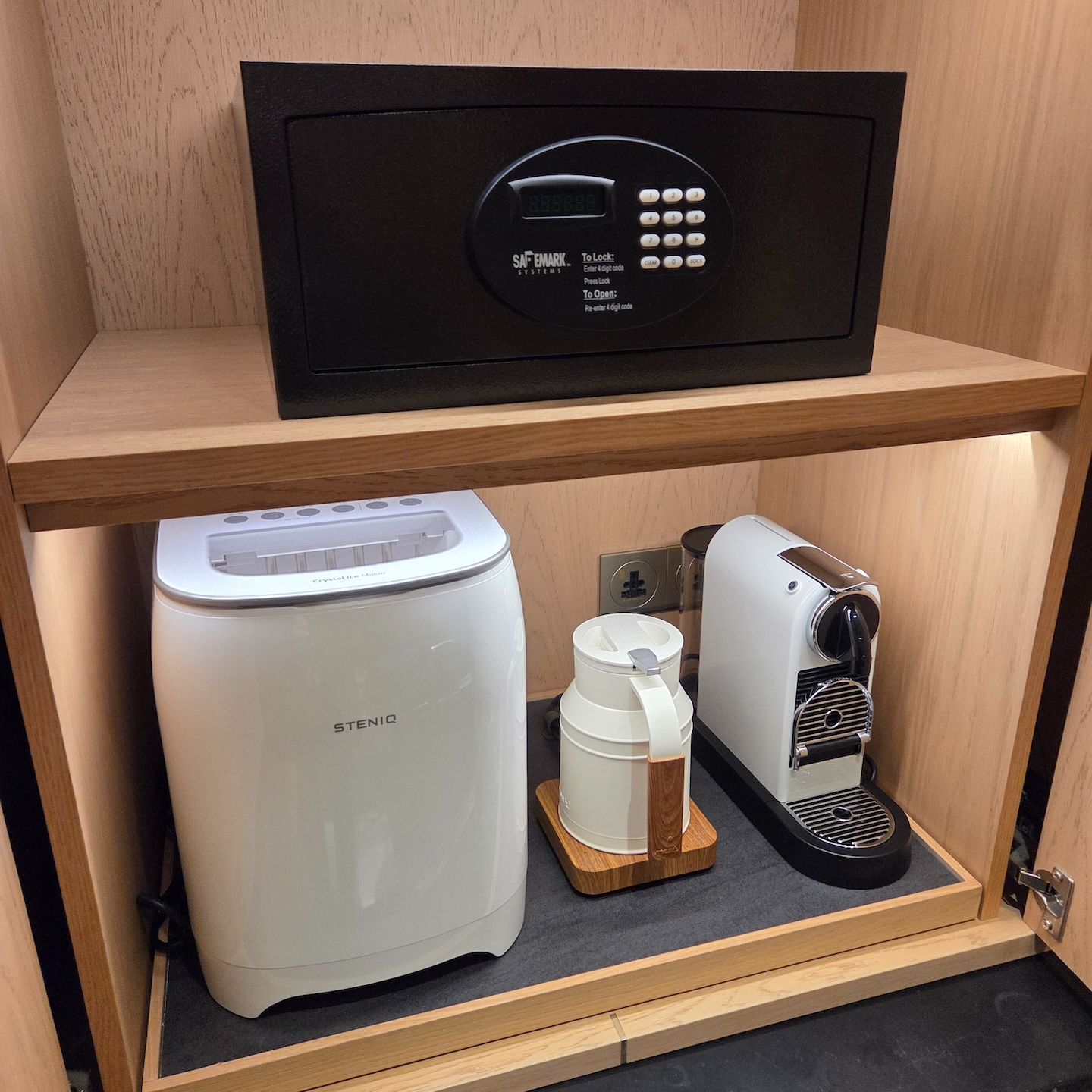 JW 메리어트 제주 리조트 & 스파의 커피 스테이션과 미니바 역시 매우 만족스러웠습니다. 커피는 네스프레소 머신이 준비되어 있었고, 캡슐은 JW 메리어트 제주 리조트 & 스파에서 직접 만든 카페인(볼루토)과 디카페인(볼루토 디카페나토)이 각각 3개씩, 총 6개가 제공되었습니다. 차 역시 자체 제작한 제주 브렉퍼스트, 제주 얼그레이, 제주 녹차, 제주 귤꽃차가 각각 1개씩 총 4종이 준비되어 있었으며, 차나 커피에 넣을 수 있는 설탕과 스위트너, 프렌치 바닐라 크리머도 함께 비치되어 있었습니다. 머그컵은 커피용 작은 컵 2개, 티용 큰 컵 2개가 준비되어 있었는데, 거친 도자기 질감의 디자인이 JW 메리어트 제주 리조트 & 스파의 디자인 요소 중 하나인 제주 현무암과 비슷한 결을 가지고 있어 인상적이었습니다. 여기에 검정색과 노란색 가죽 코스터 역시 객실 전체 디자인과 잘 어울렸습니다. 네스프레소 머신과 함께 전기주전자도 준비되어 있었고, 객실 내에 기본으로 얼음 메이커가 있다는 점도 꽤 특색 있게 느껴졌습니다.