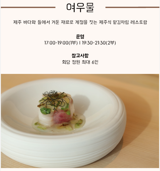 여우물은 오마카세(맡김차림) 식당으로, 연휴를 제외하고 목요일·금요일·토요일·일요일·월요일에 운영합니다. 시간은 오후 5시와 오후 7시 30분 두 타임이며, 각 타임은 6명 정원으로 운영됩니다. 1인당 가격은 200,000원이고, 과거에는 메리어트 본보이 플래티넘 이상 회원만 이용할 수 있었으나 현재는 플래티넘 회원이 아니더라도 이용할 수 있습니다.