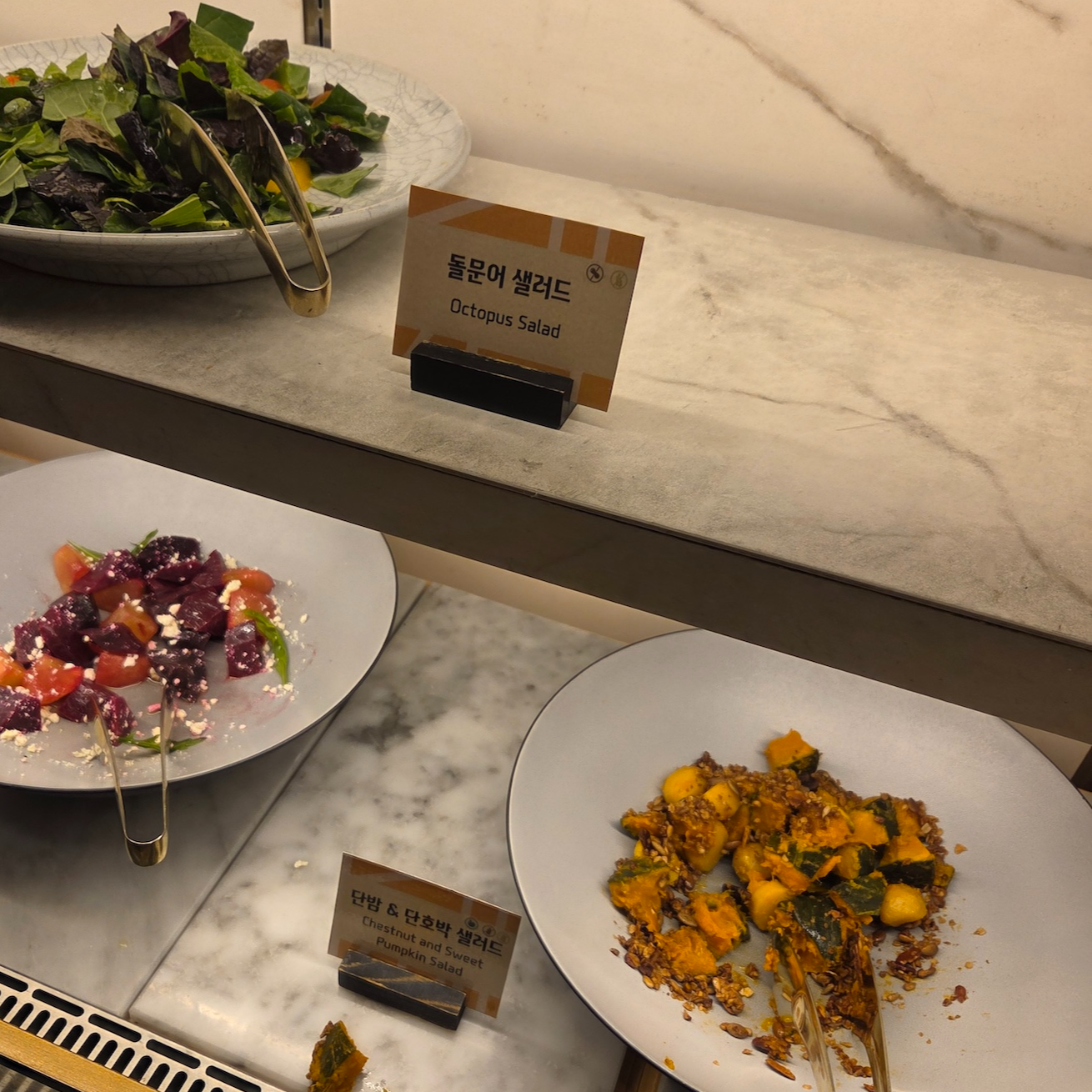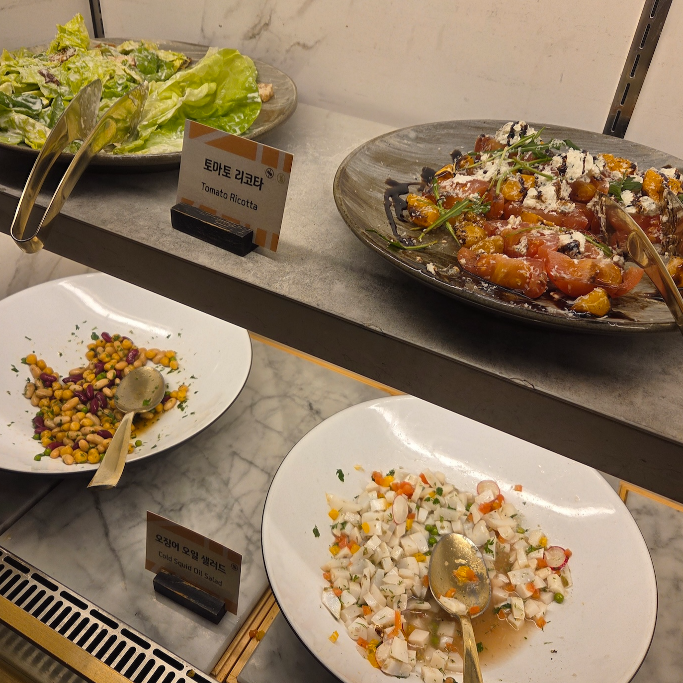 샐러드는 토마토 리코타 샐러드, 오징어 오일 샐러드, 돌문어 샐러드, 단밤 & 단호박 샐러드, 제주 비트 & 사과 샐러드, 시트러스 샐러드, 독일식 감자 샐러드 등이 있었고, 콜드 푸드로는 제철 회무침, 햇곶감 샐러드, 대정 마농 육회, 소고기 양지 무침, 꼬막무침, 간장게장 등이 준비되어 있었습니다.