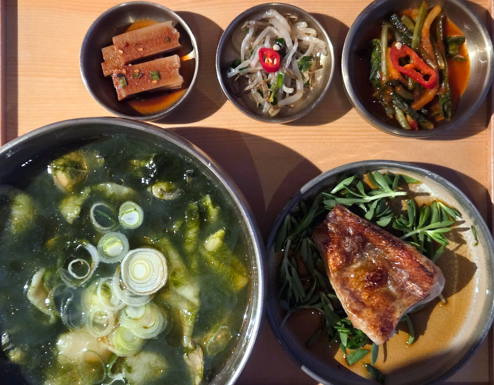 마지막 날에는 매생이 굴 수제비를 선택했습니다. 매생이와 알이 큰 굴이 넉넉히 들어가 있어 바다의 시원한 감칠맛이 인상적인 메뉴였고, 전날 과음을 했다면 아침 메뉴 중 해장으로 가장 잘 어울릴 것 같다는 생각이 들었습니다. 함께 나온 볼락 구이는 겉은 바삭하고 속은 촉촉하게 잘 구워졌고, 볼락 특유의 고소한 기름 맛이 살아 있었습니다. 돈나물과 간장 베이스 소스와 함께 먹으면 특히 잘 어울렸고, 도토리묵은 탱글한 식감과 은은한 쌉쌀함이 간장 소스와 잘 어울렸습니다. 숙주나물 역시 첫날과 마찬가지로 아삭하면서 간이 세지 않아 좋았습니다.