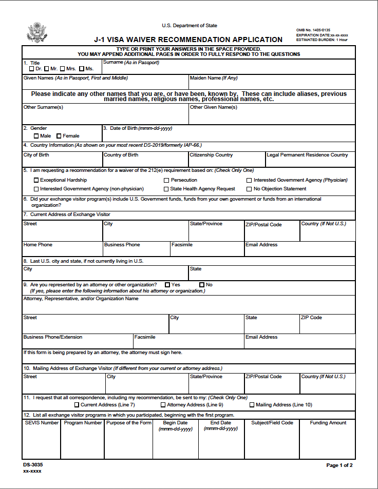 J1 웨이버를 신청하기 위해 가장 먼저 작성해야 하는 서류는 Form DS-3035입니다. 이 서류는 미 국무부 J1 웨이버 신청 사이트(https://j1visawaiverrecommendation.state.gov/)에서 작성할 수 있으며 Online Application을 모두 작성하면 최종 단계에서 본인의 DS-3035 Packet을 다운로드 받을 수 있습니다. 해당 사이트를 통한 온라인 제출은 불가능하며 무조건 우편으로 DS-3035와 필요 서류들을 Packet에 나와있는 주소로 발송해야 합니다.