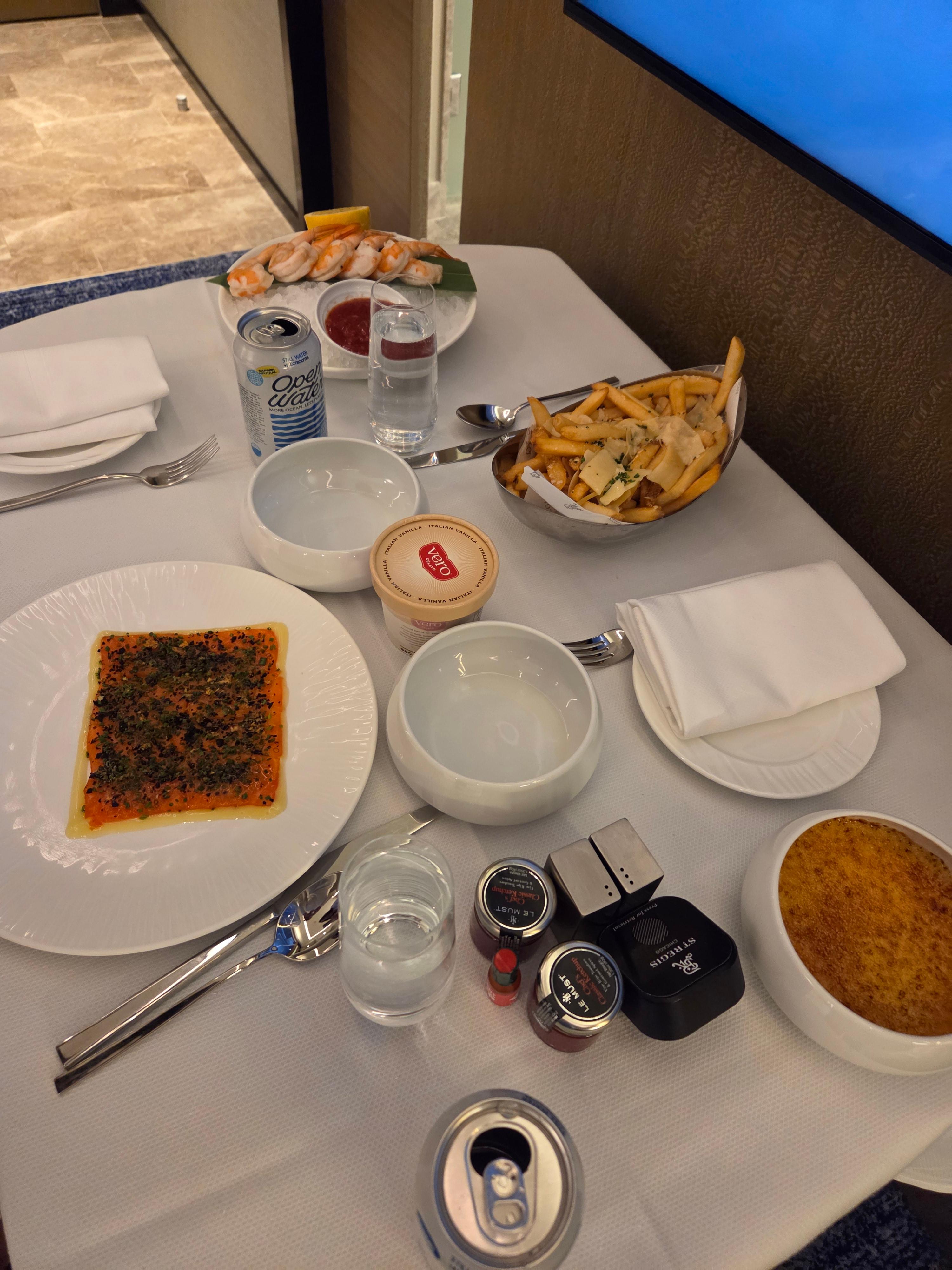 세인트 레지스 시카고에서 인룸 다이닝도 이용했습니다. 세인트 레지스 시카고에서는 인룸다이닝이나 룸서비스라는 이름이 아닌 프라이빗 다이닝이란 이름으로 해당 서비스를 제공합니다. 저는 가볍게 먹을 메뉴 몇 개를 시켜봤습니다. 가장 먼저 왕연어 & 트러플 크루도를 시켰는데요, 크루도는 날것이라는 이탈리아어로 왕연어 & 트러플 크루도는 연어회에 블랙 트러플, 건조 미소, 유자 올리브유 등을 곁들여 먹는 음식이었습니다. 이 음식이 꽤나 맛있었는데요, 연어 특유의 향이 건조 미소의 약간은 은은하면서도 쿰쿰한 맛과 잘 어우러졌고, 쪽파가 쿰쿰한 맛이 과하지 않게 잡아주고 마지막에 유자 올리브유의 상큼함으로 입을 가시는 느낌이었습니다. 다만, 블랙 트러플의 맛이나 향이 거의 나지 않는다는 점은 아쉬웠습니다. 그다음으로는 트러플 감자튀김을 먹었는데요, 약간은 포슬포슬한 느낌의 감자튀김으로 트러플향과 마지막에 올라간 치즈의 맛이 잘 어울렸습니다. 거기에 케첩은 단맛보다는 산미가 강조되는 맛으로 케첩을 찍어먹으면 케첩의 상큼함이 밸런스를 잘 잡아주는 맛이었습니다. 다만, 아무래도 인룸 다이닝이다 보니 감자튀김이 조금은 눅눅했다는 점이 아쉬웠습니다. 타이거 쉬림프의 경우 익힘 정도가 아주 좋아서 탱글 하면서도 새우 특유의 갑각류 감칠맛과 단맛이 잘 느껴졌습니다. 같이 온 칵테일소스도 단맛보다는 신맛과 매콤함이 두드려지는 맛이어서 새우와 잘 어울렸습니다. 시트러스 크렘 브륄레의 경우 시트러스의 맛이 상큼해서 질리지 않게 들어갈 수 있는 크렘 브륄레였고, 계란의 맛이 풍부하고 바닐라의 맛 또한 인위적이지 않은 자연스러운 맛이었습니다. 물론 위의 설탕 코팅도 바삭해서 식감을 더해주어서 좋았고요. 마지막으로는 바닐라 아이스크림을 먹었는데요, VERO라는 시카고 지역에 있는 아이스크림 가게인데 바닐라 향이 부담스럽지 않으면서도 단맛과 밸런스가 좋아서 제가 먹었던 바닐라 아이스크림 중에 참 맛있었던 바닐라 아이스크림 중 하나였습니다. 다만, 아무래도 아이스크림의 경우 디저트로 먹는 경우가 많은데 얼음이나 그런 방법 없이 종이용기에 담긴 아이스크림 하나만 달랑 나와 빨리 녹았다는 점이 아쉬웠습니다.