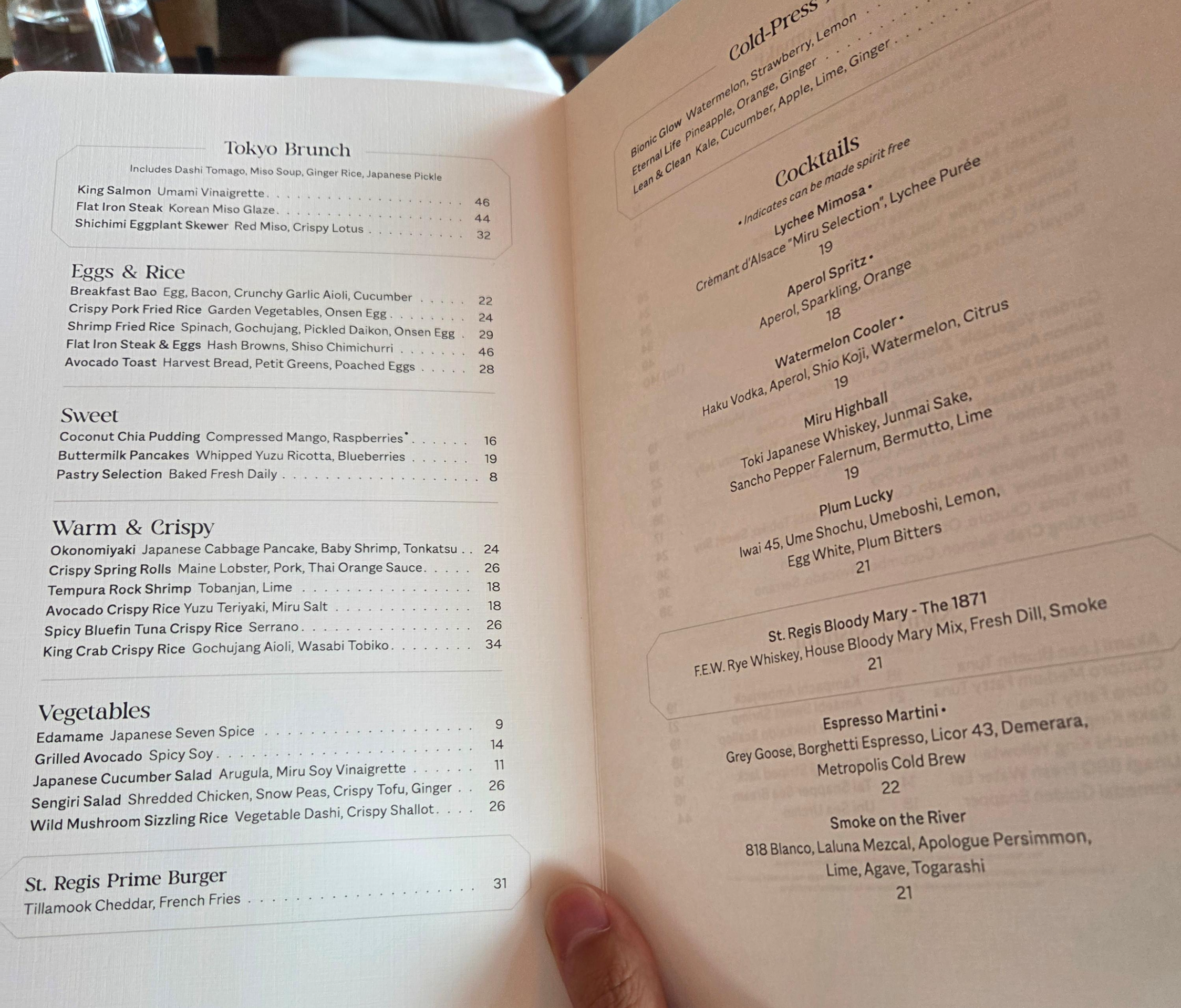 음료로는 기본적인 커피류와 냉압착즙한 주스가 있었습니다. 또한 조식 메뉴판임에도 다양한 칵테일이 있었다는 점이 약간은 재미있었습니다. 전반적으로 미국에서 먹을 수 있는 일본식 아침식사로는 훌륭했습니다. 46달러라는 가격이 조금 비싸기는 했지만 세인트 레지스 호텔이라는 특수성, 그리고 미국에서 먹는 일본식 아침식사라는 점을 생각했을 때, 다시 세인트 레지스 시카고에 방문하더라도 이 메뉴를 먹을 것 같습니다. 기본적인 웨스턴 메뉴의 경우 20대 초중반으로 엘리트 회원 혜택으로 받은 1인당 30달러의 조식 크레딧 사용을 위한 메뉴라는 느낌이 강했습니다. 하지만, 조금만 욕심을 부리면 금방 30달러가 넘어가기에, 무료로 아침을 먹는다라는 느낌보다는 돈을 조금 더 얹어서 맛있는 걸 먹겠다는 마음으로 조식당을 방문하는 게 마음이 조금 더 편할 듯싶습니다.