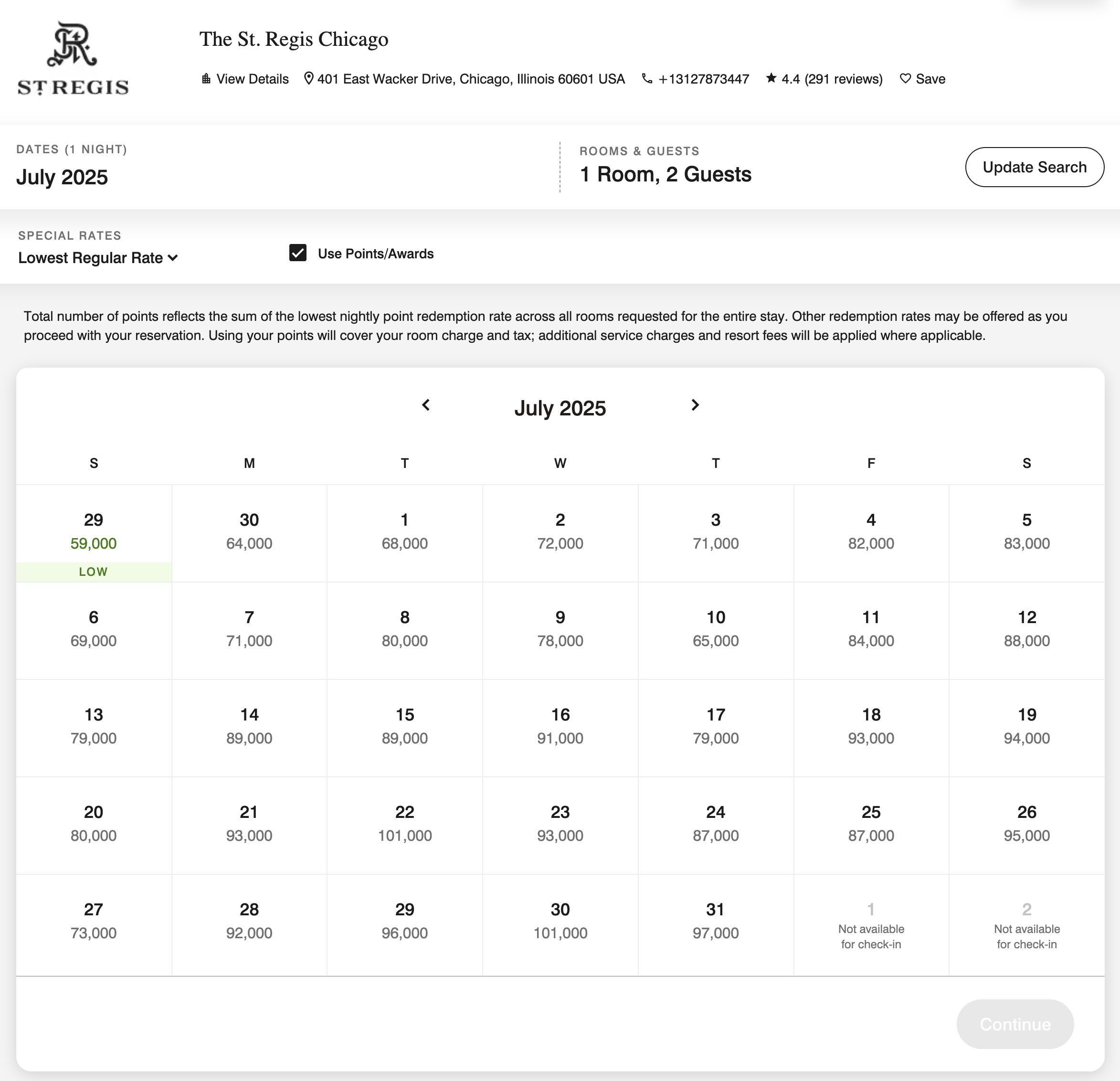저는 세인트 레지스 시카고의 가장 기본방인 1 킹 슈페리어 게스트룸을 메리어트 숙박권과 포인트를 이용해 예약을 했습니다. 가격은 9만 포인트로 8만 5천 포인트 숙박권에 5천 포인트를 더해서 예약을 했습니다. 세인트 레지스 시카고의 포인트 숙박의 경우 평균적으로 8만 ~ 10만 포인트 정도의 가격을 보여주고 있습니다. 일요일 체크인, 월요일 체크아웃이 가장 저렴해 때에 따라 5만 포인트 후반의 가격을 보여줄 때도 있으며, 그 외의 날들도 10만포인트가 넘어가는 경우는 많이 없다고 보시면 될 것 같습니다.
