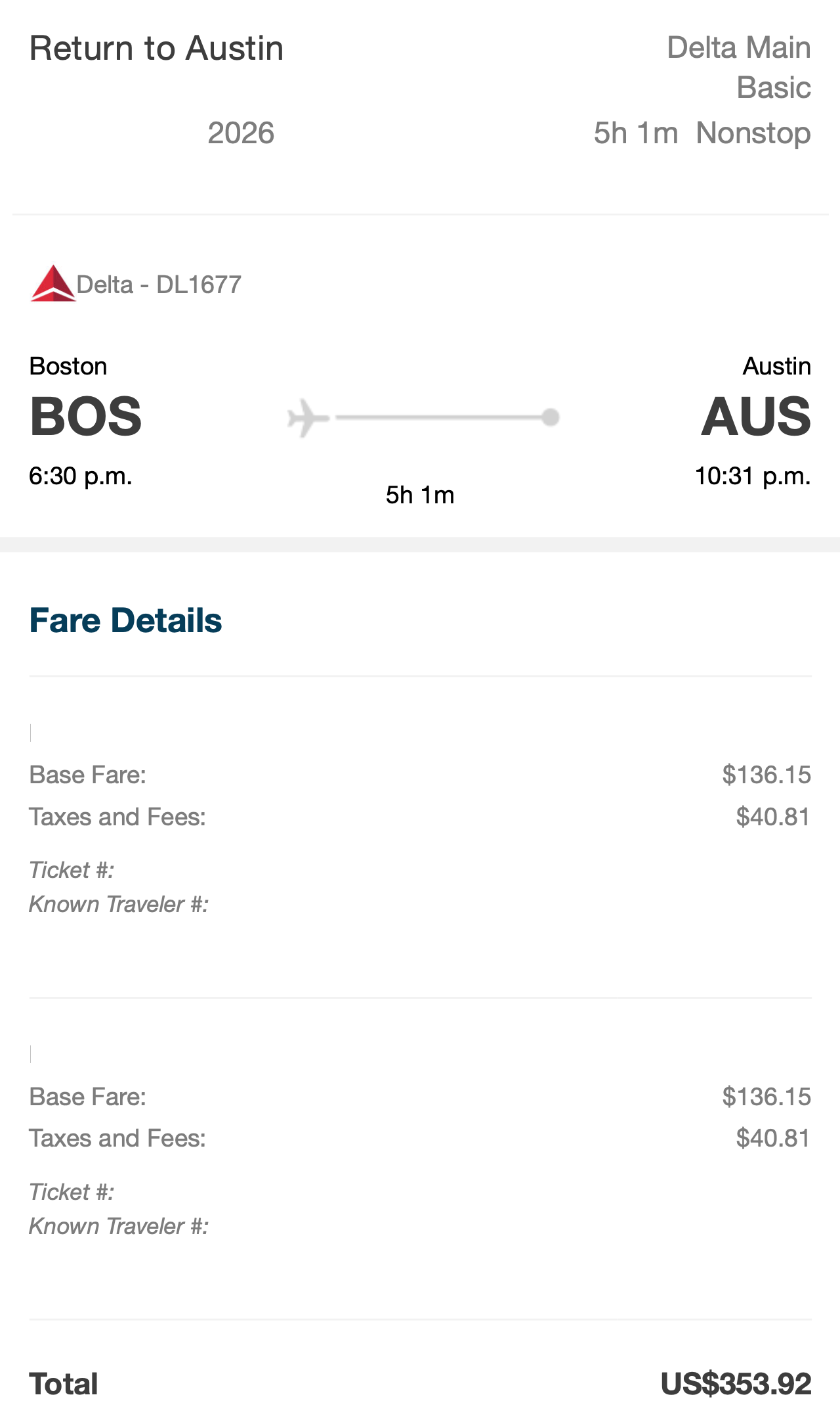 이번 오스틴 버그스트롬 국제공항에서 보스턴 로건 국제공항으로 가는 왕복 항공권은 델타 항공 공식 홈페이지가 아닌, 미국 카드사인 캐피탈 원에서 운영하는 ‘캐피탈 원 트래블’을 통해 예약했습니다. 이번 항공권은 델타항공의 가장 저렴한 상품인 ‘델타 메인 베이직’ 왕복 항공권으로 예약했으며, 기본 운임 $136.15에 세금 및 수수료 $40.81이 더해져 총 $176.96을 지불했습니다. 오스틴–보스턴 노선은 델타 항공, 젯블루, 사우스웨스트 항공이 모두 운항하고 있는데요, 이 중에서 오스틴에서 오전에 출발해 보스턴에 낮에 도착하고, 보스턴에서 저녁에 출발해 오스틴에 밤에 도착하는 효율적인 스케줄을 매일 안정적으로 제공하는 항공사는 델타 항공이 유일합니다. 일정 활용 측면에서 델타 항공의 경쟁력이 확실히 느껴지는 부분입니다. 이 노선은 계절에 따라 가격 편차도 큰 편입니다. 겨울에는 제가 구매한 것처럼 약 $180 수준의 비교적 저렴한 운임을 찾을 수 있는 반면, 봄과 가을에는 대체로 $250에서 $300 사이, 여름 성수기에는 메인 캐빈 베이직 기준으로도 왕복 $300에서 $350, 경우에 따라 $400에 근접하는 수준까지 올라가기도 합니다.