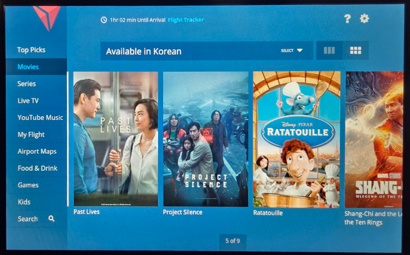 기내 엔터테인먼트는 델타 항공이 가장 강점을 보이는 부분 중 하나가 아닐까 싶습니다. 델타 항공의 대부분의 메인라인 항공기에는 개인용 기내 엔터테인먼트 스크린이 장착되어 있으며, 무료 와이파이도 함께 제공됩니다. 제가 탑승했던 A220-100 항공기 역시 개인용 스크린이 장착되어 있었기 때문에 약 4시간에 가까운 비행 시간 동안 지루함 없이 이동할 수 있었습니다. 기내 엔터테인먼트 시스템에는 다양한 영화와 TV 시리즈, 라이브 방송, 음악, 게임 등이 탑재되어 있었으며, 비행 경로를 확인할 수 있는 비행지도도 제공되었습니다. 한국 영화와 한국어 자막이 제공되는 콘텐츠도 일부 포함되어 있었고, 델타 항공 관련 정보나 공항 안내 정보도 확인할 수 있었습니다. 다만 모든 공항의 정보가 제공되는 것은 아니었는데, 개인적으로 흥미로웠던 점은 제가 탔던 항공기의 도착공항인 보스턴 로건 국제공항이 델타 항공의 주요 허브 공항임에도 불구하고 별도의 공항 지도가 제공되지 않았다는 점이었습니다.
