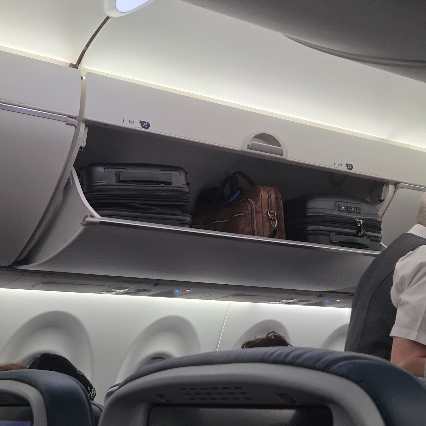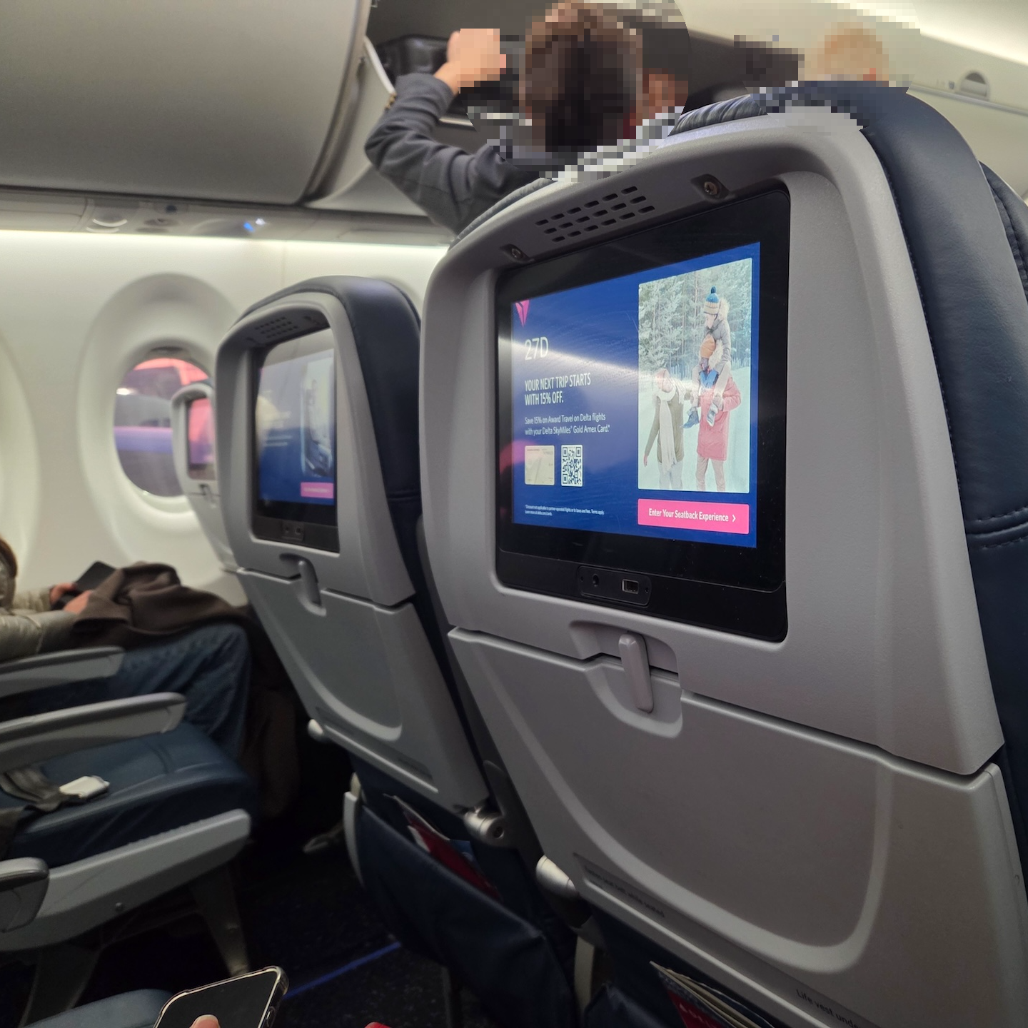 저는 델타 메인 베이직 운임으로 항공권을 발권했기 때문에 보딩 그룹 8을 배정받았습니다. 탑승 전에는 마지막 그룹이라 기내 수하물을 넣을 공간이 부족할까 걱정이 되었는데요, 생각보다 그룹 8 승객이 많았고 저는 그중에서도 비교적 빠르게 탑승한 편이어서 제 좌석 바로 위 오버헤드 빈에 수하물을 보관할 수 있었습니다. 실제로 제가 탑승한 이후에도 최소 15명 이상의 승객이 추가로 탑승했으며, 일부 승객들은 수하물을 넣을 공간이 없어 승무원들이 공간을 찾으러 여기저기 뒤지는 모습을 볼 수 있었습니다. 따라서 마지막 보딩 그룹에 속하더라도 미리 줄을 서서 같은 그룹 내에서도 빠르게 탑승하는 것이 오버헤드 빈 공간을 확보하는 데에 유리하다고 보시면 됩니다.