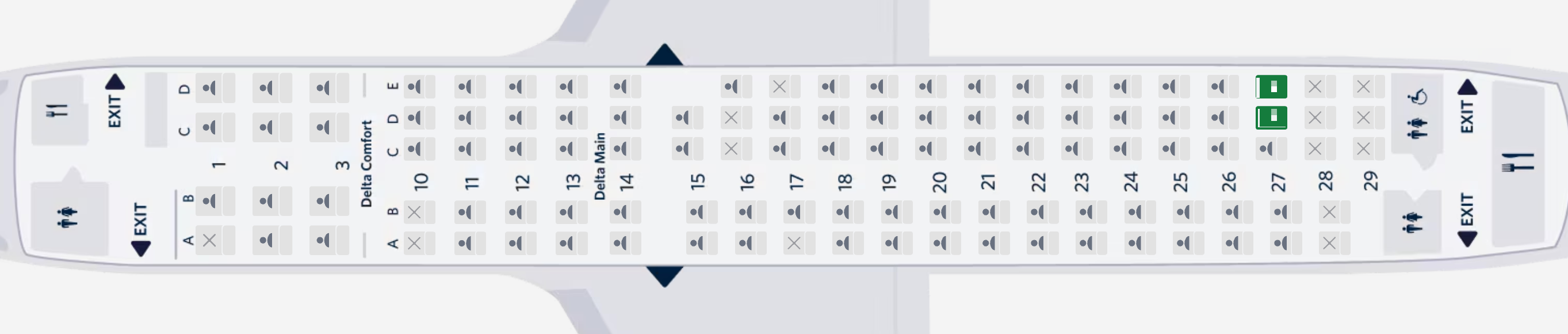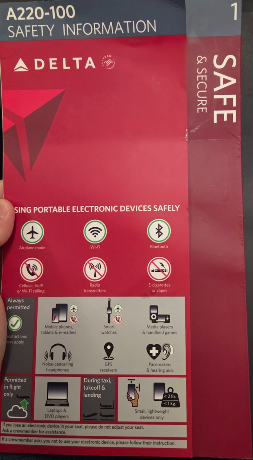 제가 이번에 탑승한 항공기는 델타 항공의 A220-100 항공기였습니다. 델타 항공의 A220-100은 일등석 12석, 이코노미 플러스 20석, 이코노미 77석으로 구성된 총 109석 규모의 비교적 작은 항공기입니다 A220-100은 통로가 1개인 협동체 항공기이지만, 우리가 흔히 볼 수 있는 B737 시리즈나 A320 시리즈와는 다른 특징이 하나 있습니다. 바로 좌석 배열이 2열–복도–3열 구조의 2-3 배열이라는 점입니다. 이 구조 덕분에 이코노미 클래스 좌석도 다른 협동체 항공기에 비해 좌우 폭이 넓고, 두 명이 함께 여행할 경우 창가와 복도 좌석에 나란히 앉을 수 있다는 장점이 있습니다