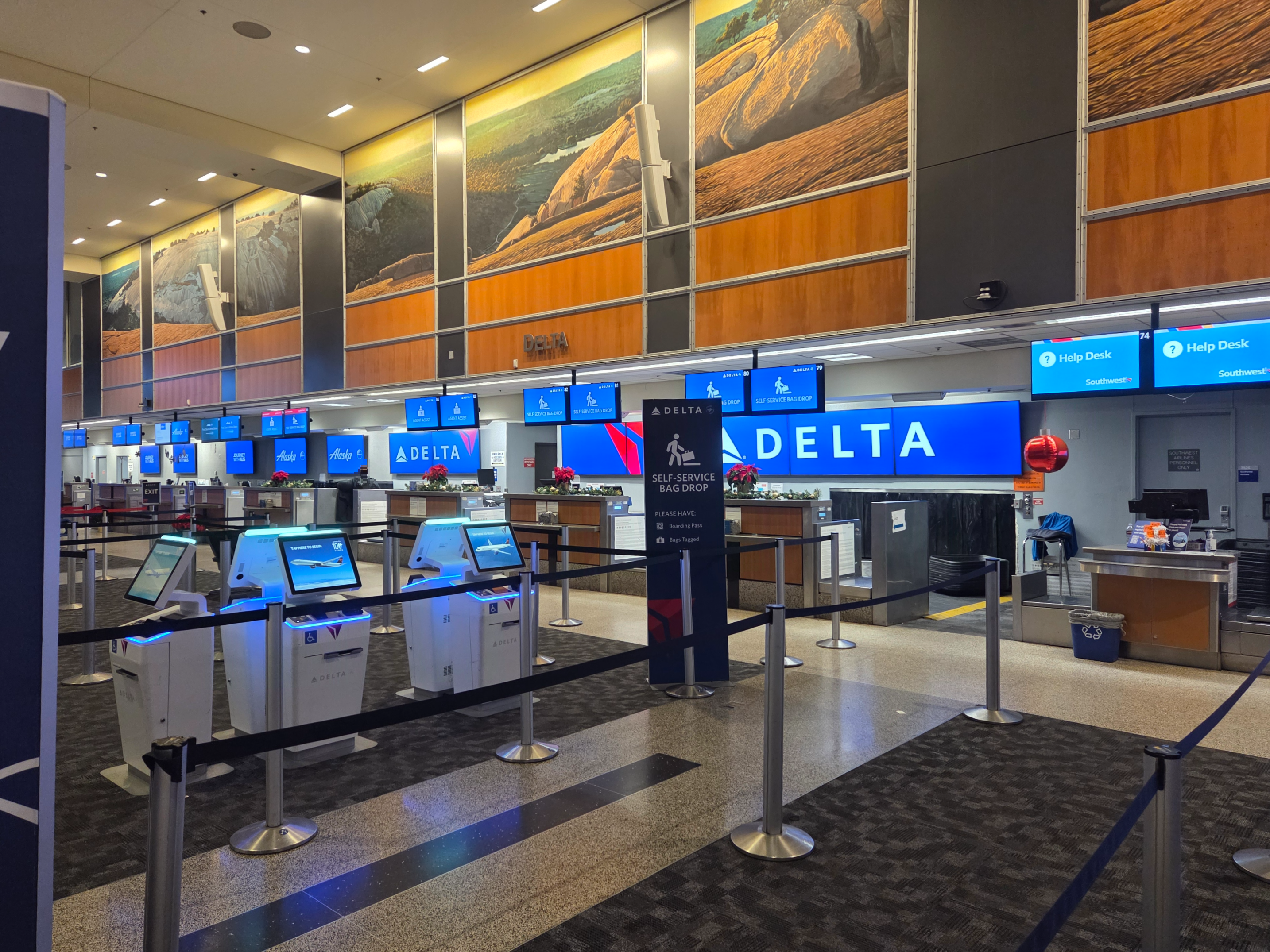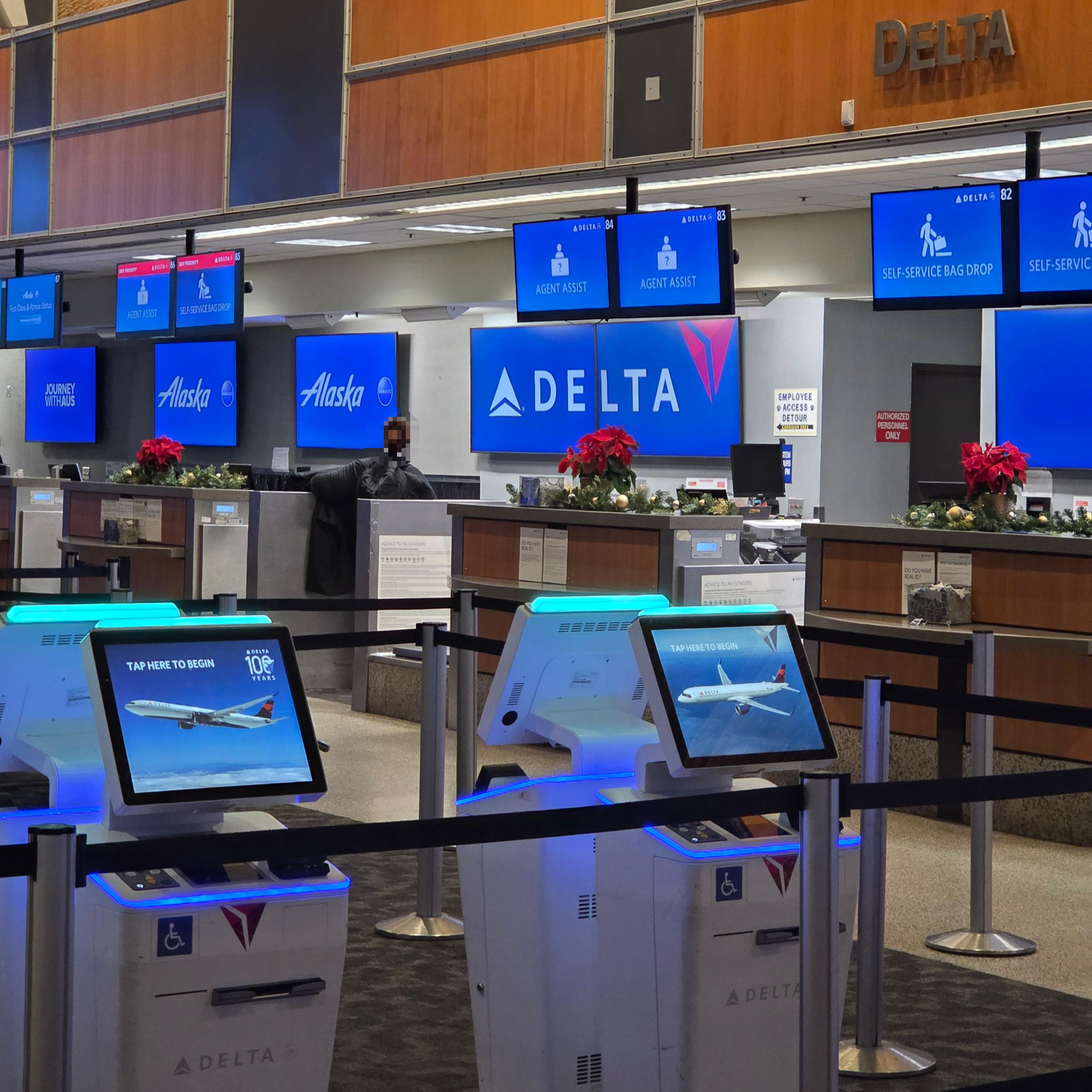 오스틴 버그스트롬 국제공항에서 델타 항공의 체크인 카운터는 동쪽, 터미널을 바라보고 왼쪽 방향에 위치해 있습니다. 출발층 출입구 중 C5 출입구와 가장 가까운 편이며, 카운터 오픈 시간은 오전 4시입니다. 승객은 위탁 수하물이 있는 경우 출발 45분 전까지 수하물을 맡겨야 하며, 수하물이 없는 경우 출발 30분 전까지 체크인을 마쳐야 합니다. 델타 항공은 오스틴 공항에서 국내선 일등석 탑승객과 스카이 프라이어리티 대상 고객을 위한 우선 체크인 카운터를 별도로 운영하고 있으며, 도움이 필요한 승객을 위한 전용 카운터도 함께 운영 중입니다. 이코노미 클래스(델타 메인, 델타 컴포트) 승객의 경우, 키오스크를 통해 백 태그를 출력한 후 직접 수하물에 부착하고 맡기는 셀프 백드롭 방식으로 운영됩니다. 저는 이번 탑승에서 별도의 위탁 수하물이 없었기 때문에 델타 항공 앱을 통해 출발 24시간 전부터 가능한 온라인 체크인을 진행했으며, 공항 도착 후에는 별도의 체크인 과정 없이 바로 보안 검색을 거쳐 에어사이드로 이동할 수 있었습니다.